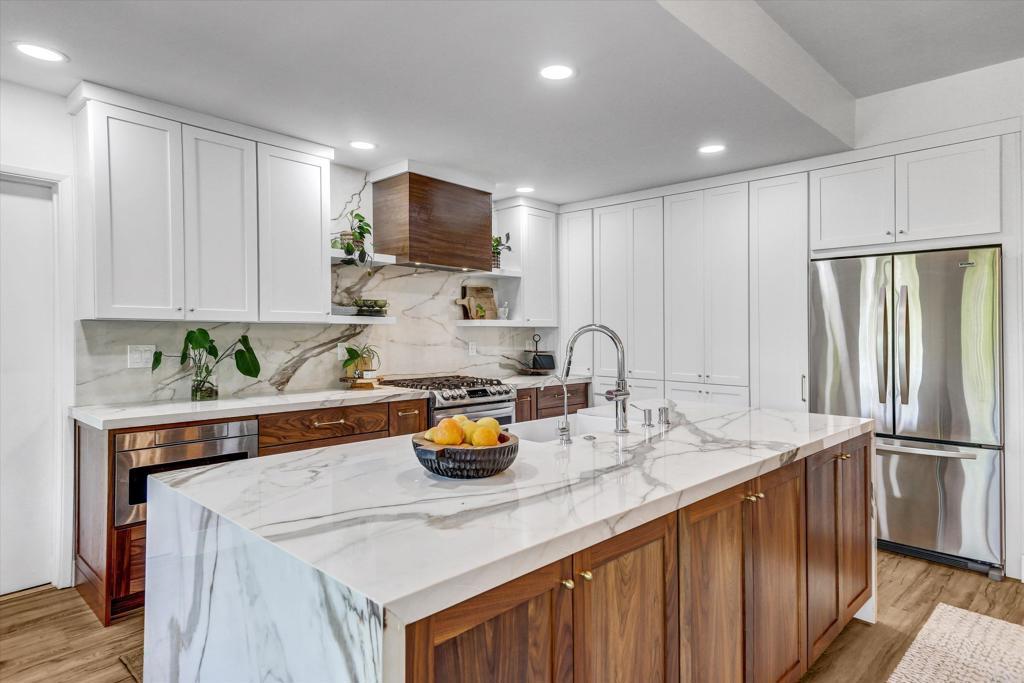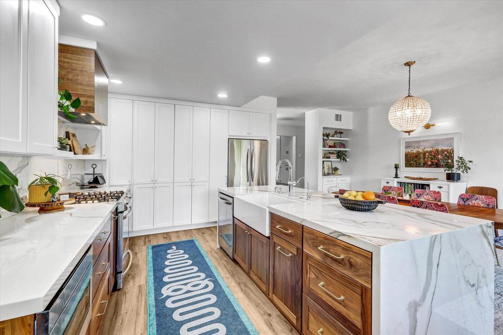 Space, privacy, and access—rarely do all three align like this in Horizon Hills. Tucked into the hillside enclave of Horizon Hills, this residence stands apart with an uncommon blend of privacy, scale, and accessibility. Set on a uniquely positioned lot with a private street behind, you’ll enjoy minimal neighboring exposure and a fully fenced yard designed for both relaxation and entertaining. Step inside and the home immediately opens up with vaulted ceilings, exposed beams, and expansive windows that flood the space with natural light. The layout is both open and intentional, offering distinct living and gathering areas anchored by a statement fireplace, while maintaining an effortless flow throughout. Thoughtfully updated interiors blend clean, modern finishes with moments of character—creating a home that feels both elevated and inviting. The kitchen is a true centerpiece, where bold design meets everyday functionality. A waterfall-edge island, custom solid wood walnut and oak cabinetry with sliding pull-outs, and full-height stone backsplash create a striking focal point, while the open connection to dining and living areas makes it ideal for hosting. Just beyond, sliding doors extend the living space outdoors to a private deck—perfect for morning coffee or evening wind-downs—seamlessly blending indoor and outdoor living. Outdoor spaces further elevate the experience with a tranquil fish pond, water fountain, dedicated yoga deck, and a gazebo creating a private retreat for relaxation or entertaining. A carport-shed combination off the rear street adds flexibility, while abundant garage storage supports everyday practicality. Two fireplaces anchor the living spaces with warmth and character, completing a home that balances thoughtful upgrades with a rare sense of space and privacy.