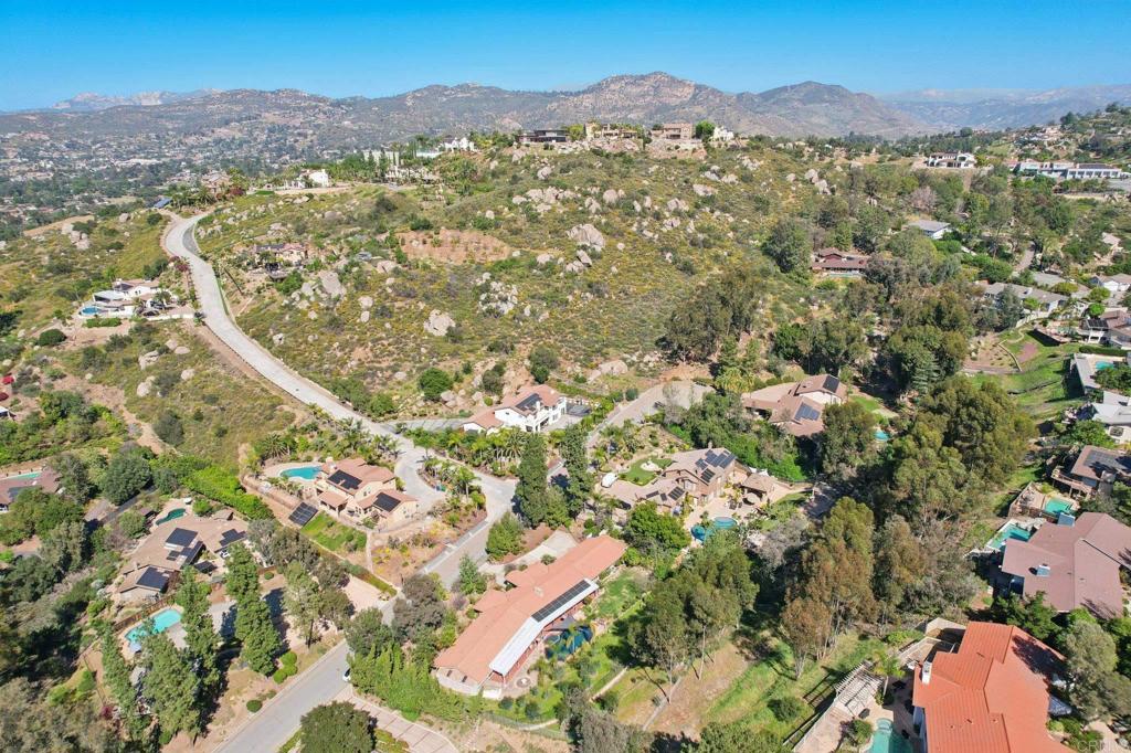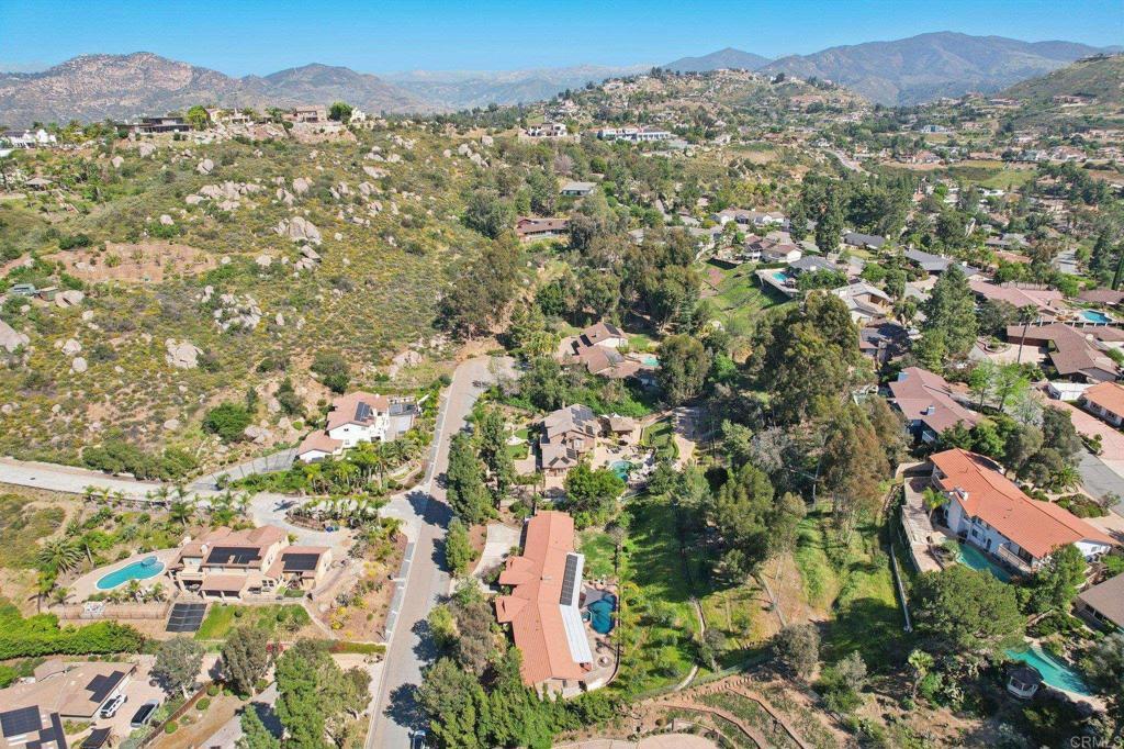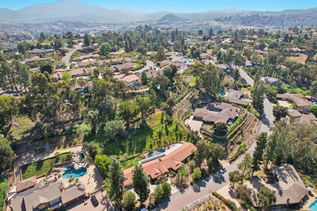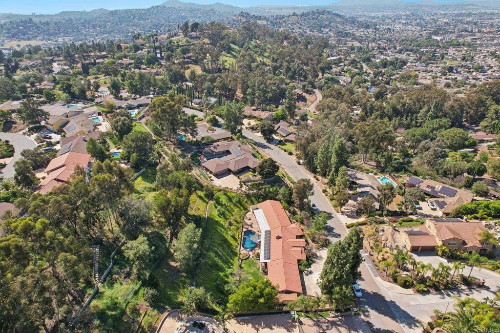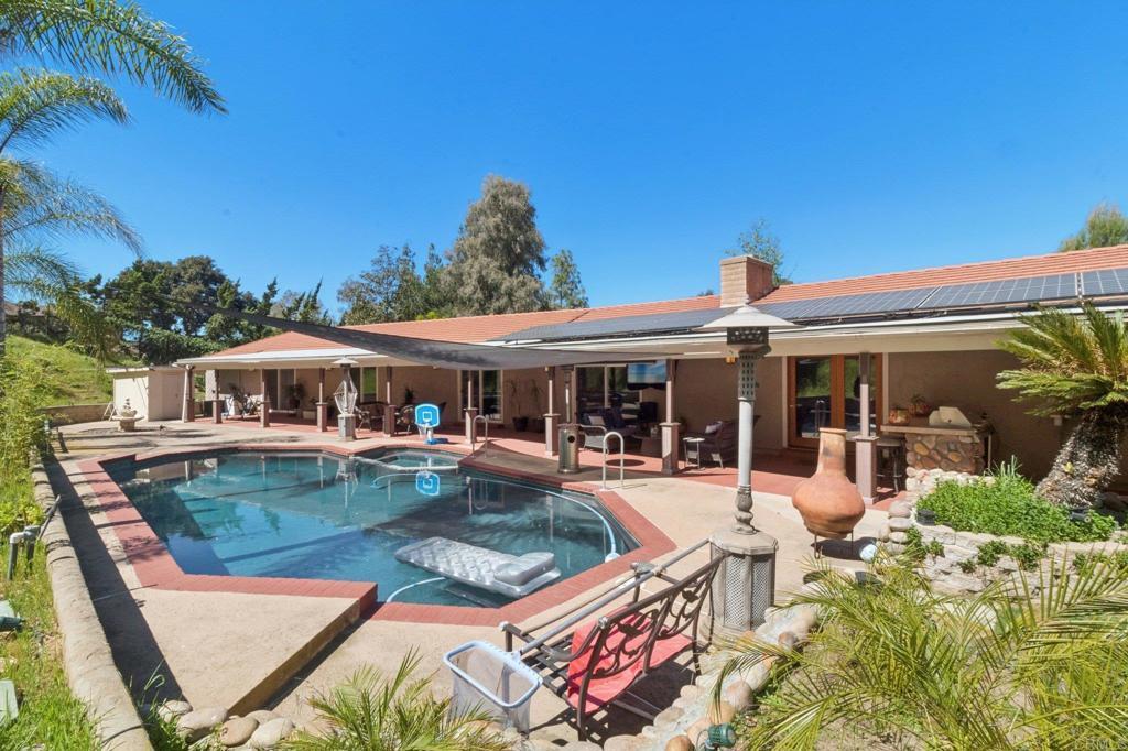 Welcome to Hidden Mesa Estates, where this beautifully maintained single-story, 4-bed, 3.5-bath, 3,292 sq ft home sits on an expansive 0.84-acre lot on a quiet and private cul-de-sac street, offering PAID solar, dual AC units, dual water heaters, full security with cameras, abundant storage, and resort-style outdoor living. As you arrive, a grand porte-cochère entrance welcomes you, supported by stone pillars and surrounded by lush landscaping, tropical foliage, and a tranquil pond that sets a serene tone before you even step inside. Double doors open into a bright, inviting interior featuring custom flooring and recessed lighting throughout, creating a warm, modern ambiance. Straight ahead, a dramatic double-sided stone fireplace anchors both the formal living room and the family room, serving as a stunning architectural centerpiece. To the right, the formal living room offers elegant seating and natural light. To the left, the family room provides a comfortable everyday gathering space with a TV area and a wet bar with wine fridge, flowing seamlessly into the kitchen. The chef’s kitchen features rich wood cabinetry, granite countertops, a five-burner cooktop, built-in ovens, pantry, and a breakfast nook overlooking the backyard. The open layout connects effortlessly to the family room and dining areas, making the home ideal for entertaining. A conveniently located half bath serves the main living areas, along with a nearby guest bathroom featuring a walk-in shower. Privately positioned on its own side of the home, the spacious primary suite offers direct patio access and a peaceful atmosphere. The suite includes a spa-style jetted soaking tub, a beautifully tiled walk-in shower, dual-sink granite vanity with ornate framed mirrors, a dedicated makeup/dressing vanity, and a large walk-in closet with custom storage. Down the long hallway are three additional bedrooms, two with walk-in closets and sliding glass doors to the backyard. These rooms share a thoughtfully designed hallway bathroom with two separate entrances; one with a full granite sink vanity, the other with a dedicated makeup/vanity station; along with a beautifully tiled tub/shower combo. A large hallway linen closet adds convenience and storage. Additional features include a spacious laundry room with cabinetry, an oversized 3-car garage with epoxy flooring and built-ins, two outdoor storage sheds, two AC units, two water heaters, and a full security system with cameras surrounding the property. Step outside to your private resort-style retreat featuring a sparkling swimming pool with shade sails, an attached spa, and an expansive covered patio with dining space, ceiling fans, outdoor heaters, and a mounted TV. A full built-in BBQ island with bar seating makes outdoor entertaining effortless. The grounds include a peaceful fountain, extensive rose gardens, and mature fruit trees including orange, lemon, peach, mandarin, loquat, prune, guava, plums, and more, all framed by wide open lawn areas and hillside views. Nestled in the prestigious Hidden Mesa Estates, this home offers exceptional privacy, comfort, and refined living; a truly special property in one of Rancho San Diego’s most desirable neighborhoods. See virtual tour.