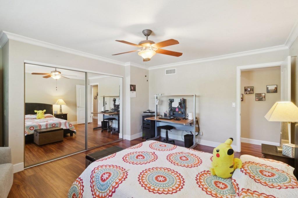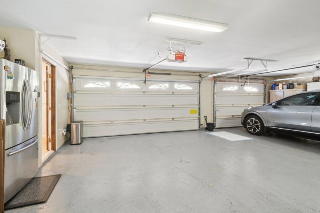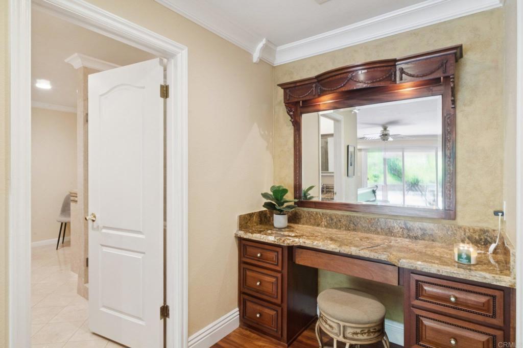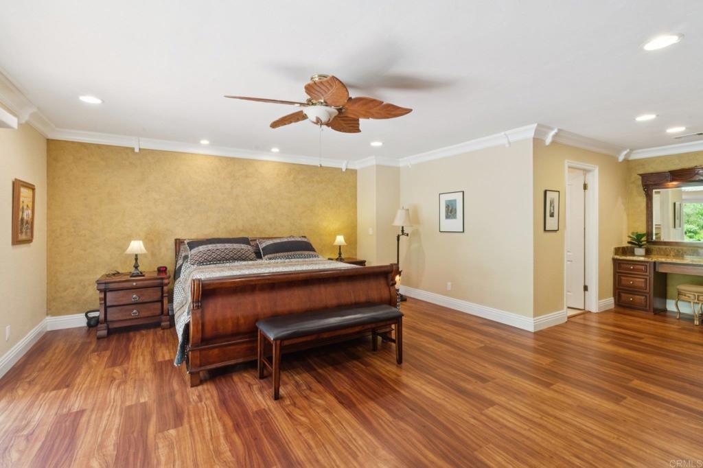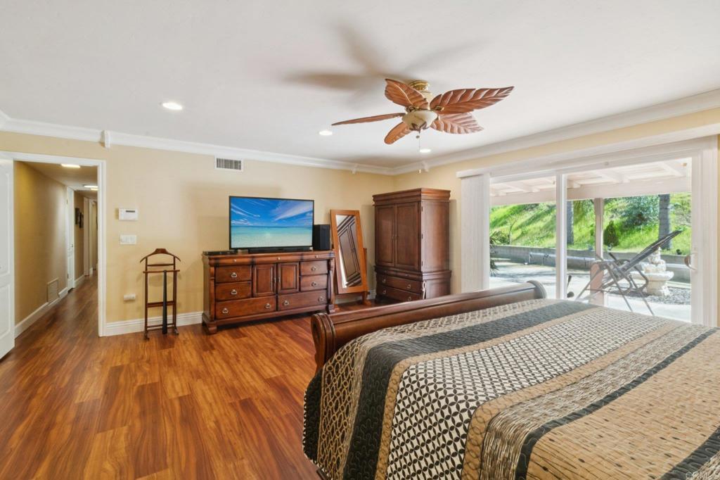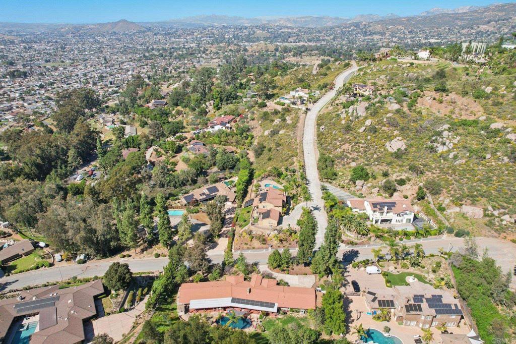 Welcome to Hidden Mesa Estates, where this beautifully maintained single-story, 4-bed, 3.5-bath, 3,292 sq ft home sits on an expansive 0.84-acre lot on a quiet and private cul-de-sac street, offering PAID solar, dual AC units, dual water heaters, full security with cameras, abundant storage, and resort-style outdoor living. As you arrive, a grand porte-cochère entrance welcomes you, supported by stone pillars and surrounded by lush landscaping, tropical foliage, and a tranquil pond that sets a serene tone before you even step inside. Double doors open into a bright, inviting interior featuring custom flooring and recessed lighting throughout, creating a warm, modern ambiance. Straight ahead, a dramatic double-sided stone fireplace anchors both the formal living room and the family room, serving as a stunning architectural centerpiece. To the right, the formal living room offers elegant seating and natural light. To the left, the family room provides a comfortable everyday gathering space with a TV area and a wet bar with wine fridge, flowing seamlessly into the kitchen. The chef’s kitchen features rich wood cabinetry, granite countertops, a five-burner cooktop, built-in ovens, pantry, and a breakfast nook overlooking the backyard. The open layout connects effortlessly to the family room and dining areas, making the home ideal for entertaining. A conveniently located half bath serves the main living areas, along with a nearby guest bathroom featuring a walk-in shower. Privately positioned on its own side of the home, the spacious primary suite offers direct patio access and a peaceful atmosphere. The suite includes a spa-style jetted soaking tub, a beautifully tiled walk-in shower, dual-sink granite vanity with ornate framed mirrors, a dedicated makeup/dressing vanity, and a large walk-in closet with custom storage. Down the long hallway are three additional bedrooms, two with walk-in closets and sliding glass doors to the backyard. These rooms share a thoughtfully designed hallway bathroom with two separate entrances; one with a full granite sink vanity, the other with a dedicated makeup/vanity station; along with a beautifully tiled tub/shower combo. A large hallway linen closet adds convenience and storage. Additional features include a spacious laundry room with cabinetry, an oversized 3-car garage with epoxy flooring and built-ins, two outdoor storage sheds, two AC units, two water heaters, and a full security system with cameras surrounding the property. Step outside to your private resort-style retreat featuring a sparkling swimming pool with shade sails, an attached spa, and an expansive covered patio with dining space, ceiling fans, outdoor heaters, and a mounted TV. A full built-in BBQ island with bar seating makes outdoor entertaining effortless. The grounds include a peaceful fountain, extensive rose gardens, and mature fruit trees including orange, lemon, peach, mandarin, loquat, prune, guava, plums, and more, all framed by wide open lawn areas and hillside views. Nestled in the prestigious Hidden Mesa Estates, this home offers exceptional privacy, comfort, and refined living; a truly special property in one of Rancho San Diego’s most desirable neighborhoods. See virtual tour.