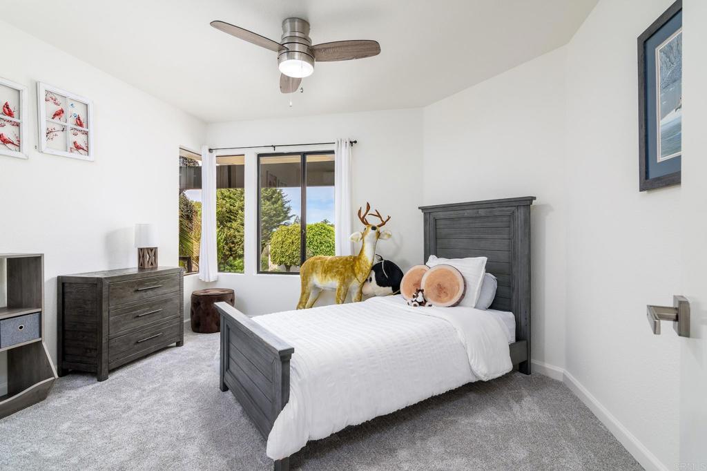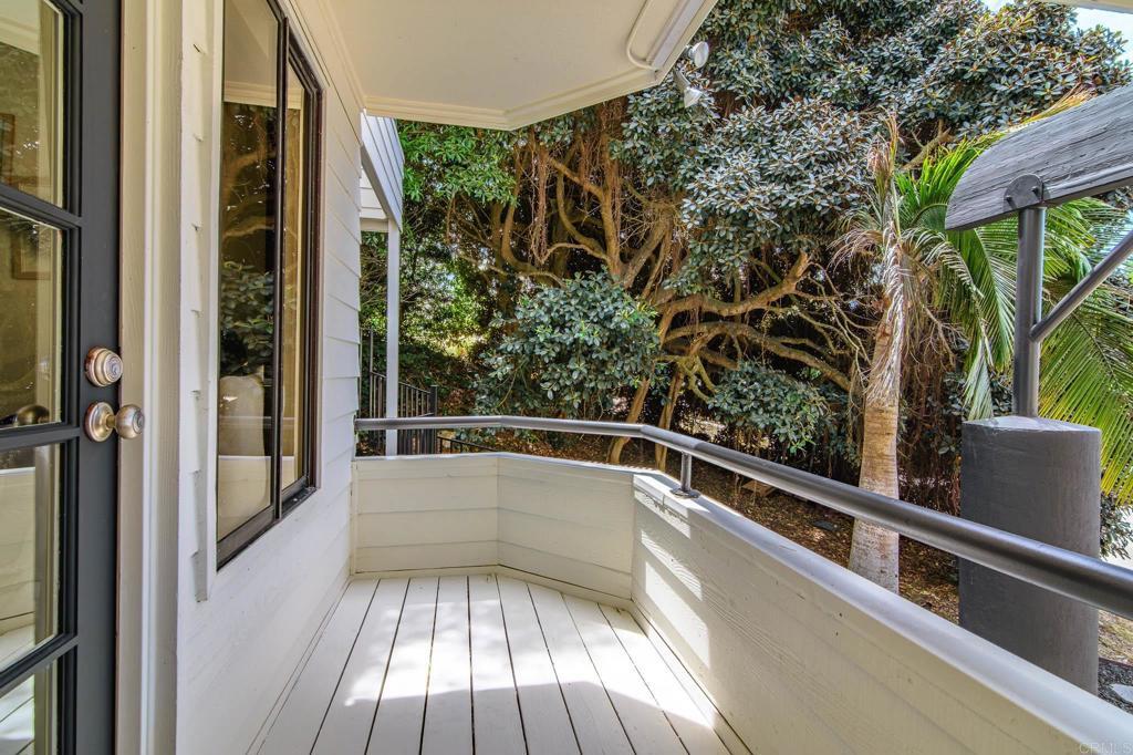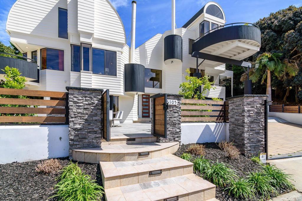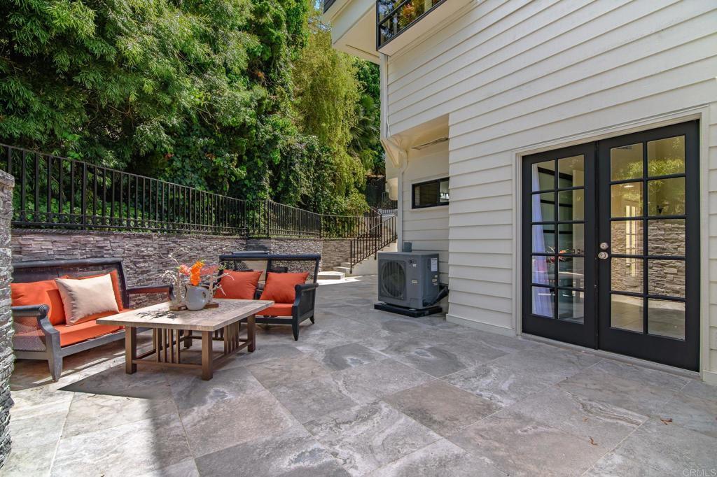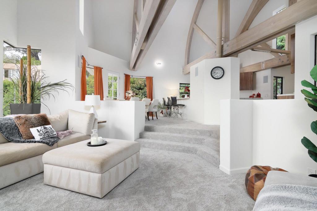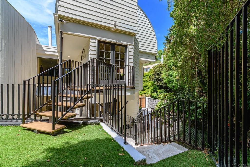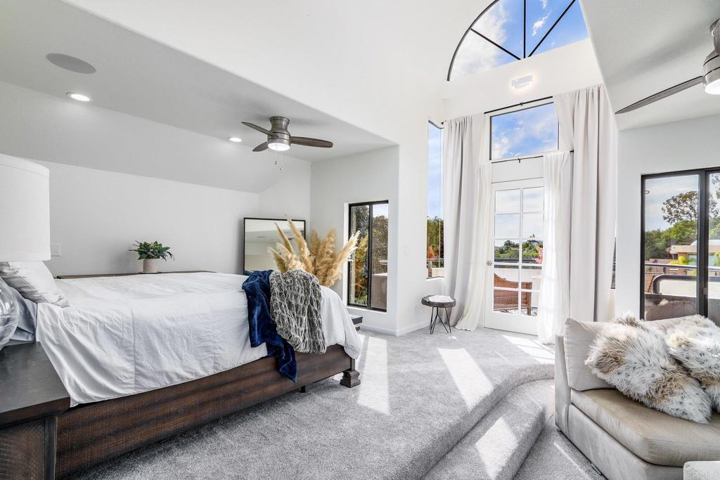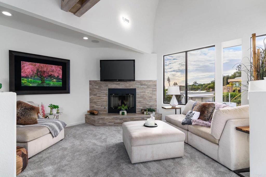 Designed by a renowned local architect, this contemporary home sits on a quiet Muirlands cul-de-sac with peek ocean views from multiple vantage points. Curved architecture and soaring cathedral ceilings with exposed wood beam trusses define the home's dramatic character. The main level features an open living and dining area anchored by a stacked stone fireplace, with French doors leading to one of several private balconies. The kitchen showcases walnut flat-panel cabinetry, a calacatta-style quartz waterfall island with cooktop, built-in wall oven, and an arched beam ceiling that mirrors the home's sculptural lines. The primary suite offers an elevated sleeping area, a second stacked stone fireplace, in-ceiling speakers, and balcony access with sunset views. The renovated primary bath includes dual sinks, a vanity area, and standalone shower. Three additional bedrooms and two renovated bathrooms with ample counter space round out the home. A lower level with its own private entrance features a second living area, wet bar, and flexible space to suit any lifestyle.Recent upgrades include a new roof, HVAC with multiple zoned controls, whole-home data wiring, Bose in-ceiling sound, Belgard hardscape, new deck and staircase, recessed lighting, new carpet, freshly painted inside and out, and epoxy-finished garage floors. Bold architecture paired with thoughtful, modern upgrades — this is La Jolla living at its finest, just minutes from world-class beaches, dining, and the Village.