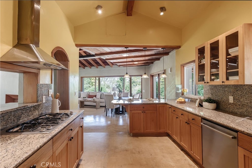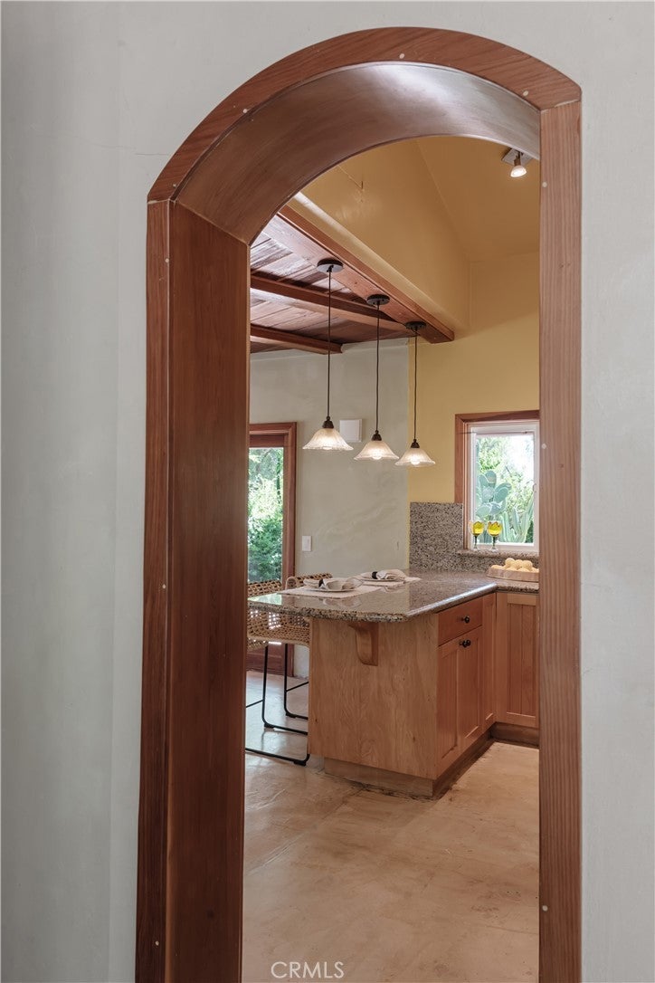 All Bedrooms Down, Attic, Beamed Ceilings, Bedroom on Main Level, Block Walls, Breakfast Bar, Cathedral Ceiling(s), Granite Counters, High Ceilings, Main Level Primary, Primary Suite, Separate/Formal Dining Room, Track Lighting, Wood Product Walls