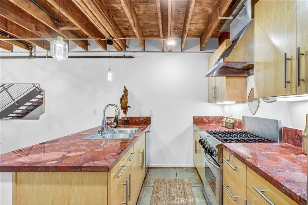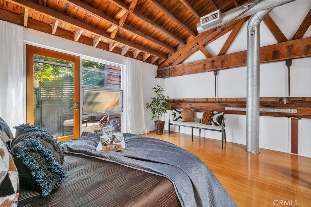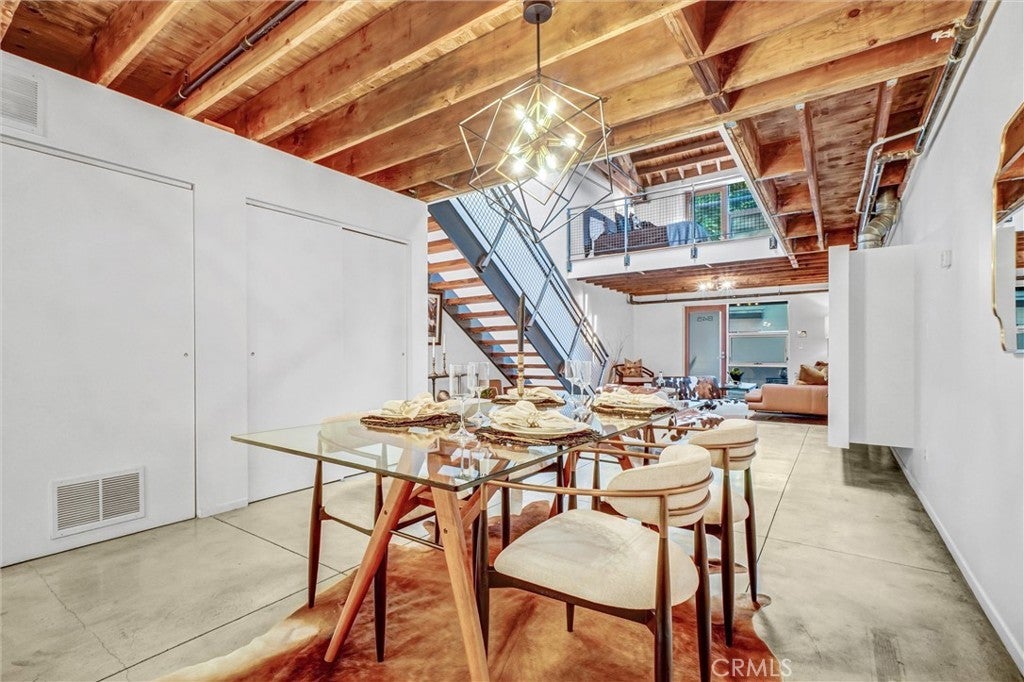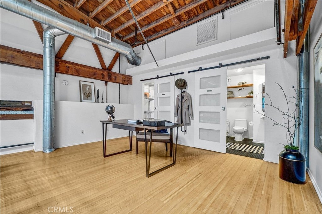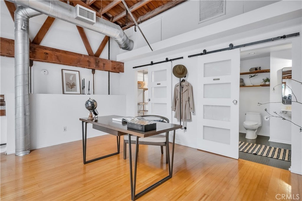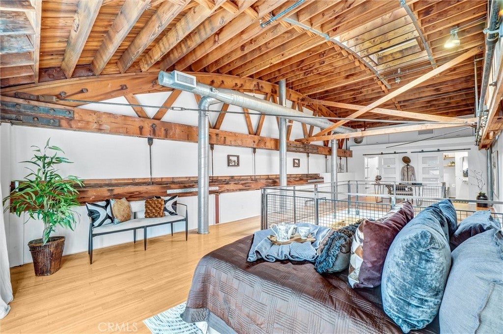 Architectural Loft Living in the Heart of Downtown Long Beach. Welcome to Courtyard Lofts, an award-winning development designed by renowned local architecture firm Studio One Eleven. This boutique community features 16 industrial-style lofts thoughtfully arranged around a tranquil, landscaped courtyard. Recognized with the prestigious 2009 AIA (American Institute of Architects) Housing Award, Courtyard Lofts sets the standard for innovative urban design.Rarely available, this striking two-level residence embodies architectural distinction. Soaring nearly 25-foot open-beam truss ceilings, oversized skylights, and gallery-like proportions fill the space with natural light and dramatic volume. Two private, tree-shaded patios expand the living experience outdoors, while a sleek catwalk and floating fireplace serve as sculptural centerpieces.The open-concept main level seamlessly connects the living, dining, and chef’s kitchen, which is outfitted with premium finishes and fixtures. The well-designed floor plan includes two bathrooms, a generous walk-in closet, and abundant storage throughout—including a spacious two-car garage with additional storage capacity. Upstairs, the airy lofted bedroom suite opens to a private balcony with views—perfect for a peaceful morning or evening retreat. Additional features include polished concrete floors, an in-unit washer and dryer, and central HVAC. Located just steps from Historic Pine Avenue, The Promenade, Shoreline Village, and the beach, this exceptional home offers the very best of sophisticated urban living, wrapped in architectural pedigree and modern comfort.