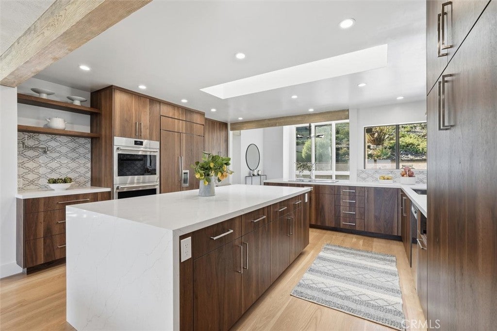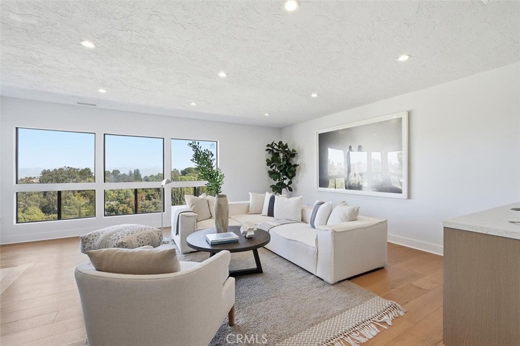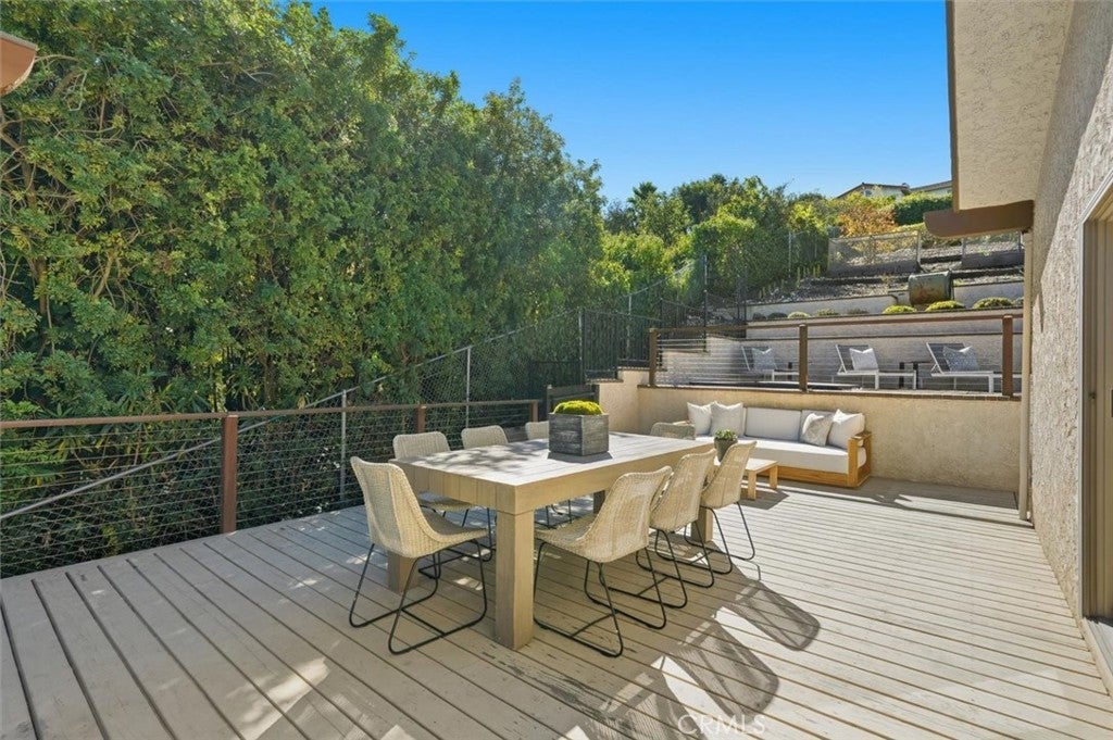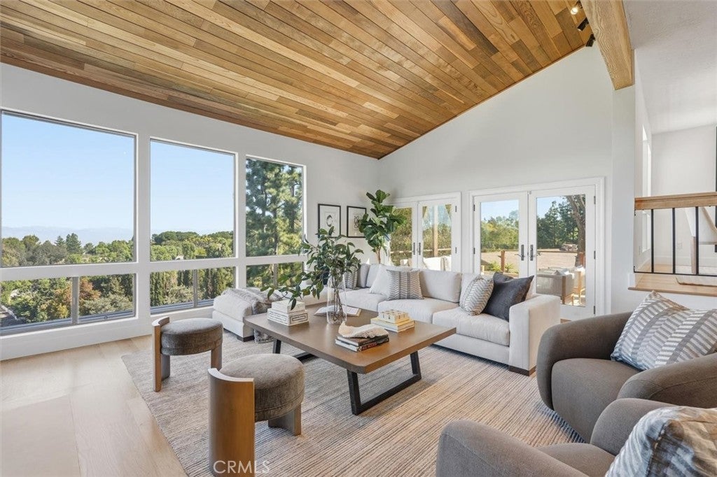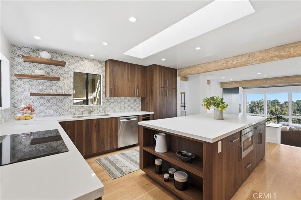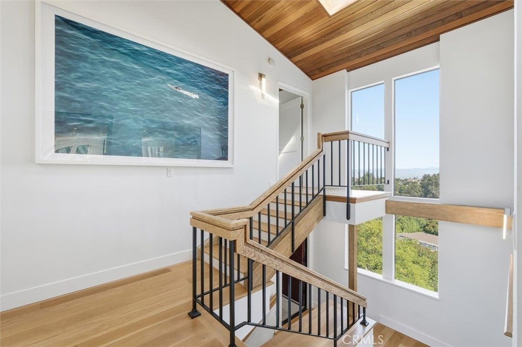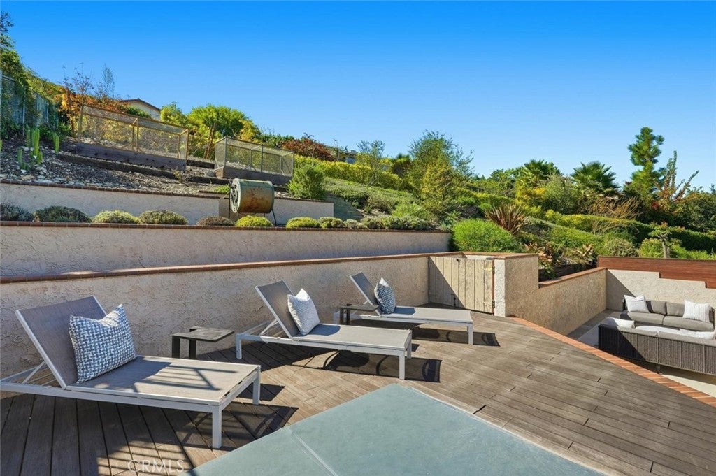 Nestled in the quiet hills of Rancho Palos Verdes, this is the private luxury home you have been waiting for. Boasting stunning views and elegant finishes throughout, this home is a true retreat. Set at the end of a tree-lined cul-de-sac and private driveway, this extensively remodeled modern residence blends timeless design with thoughtful craftsmanship. Resting on over half an acre, this home's flexible floor plan includes four bedrooms, formal living and dining rooms, and a versatile flex space ideal for an office, media room, or home gym. The gourmet kitchen is a showpiece with Subzero refrigerator, Wolf induction cooktop, Wolf oven, Wolf warming drawer, microwave drawer, Bosch dishwasher, and large island perfect for entertaining. The spacious primary suite offers vaulted ceilings, sweeping city views. The spa-like primary bath features a freestanding soaking tub and an expansive glass-enclosed shower. Each bathroom features modern finishes and attention to detail, such as LED-lit mirrors. The generously-sized downstairs family room boasts serene views and features a built-in bar area with mini fridge and convenient bar sink. Additional highlights include engineered hardwood flooring, thoughtfully placed lighting, and custom built-ins throughout. Outside, multiple patios and deck provide calm spaces for dining and entertaining, complemented by a hot tub and lush landscaping. The three-car garage features a work bench with built-in cabinets, an additional storage room with large utility sink, and the large driveway provides ample parking for guests. Surrounded by nature and framed by panoramic downtown and city-light views, this property offers a sense of calm and seclusion that is rare to find. Conveniently located near Peninsula Center’s shops and restaurants and within the award-winning Palos Verdes Peninsula school district, this home offers a perfect blend of quiet luxury, privacy, and sophistication. A rare opportunity to experience refined living.
