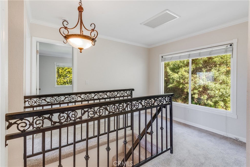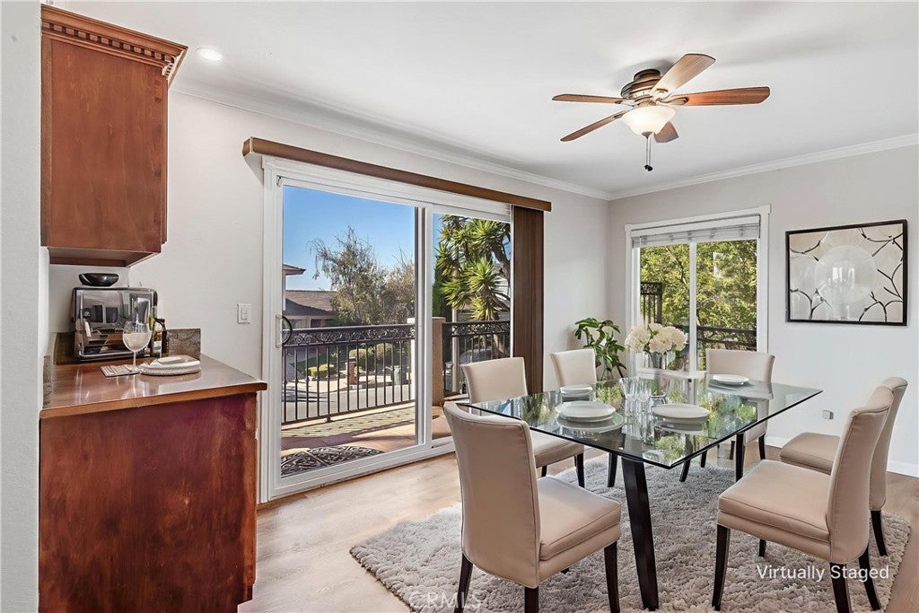 Nestled on a quiet cul-de-sac street, this beautifully maintained home offers a perfect blend of elegance, comfort, and stunning ocean and Catalina views. With 2,115 square feet of living space, the residence features 4 bedrooms, including a spacious primary suite, and 2.5 baths. The home boasts soaring 10-foot ceilings, crown moldings, and recessed lighting throughout, creating a bright and airy atmosphere. Recent upgrades include plush new carpeting and stylish laminate flooring. The living room features an inviting gas fireplace and multiple sliding doors that seamlessly connect to indoor and outdoor living spaces, ideal for entertaining and relaxation. The gourmet kitchen showcases dark brown cabinetry, high-end appliances, and a charming breakfast area, perfect for casual dining. Step outside to a large, private side yard with decks designed for outdoor dining, conversation, and unwinding while enjoying breathtaking ocean and Catalina views from the upper level. Additional highlights include a two-car garage with a dedicated storage room (eliminating the need for a bulky storage locker). This exceptional property offers multiple outdoor living options, a spacious lot, and a prime location—making it an ideal coastal retreat.
