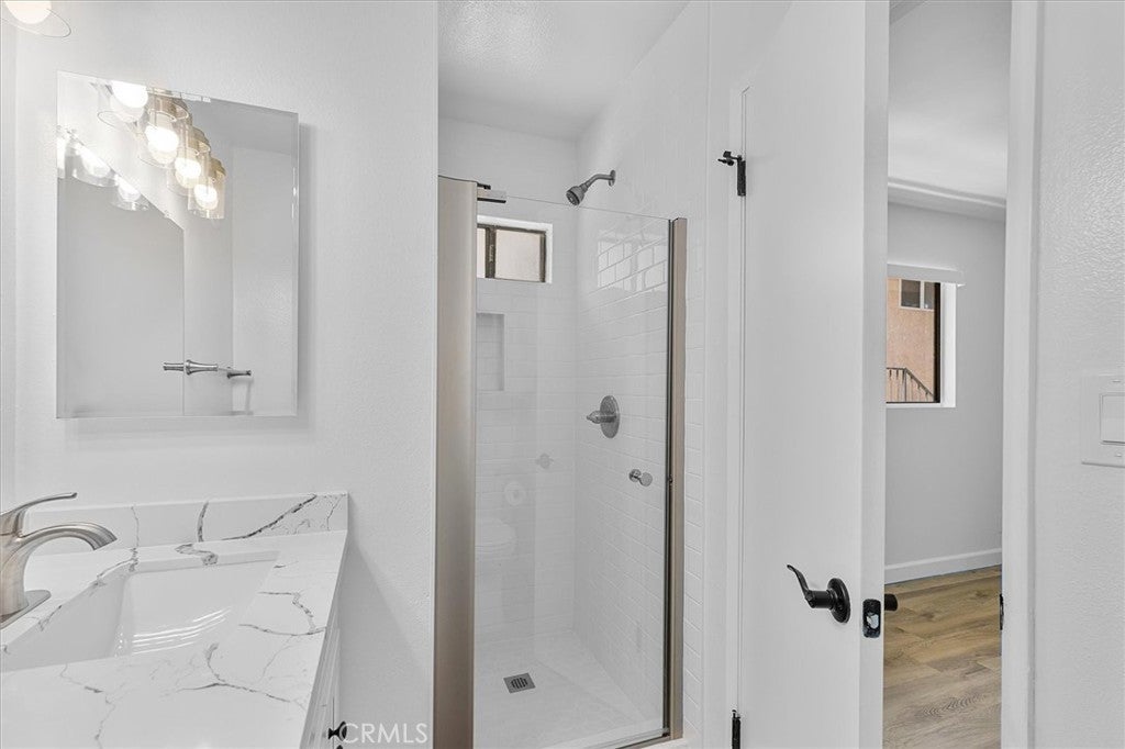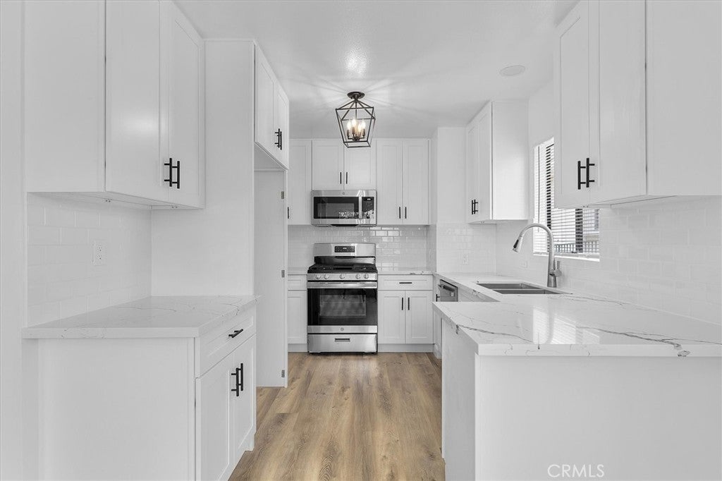 Welcome to this beautifully remodeled, single-level front unit offering 2 bedrooms, 2 bathrooms, and a private 2-car garage. Located in the desirable Vista Del Oro neighborhood of San Pedro, this residence features exclusive front-yard space, in-unit laundry, and newer flooring throughout. The bright, modern kitchen showcases quartz countertops, a classic subway tile backsplash, newer cabinetry, and updated appliances. Both bathrooms have been thoughtfully remodeled with a cohesive, contemporary design that complements the kitchen finishes, creating a seamless and polished look throughout the home. Thoughtfully upgraded and move-in ready, this home is a must-see. The tenant is responsible for all utilities except water and gardening.