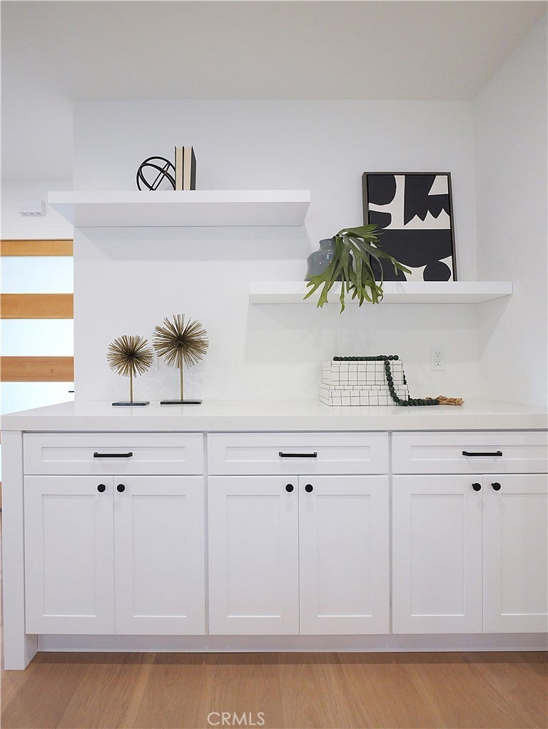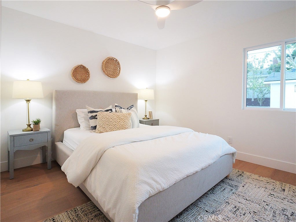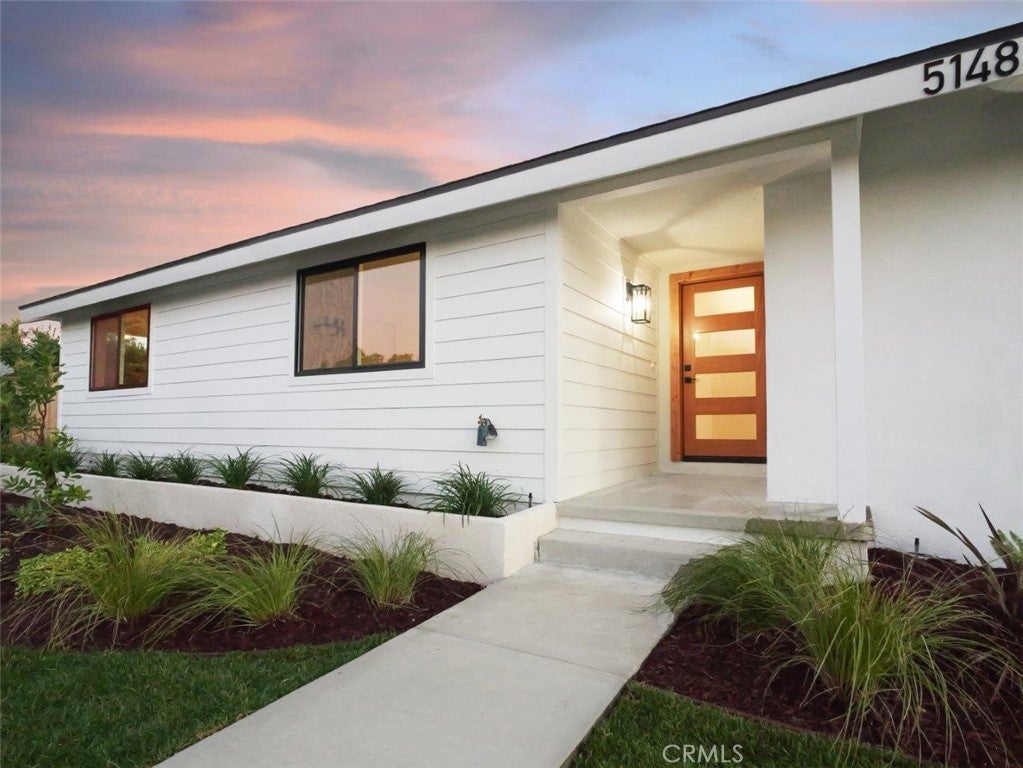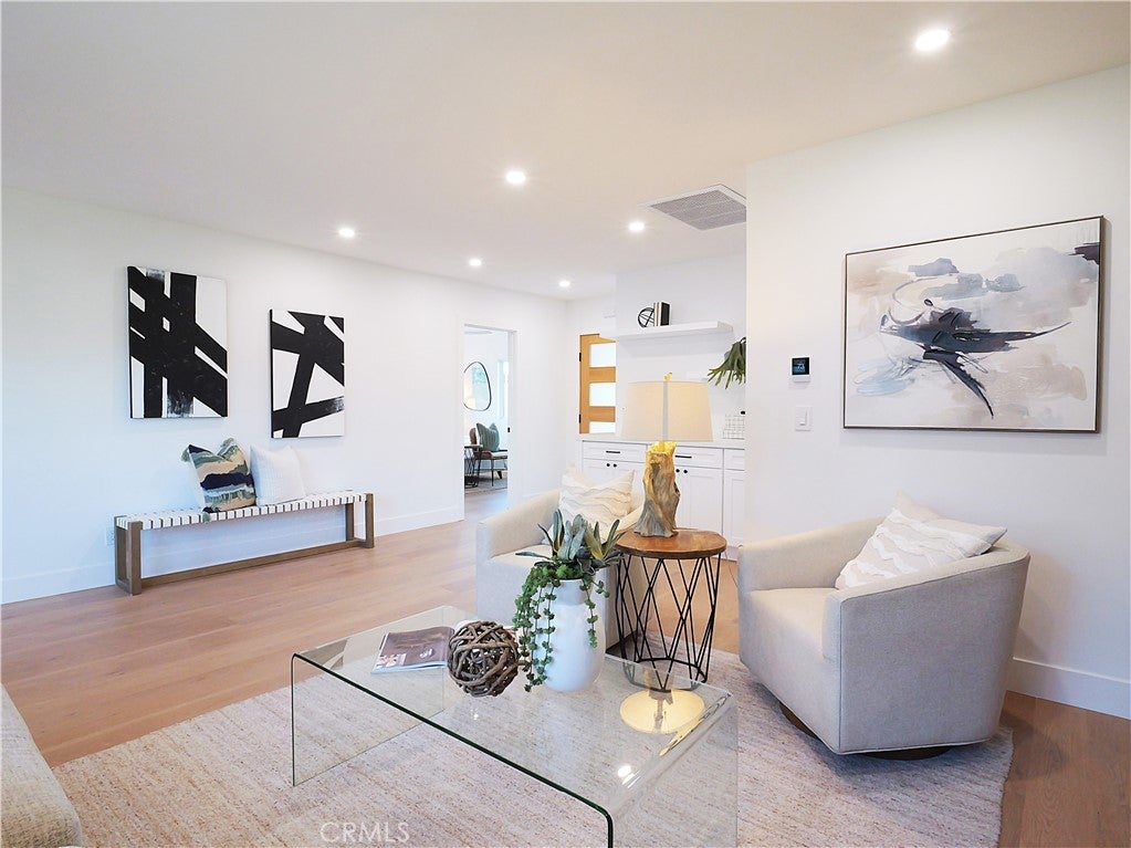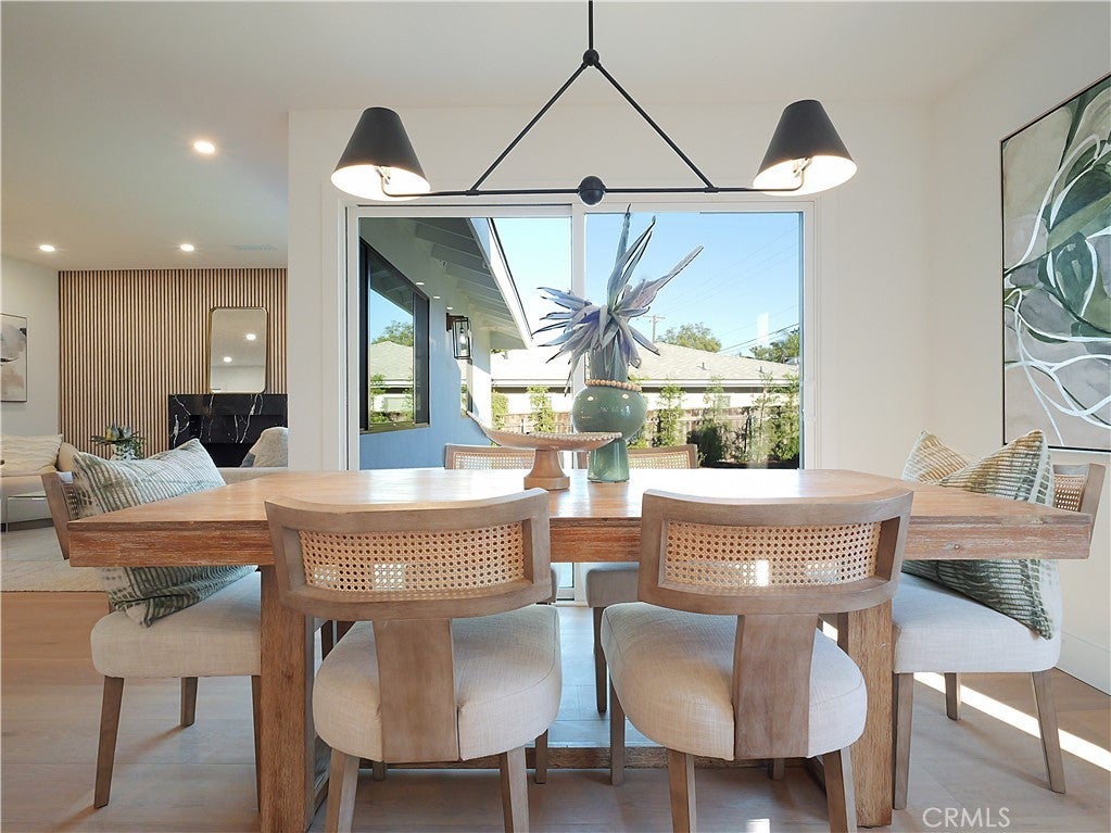 Thoughtfully reimagined with a refined contemporary sensibility, this beautifully remodeled residence offers an exceptional blend of modern design, everyday functionality, and long-term flexibility, set on a prominent corner lot in Rancho Palos Verdes. The single-level main home features four well-appointed bedrooms and two full bathrooms, designed to support both growing families and those seeking effortless, stair-free living. A light-filled open floor plan creates a natural flow between spaces, anchored by a striking marble fireplace framed by a custom slatted feature wall—an architectural focal point that adds warmth and sophistication to the living area. Wide-plank white oak flooring runs throughout, complementing the home’s clean lines and cohesive palette. The dining area overlooks the enclosed backyard, offering a seamless connection between indoor and outdoor living; ideal for both daily life and entertaining. At the heart of the home, the kitchen reflects a no-expense-spared approach, combining form and function with elevated style. A striking split-tone design pairs a wall of crisp white cabinetry with a white oak island, topped in dramatic black marble countertops. High-end appliances, including an undercounter microwave drawer, complete a space designed for both beauty and performance. The primary suite serves as a private retreat, featuring a bold black-and-white palette, contemporary lighting and fixtures, and a spa-inspired bathroom with a freestanding soaking tub—a serene space to unwind at the end of the day. Throughout the home, modern black hardware, lighting, and plumbing fixtures provide a cohesive and polished aesthetic. Enhancing the home’s versatility is a detached bonus living space, complete with a bathroom — ideal as a private home office, guest suite, flex space, or additional bedroom. This rare feature offers exceptional adaptability for today’s evolving lifestyles, from remote work to multigenerational living. Additional highlights include a two-car garage, modern low-maintenance landscaping, an enclosed backyard, and excellent curb appeal that reflects the quality and intention found throughout the home. Designed for how people live today—and how they will live tomorrow—this turnkey property offers a rare combination of architectural style, thoughtful layout, and flexible living in one of Rancho Palos Verdes’ most desirable settings.