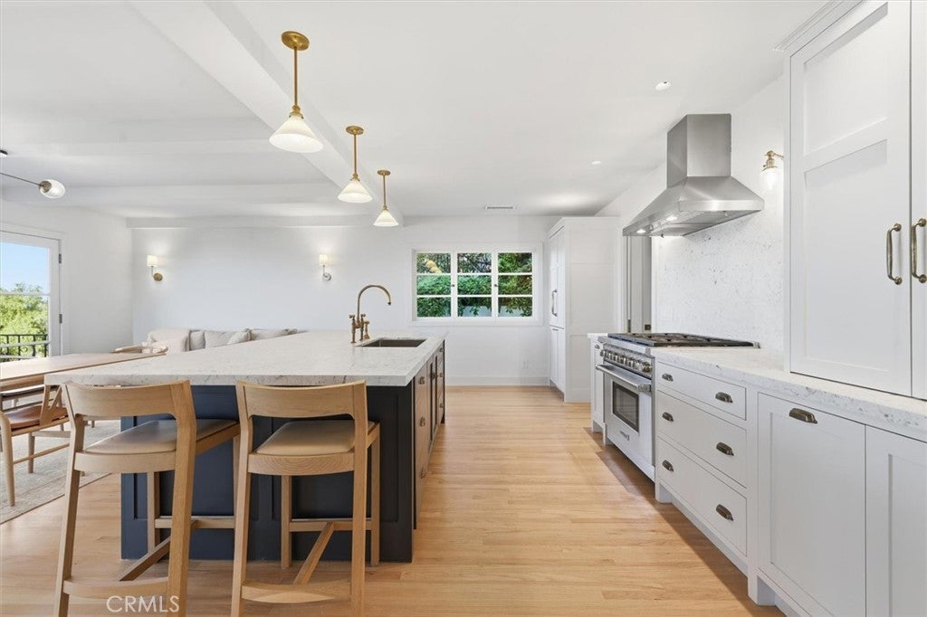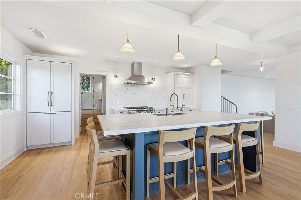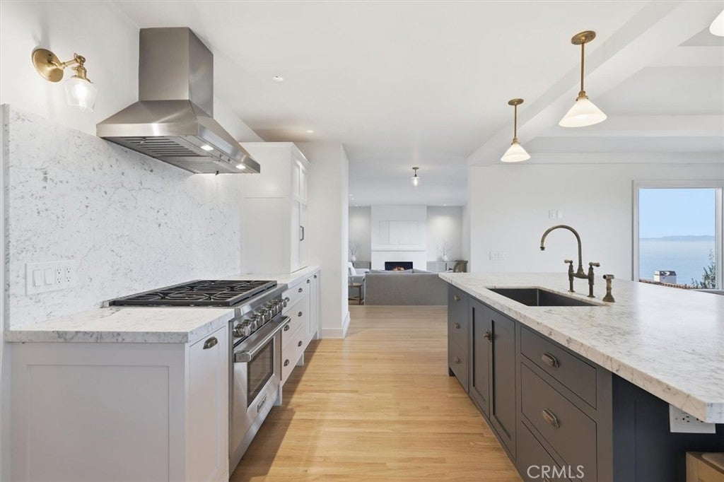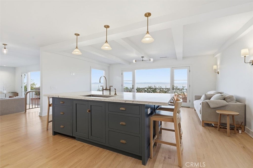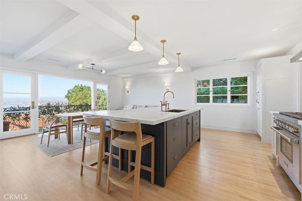 Queen’s Necklace Views! Breathtaking, panoramic vistas of the Queen’s Necklace, city lights, mountains, and Downtown Los Angeles define this exquisitely custom-remodeled 2-bedroom, 3-bath home in sought-after Malaga Cove—a truly rare offering. The home features a thoughtfully designed open floor plan with stunning views from most rooms, complemented by custom cabinetry throughout that adds both beauty and functionality. The gourmet kitchen is a showpiece, featuring an oversized center island with white marble countertops and seating for six, top-of-the-line appliances including a Wolf 6-burner range and oven, Dacor refrigerator and freezer, Bosch dishwasher, hand-forged brass fixtures, and oak hardwood floors. A spacious dining and family room flows seamlessly from the kitchen, with doors opening to an ocean-view balcony. The inviting living room includes a fireplace and opens to an outdoor patio—perfect for entertaining and enjoying the coveted Malaga Cove lifestyle. The generous primary suite offers direct access to the rear patio and a beautifully remodeled bath with marble countertops, shower, and flooring. The second bedroom is currently used as an office, 2nd bathroom is a full with tub and shower, white marble counters, and finishes. A separate utility room with laundry, built-in workspace, 1/2 bath, and convertible daybed provides flexibility for overnight guests. The private backyard serves as a peaceful retreat—an ideal refuge to unwind, relax, and take in the serene surroundings. The home also has a finished two-car garage currently converted into a private at-home gym, which can be enjoyed in its current form, A rare opportunity to own a move-in-ready home with iconic views, refined updates, and an exceptional Malaga Cove location.