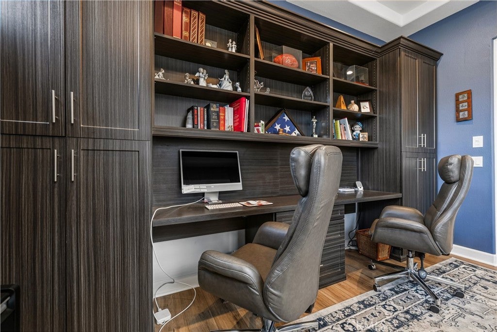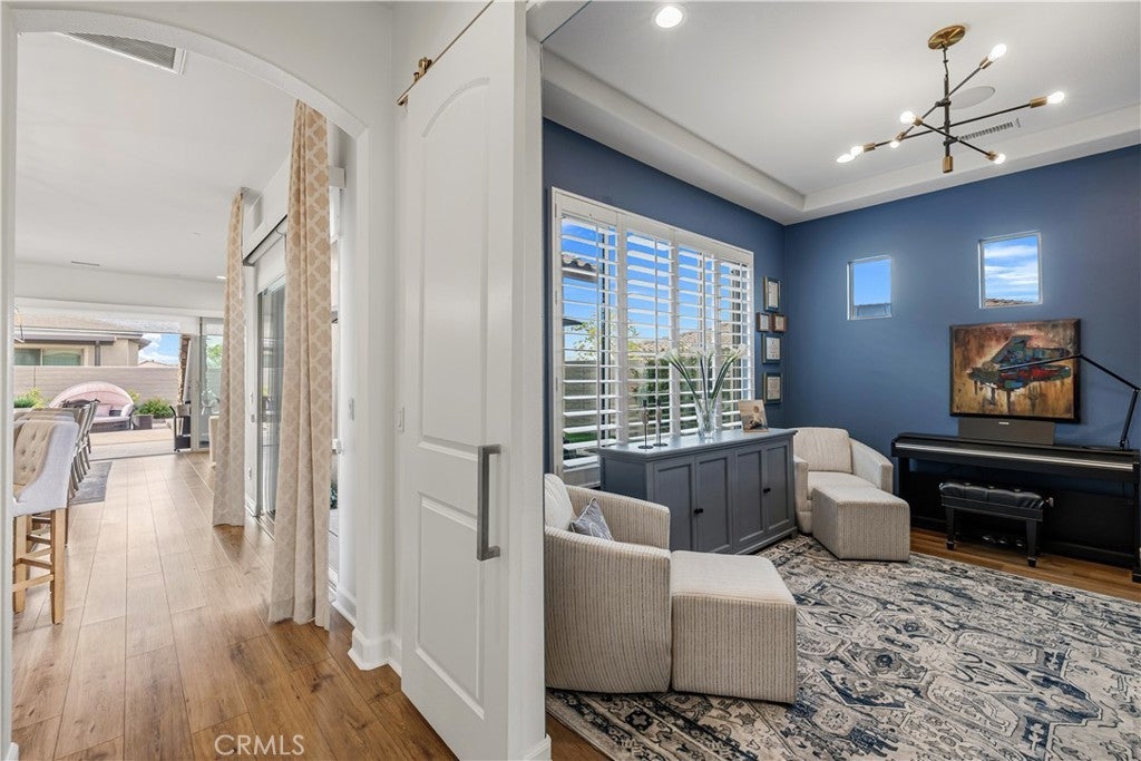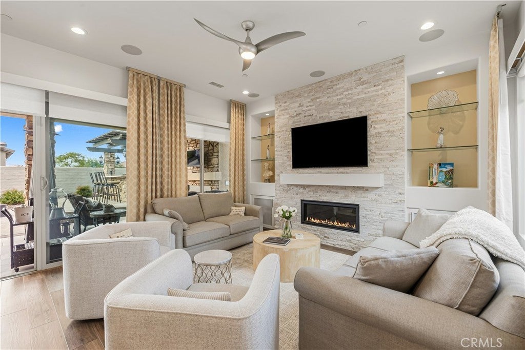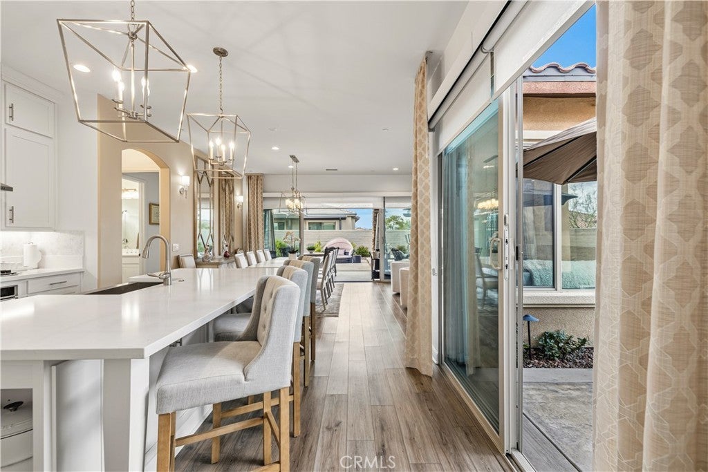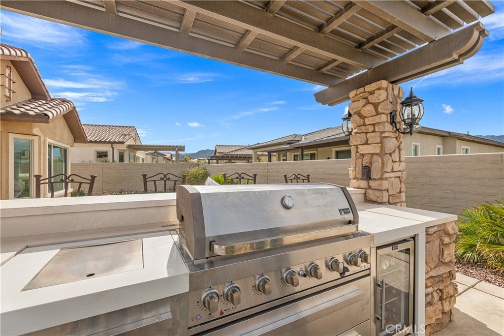 Welcome to this stunning 2-bedroom, 2-bath residence with an elegantly designed den, located in the highly sought-after Del Webb Rancho Mirage 55+ community. This property is located on one of the largest lots within the community just under 8,000 sqft. Meticulously upgraded and beautifully curated, this exceptional home blends sophisticated design with effortless indoor-outdoor living, all with serene mountain views. The open-concept family room is a true showpiece, featuring a custom white stone fireplace, recessed- lighted display niches, and an integrated surround sound system that creates an immersive entertainment experience. The kitchen and laundry room are enhanced by designer tile backsplashes, while thoughtfully crafted custom cabinetry includes built-in drawers in the front bedroom and custom shelving, cabinetry, and a built-in desk in the den, ideal for a refined home office or creative retreat. The expansive primary suite offers a private sanctuary, highlighted by a beautifully appointed spa-inspired bathroom and large walk-in closet with fully customized built-in shelving and cabinetry designed for both elegance and organization. Blackout shades provide comfort for those hot days and privacy, completing the serene retreat. Additional luxury appointments include remote-controlled shades on the living room patio doors, custom shades in the family room, and classic plantation shutters in the den, front bedroom, and primary bathroom. As well as, luxury vinyl plank flooring throughout. The laundry room is equally refined with custom risers and drawers, elevating the washer and dryer for added ease and convenience. Step outside to a resort-style outdoor oasis crafted for both relaxation and entertaining. The enclosed patio with porcelain tile flooring flows seamlessly to a custom outdoor kitchen with stone finishes, built-in grill, countertop, and pergola. A custom concrete patio with illuminated steps, a 3-hole putting green, and artificial turf in both the front and back yards create a low-maintenance yet luxurious environment. An outdoor stone entertainment wall, designed to match the grill area, completes this exceptional space. This remarkable residence delivers refined luxury, thoughtful design, and resort-style living within one of Rancho Mirage’s most desirable communities.