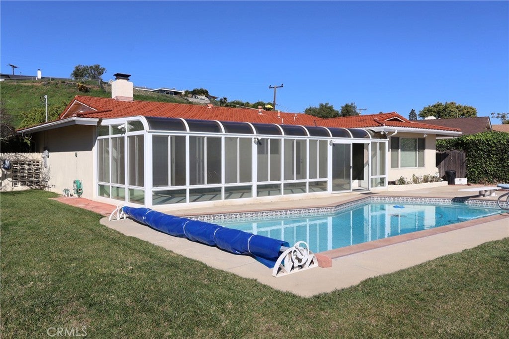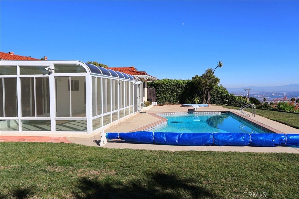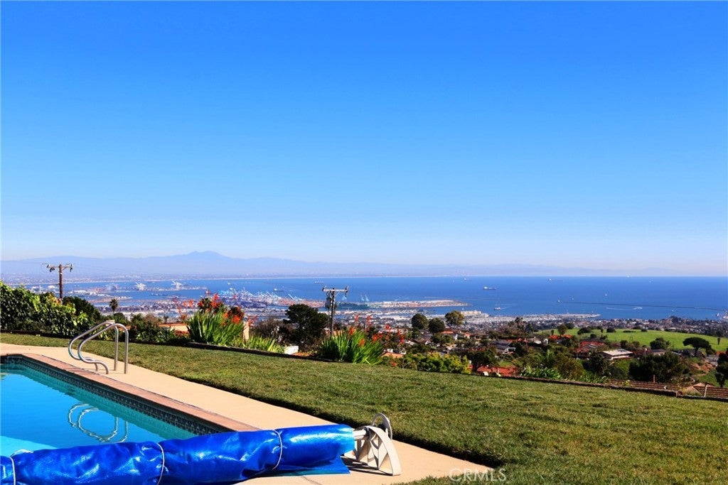 Enjoy breathtaking panoramic ocean and Catalina views while dipping in the relaxing spa or swimming pool. Glittering night view of Long Beach Harbor is awesome. The extra large sunroom is another wonderful place to enjoy the view and the warm sun during the winter. If you like a resort lifestyle, you are welcome. Thanks to its unique location, this particular property has a large grassy backyard even with a sizeable swimming pool and spa. The 4 bedroom house with red tile roof is spacious and bright. Real hardwood floors throughout. The living and family rooms have a back-to-back fireplace. EV (Tesla) charger is provided behind the additional parking space. This is not a trendy house, but well maintained and functional, waiting for a well-qualified tenant (730+). Mira Catalina Elementary and Miraleste Middle. Easy access to Harbor freeway 110.