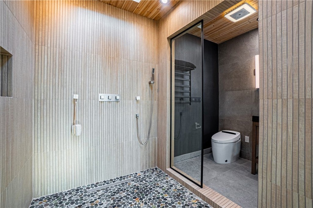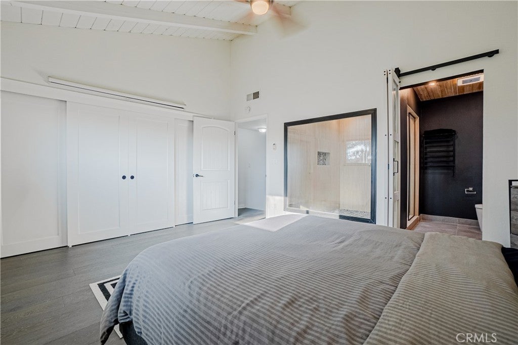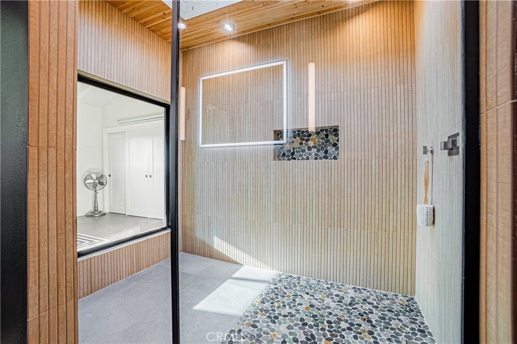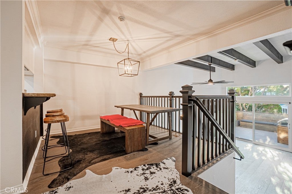 Chic, stylish, and elegant in Redondo Beach, this black and white Spanish-themed 2 bed, 2.5 bath home brings unique character and boasts numerous tastefully curated upgrades. With soaring 13' ceilings in the living room and finely selected materials throughout, you're greeted with white oak threads at the entrance, an open staircase with white oak, and newly installed European oak Italian hardwood floors through most of the living spaces. The dining area overlooks the living room and is conveniently open to the kitchen with an eat-in counter. Admire the Spanish-inspired black beams, warm fireplace, and the sleek 65-inch ceiling fan in the living room along with remote-controlled lift for the light-filtering electronic shades. The bedrooms are spacious quarters with a primary bedroom that is truly a private retreat. Experience the newly added ultra-modern primary bath, transformed into the feel of an outdoor rain shower spa oasis, complete with a 72-inch skylight overhead, cedar wood ceilings, a 16-inch rain shower head with controls, stone gray rock tile surround, a pebble stone shower floor, and a 5-foot picture window offering a view of the outdoors. This bathroom features a fully electric bidet, quartz countertops with LED mood lighting, and a towel warmer. The second bedroom features a walk-in closet and has a private bathroom in the hallway. Enjoy the beautiful Southbay climate on the large outdoor deck/patio opening from the living room - great for entertaining and everyday living with the built-in grill and ample custom bench seating, the cool vibe of outdoor spaces complete this amazing home. Other features and offerings include: Flat-screen TV wall-mount in living room, refrigerator, washer and dryer, 2-car garage, Level-2 EV charger, laundry in-unit, and ample storage in the garage. Conveniently located off Aviation Blvd. and just minutes from Hermosa Beach and the Manhattan Beach Pier, the home is ready for immediate move-in and for you to call home.
