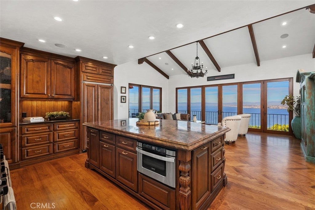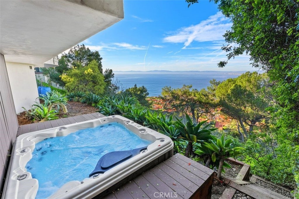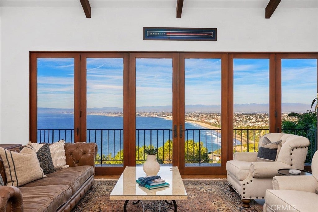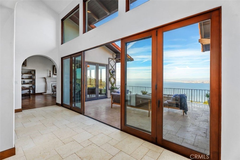 A rare opportunity to own one of Malaga Cove’s most compelling view properties, this custom, Spanish-inspired estate captures panoramic Queen’s Necklace and white-water ocean views while enjoying exceptional privacy adjacent to parkland within Palos Verdes Estates. Completed in 2025, the remodel blends timeless architecture with modern infrastructure and artfully appointed finishes, including white smooth plaster walls with a Venetian wax finish, expansive 8-foot bifold doors spanning 15–18 feet, custom-sized milled hickory pecan herringbone flooring, limestone floors in Versailles and herringbone patterns, and solid glazed alder cabinetry with extensive built-ins. Designed as a true culinary pavilion, the ocean-view kitchen opens to the family room and sits adjacent to the dining room for seamless entertaining. It features premium appliances, dual sinks, dual dishwashers, two refrigerator/freezers, including a 60-inch commercial unit, and generous prep space. A fully equipped dirty kitchen supports effortless hosting, while the exterior kitchen — complete with built-in smoker/BBQ, Argentinian grill, and a 60-inch wood-fired pizza oven — extends the experience outdoors. The dining room showcases a striking glass-encased wine cellar with a cellar pantry and abundant wine glass storage, opening to a patio with a gas fire feature overlooking the coastline. A beautifully appointed living room with a fireplace provides refined comfort nearby. The lower level offers a private retreat with a luxurious primary suite capturing breathtaking panoramic coastline vistas. The spa-inspired bath includes an 8-valve shower system with an oversized 8x24-inch main shower head and additional wall heads, plus warm flooring throughout. A custom primary closet completes the suite. Additional bedrooms provide privacy for family or guests. Below, a serene spa overlooks the coastline and a lush orchard featuring avocado, cherry, plum, apricot, apple, Meyer lemon, Baer lime, mandarin, blood orange, Buddha’s hand, Seville orange, pomegranate, fig, nectarine, peach, donut peach, guava, and bay leaf. A private path leads directly to the walking trail below. With fully upgraded water, sewer, gas, electrical, and heating systems, upsized water lines, and exceptional additional storage, this residence delivers rare views, privacy, craftsmanship, and elevated coastal living.