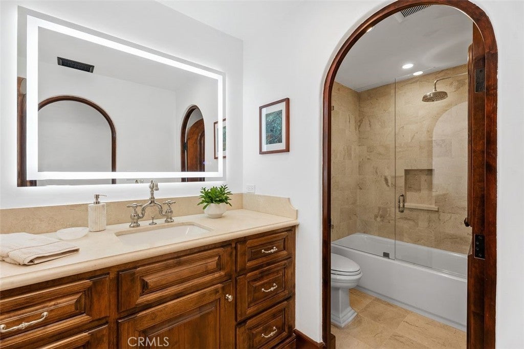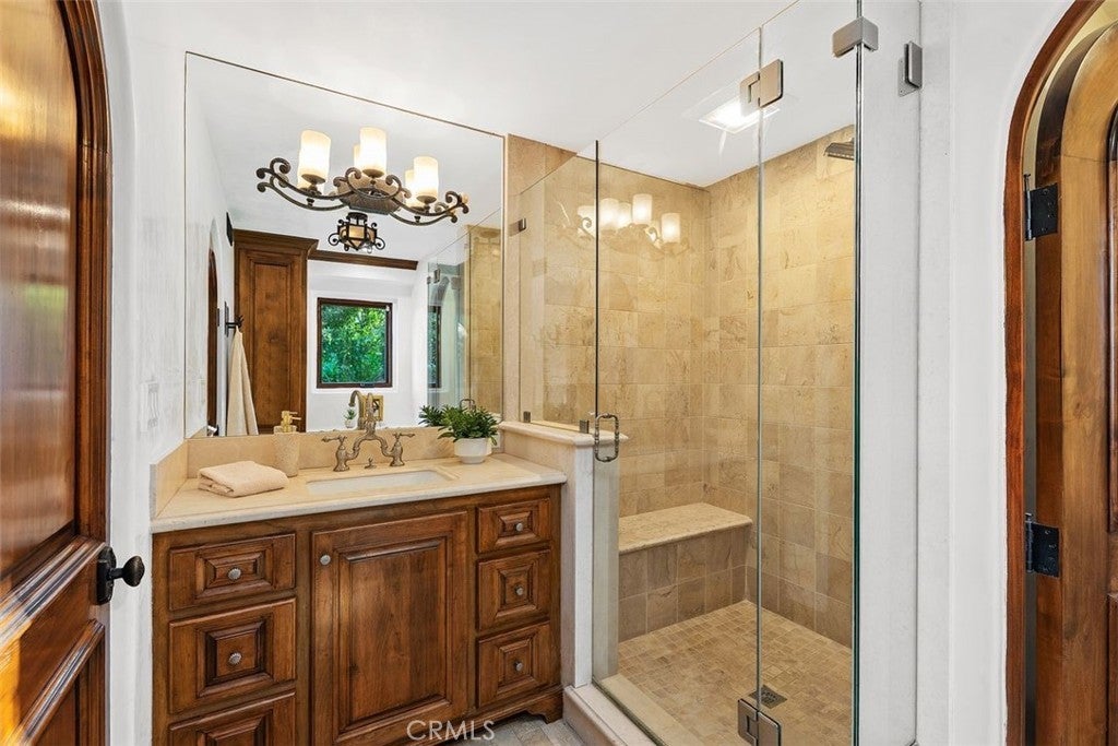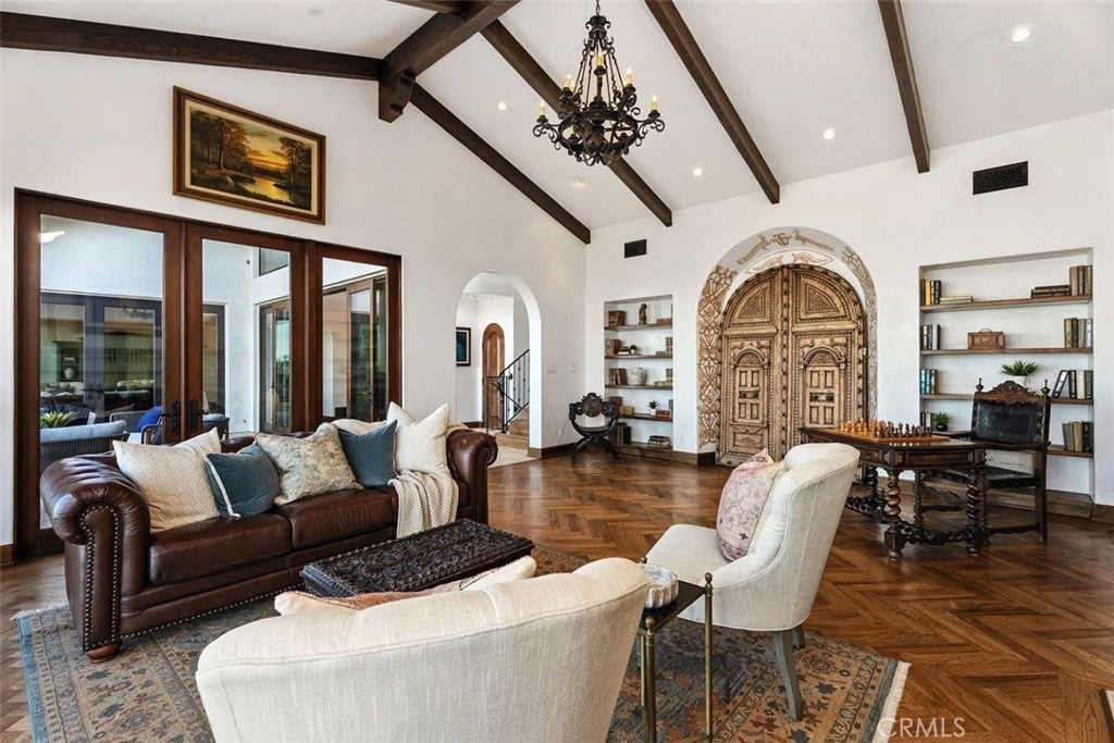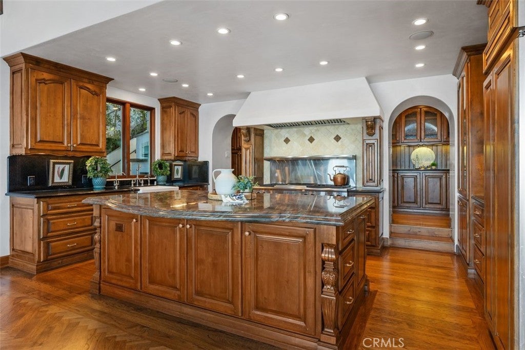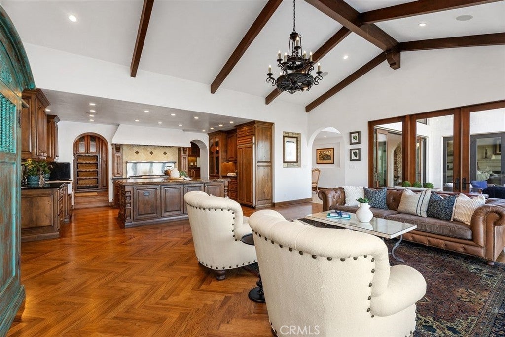A rare opportunity to own one of Malaga Cove’s most compelling view properties, this custom, Spanish-inspired estate captures panoramic Queen’s Necklace and white-water ocean views while enjoying exceptional privacy adjacent to parkland within Palos Verdes Estates. Completed in 2025, the remodel blends timeless architecture with modern infrastructure and artfully appointed finishes, including white smooth plaster walls with a Venetian wax finish, expansive 8-foot bifold doors spanning 15–18 feet, custom-sized milled hickory pecan herringbone flooring, limestone floors in Versailles and herringbone patterns, and solid glazed alder cabinetry with extensive built-ins. Designed as a true culinary pavilion, the ocean-view kitchen opens to the family room and sits adjacent to the dining room for seamless entertaining. It features premium appliances, dual sinks, dual dishwashers, two refrigerator/freezers, including a 60-inch commercial unit, and generous prep space. A fully equipped dirty kitchen supports effortless hosting, while the exterior kitchen — complete with built-in smoker/BBQ, Argentinian grill, and a 60-inch wood-fired pizza oven — extends the experience outdoors. The dining room showcases a striking glass-encased wine cellar with a cellar pantry and abundant wine glass storage, opening to a patio with a gas fire feature overlooking the coastline. A beautifully appointed living room with a fireplace provides refined comfort nearby. The lower level offers a private retreat with a luxurious primary suite capturing breathtaking panoramic coastline vistas. The spa-inspired bath includes an 8-valve shower system with an oversized 8x24-inch main shower head and additional wall heads, plus warm flooring throughout. A custom primary closet completes the suite. Additional bedrooms provide privacy for family or guests. Below, a serene spa overlooks the coastline and a lush orchard featuring avocado, cherry, plum, apricot, apple, Meyer lemon, Baer lime, mandarin, blood orange, Buddha’s hand, Seville orange, pomegranate, fig, nectarine, peach, donut peach, guava, and bay leaf. A private path leads directly to the walking trail below. With fully upgraded water, sewer, gas, electrical, and heating systems, upsized water lines, and exceptional additional storage, this residence delivers rare views, privacy, craftsmanship, and elevated coastal living.