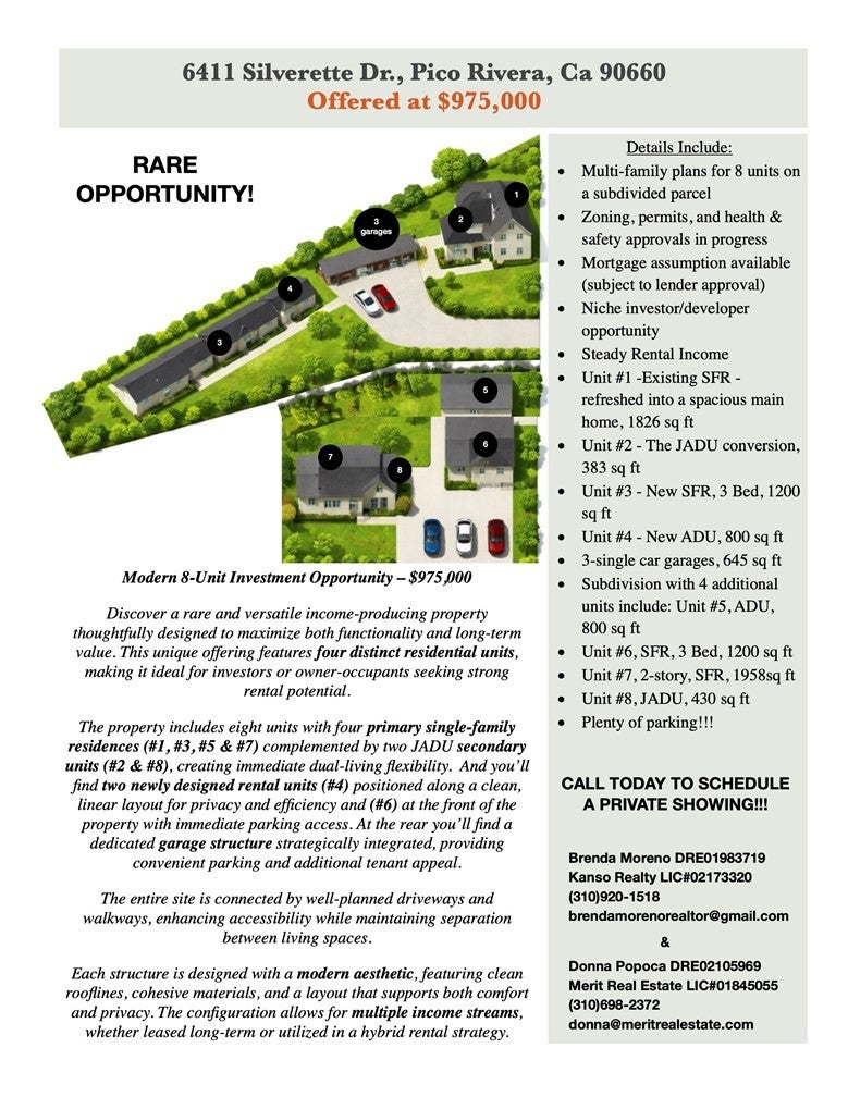 Rare Opportunity! This is a prime development opportunity with plans in progress located in Pico Rivera. The project includes completed architectural layouts and active permit applications with the city. Structural engineering is underway, providing a valuable head start for the next owner. Ideal for investors or builders looking to customize and complete a nearly shovel-ready project. By purchasing this property, a buyer bypasses at least a year of city planning, architectural design, and engineering hurdles. Skip the 12-month city wait and start building today! This massive 21,824 sq. ft. lot comes with architectural plans to transform the property into a high-income multi-unit compound. Whether you are an investor looking for a high-yield rental or a homeowner seeking a multi-generational estate, this project has it all. The property plans include eight units with four primary single-family residences (Units #1, #3, #5 & #7) complemented by two JADU secondaryunits (#2 & #8), creating immediate dual-living flexibility. You’ll find two newly designed rental units (#4) positioned along a clean, linear layout for privacy and efficiency and (#6) at the front of the property with immediate parking access. At the rear you’ll find a dedicated garage structure strategically integrated, providing convenient parking and additional tenant appeal. Professional architectural plans from DG+Associates. This project is designed to the latest 2025 California Building Codes. Don't spend your time in city hall—spend it on the job site. This is a rare, low-risk, high-reward project in a sought-after neighborhood. Plan sets and permit status available upon request.