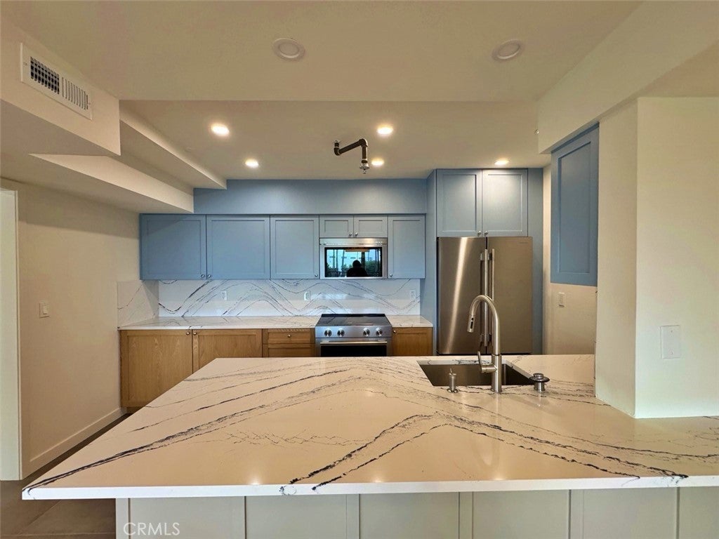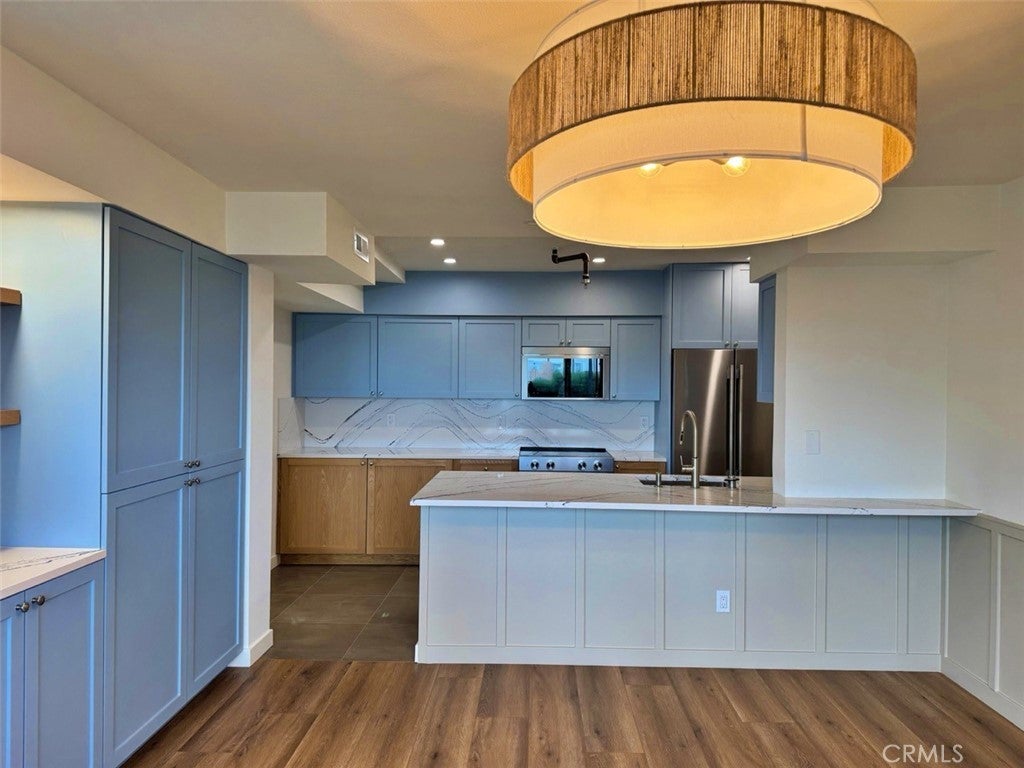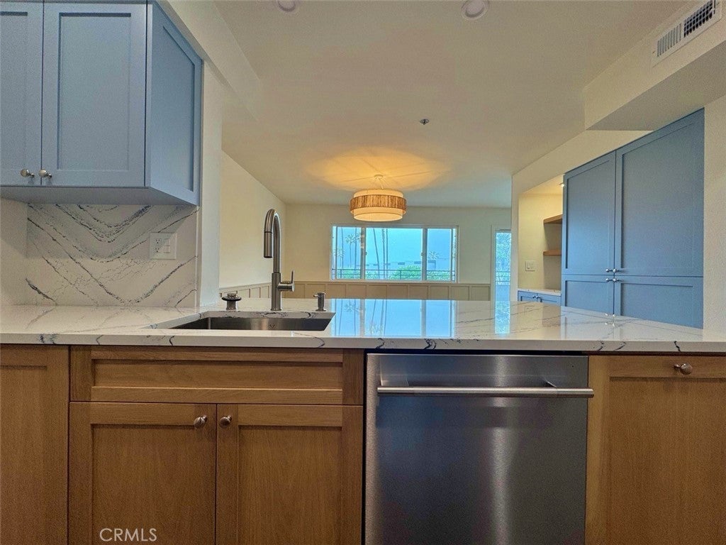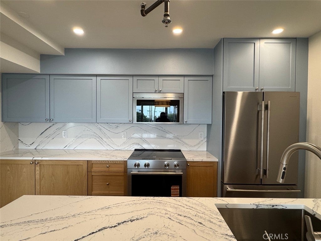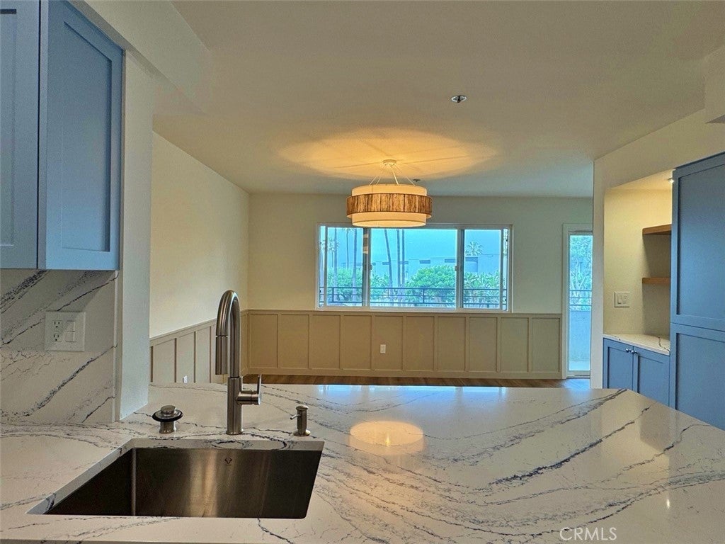 Welcome to Your Beachside Retreat Experience the ultimate coastal lifestyle in this beautifully remodeled condo, perfectly positioned just moments from Redondo Beach Pier, King Harbor, and pristine beaches. This bright and spacious front unit features an open-concept design with stunning upgrades throughout. The showpiece kitchen boasts quartz countertops with dramatic veining, two-tone cabinetry in soft blue and natural wood, stainless steel appliances, and a generous breakfast bar, ideal for entertaining. A built-in pantry and wet bar with open wood shelving and a statement drum pendant light add character to the adjacent dining area. The inviting living room centers around a sleek fireplace with a smooth plaster surround, while natural light pours in through dual-pane sliding glass doors opening to a generous balcony where you can savor sunsets and ocean glimpses. The thoughtfully designed layout includes two bedrooms and two bathrooms, each finished with coordinating quartz countertops, natural wood vanities, and elegant marble-look tile in the shower surrounds. The primary suite offers a spacious walk-in closet. For added convenience, a Samsung front-load washer and dryer are discreetly tucked into the hallway laundry area with custom cabinetry above. Beyond your private sanctuary, the beautifully landscaped complex offers resort-style amenities including a fully equipped gym, inviting spa, and relaxing sauna. Your assigned parking space in the secure subterranean garage provides peace of mind, while complimentary guest parking behind the complex welcomes your visitors. Located in the heart of South Redondo Beach, you'll enjoy easy access to local restaurants, shopping, and award-winning schools. This beachside haven offers the perfect blend of modern finishes, convenience, and coastal charm.