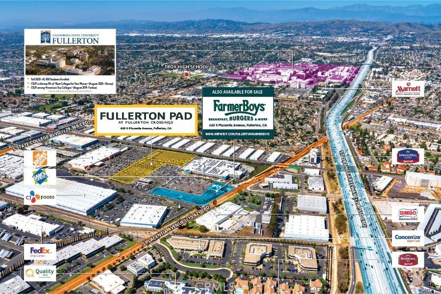 Land Lease or Build to Suite by Owner. SOUTHERN CALIFORNIA DEVELOPMENT OPPORTUNITY. Opportunity to develop a 5.49-acre parcel, APN 338-071-22. Entitled for a 50,758 SF multi-tenant building adjacent to Sam’s Club (NAP). Entitled for a 13,120 SF pad with existing infrastructure. Parking lot improvements already completed, 1,617 parking spaces approximate. DENSE AND AFFLUENT ORANGE COUNTY TRADE AREA. More than 22,900 people within a 1-mile radius with an Average Household Income of $69,600. More than 221,000 people within a 3-mile radius with an Average Household Income of $104,900. More than 510,900 people within a 5-mile radius with an Average Household Income of $112,000. Strong daytime population of over 25,700 people within a 1-mile radius. CAL STATE FULLERTON PROXIMITY. Fullerton Crossings is located less than 2 miles from the Cal State Fullerton Campus, which has an enrollment of 39,556 students. Home Depot and Sam’s Club Anchored Center – Fullerton Crossings is shadow-anchored by a high-performing Home Depot and Sam’s Club (with fuel station), generating significant daily traffic from a larger regional draw. High Traffic, High Identity Freeway Location – Fullerton Crossings benefits from over 930 feet of frontage along S Placentia (over +/- 15,400 CPD) with immediate access to SR57 (over +/- 299,500 CPD), a primary north-south highway connecting the property to the Greater Los Angeles Area. Please see the attached Fullerton Crossings Land For Lease OM for more details.