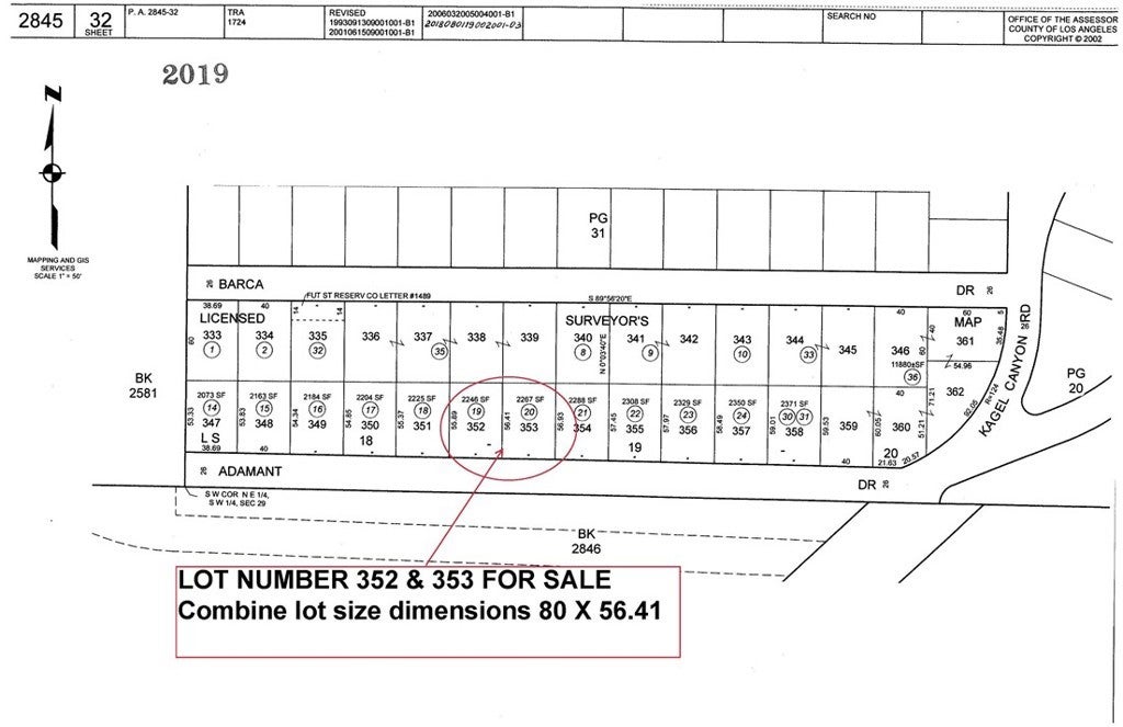 In this sale we are including 2 Side by side lots for sale totaling 4,525 sq ft Lots number 352 & 353 no house in the lots, only land. APNs in this combine sale is 2845-032-019 & 2845-032-020 Welcome to your own slice of paradise nestled in the tranquil beauty of Kagel Canyon! This captivating plot of land offers a generous expanse measuring 80x 60 ZONE LACA 110000*, presenting an unparalleled opportunity to build your dream home amidst nature's embrace. Imagine waking up to the melodious chirping of birds, the gentle rustle of leaves, and the crisp mountain air filling your lungs. With majestic mountains as your backdrop, this idyllic haven promises to be a sanctuary for those seeking solace from the hustle and bustle of city life. Whether you envision a cozy cabin, a modern eco-friendly abode, the possibilities are endless on this pristine canvas. Located in Kagel Canyon, renowned for its breathtaking scenery and abundant wildlife, this parcel of land invites you to reconnect with the natural world and create memories that last a lifetime. Don't miss this rare opportunity to own a piece of Kagel Canyon's enchanting landscape. Seize the chance to craft your own oasis and immerse yourself in the serene beauty of nature.