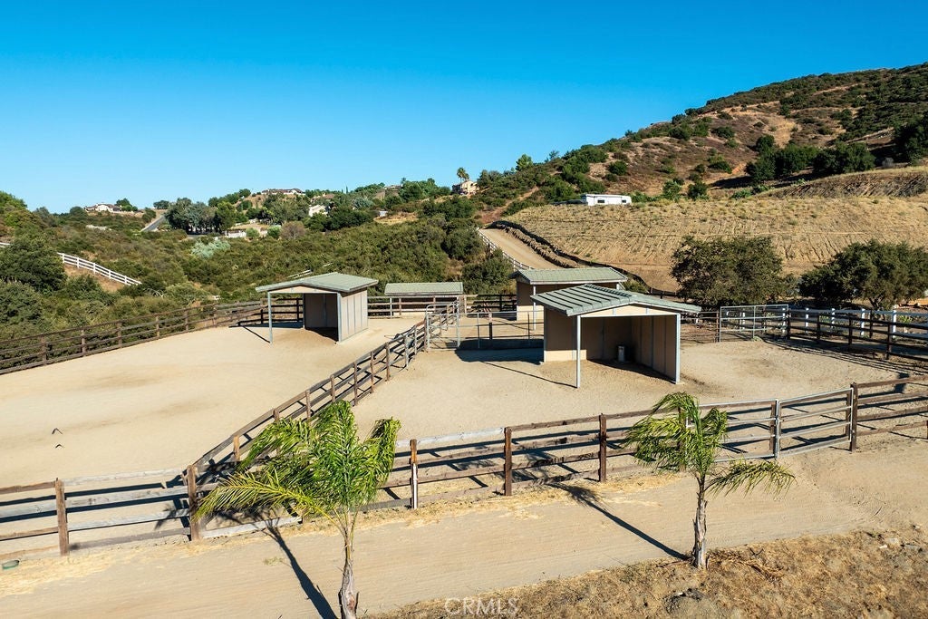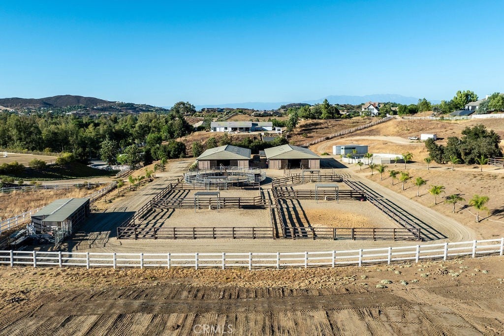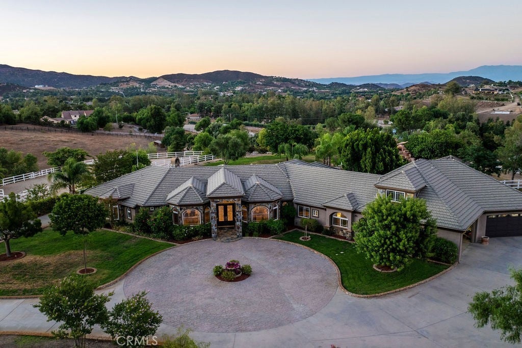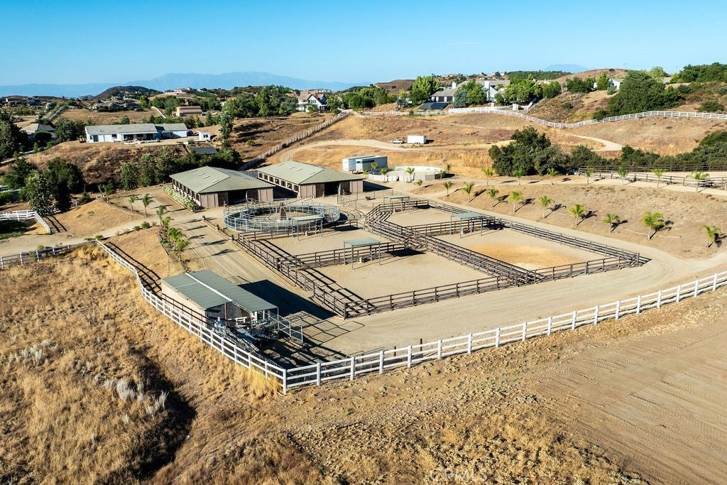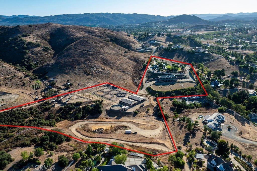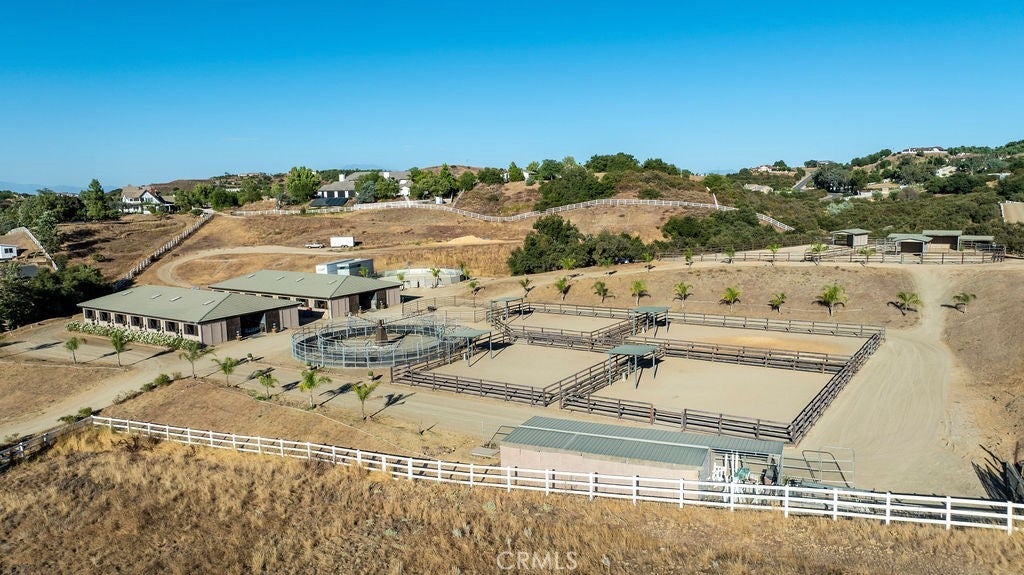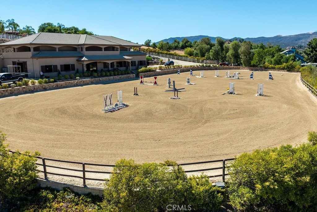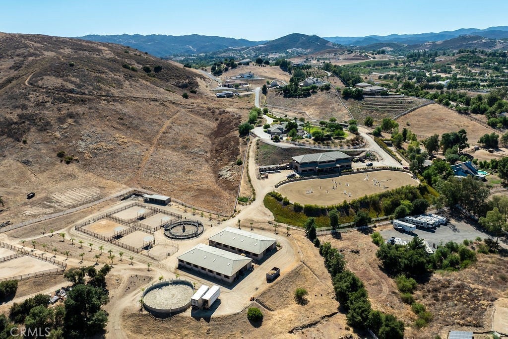 Welcome to “Miracle Ranch” a world-renowned equestrian training facility and luxury estate. Amazing opportunity to own one of the most prestigious panoramic view ranches in sought after La Cresta, high above Murrieta/Temecula, easy access to equestrian shows and events. This Equestrian Dream facility offers even the most discerning buyer an opportunity to have their own personal training center or run a business boarding for trainers and clients. Two separate lots total approx.14.9 acres. One lot can be used for an additional home, indoor arena, further pasture areas or sold off down the road. Enter this completely fenced estate through impressive double entry gates and driveway to a circular courtyard with sprawling single story home on expansive lot. Views from every window, endless lawns, elaborate amusement park type double pool with waterfalls, slides, cave, bridge “Tarzan” swing rope and more. Outdoor kitchen, huge patios and entertaining areas. Enter residence through double beveled glass doors to soaring entryway, beautiful formal living room with cozy custom fireplace and French doors to exterior. Large open floor plan, formal dining room for family parties, and spacious library/office area. Stroll along to massive family room with cozy custom fireplace, built-ins, bay window eating nook and chefs delight kitchen with top of line appliances (Wolf/Sub Zero), central island, breakfast bar and walk in pantry. Three secondary bedrooms and a 5th bedroom upstairs, presently used as apartment with bathroom, kitchen, balcony and more. The lavish primary suite sits in own private wing, offering large sitting area, private deck, double closets, soaking tub, and shower. 4/5 car garage completes the residence. The equestrian facilities are unsurpassed. Main mahogany-built barn with European fronts, 8 stalls: 5 stalls 16x20 and 3 stalls 16x16, double doors each end, top of the line finishes, fire sprinkler system, Nelson Auto waterers, speaker system, chandeliers, grooming stalls, utility area. All stalls have mattress flooring, offer exterior open windows with shutters, fans, barn aisle with rubber flooring, fly system, tack room, alarm, cameras office/feed room, lounge, bar, powder bath and viewing deck overlooking stunning 100’ x 350’ arena, Ebb & Flow under footing watering system, GGT footing. Two additional center aisle barns offer 14 stalls each with similar amenities. Total of “36” stalls. See amenities list for additional information.