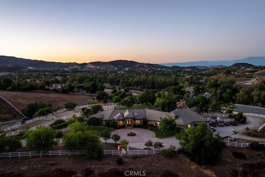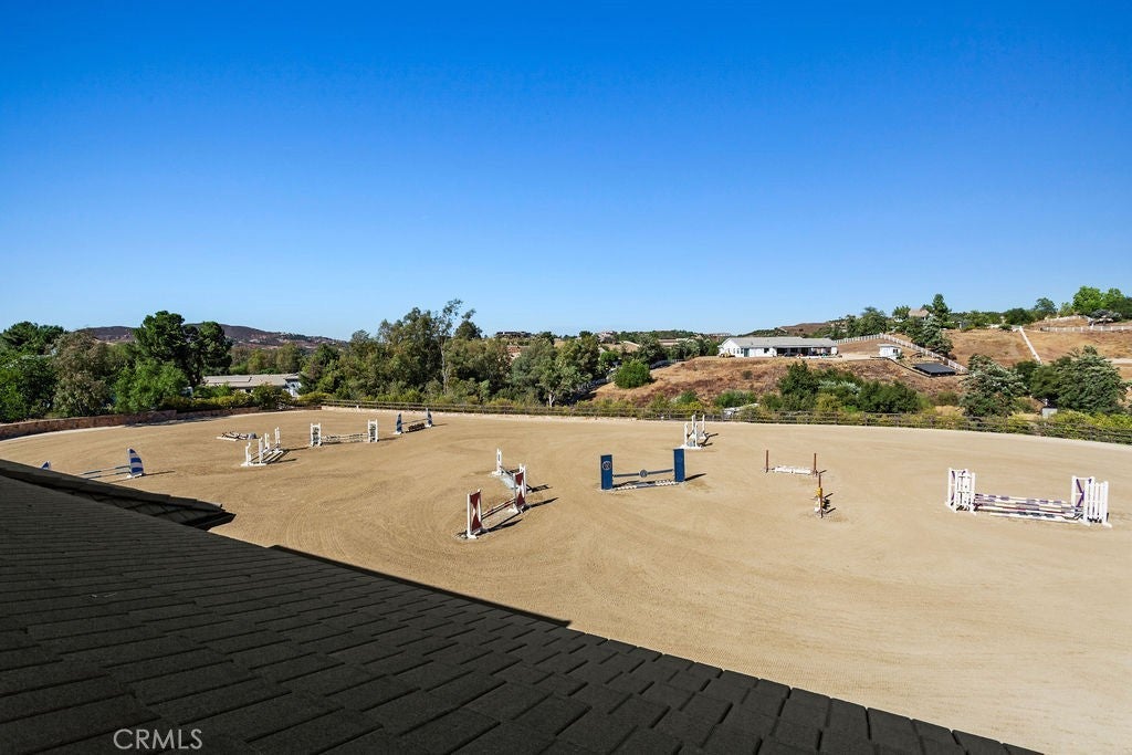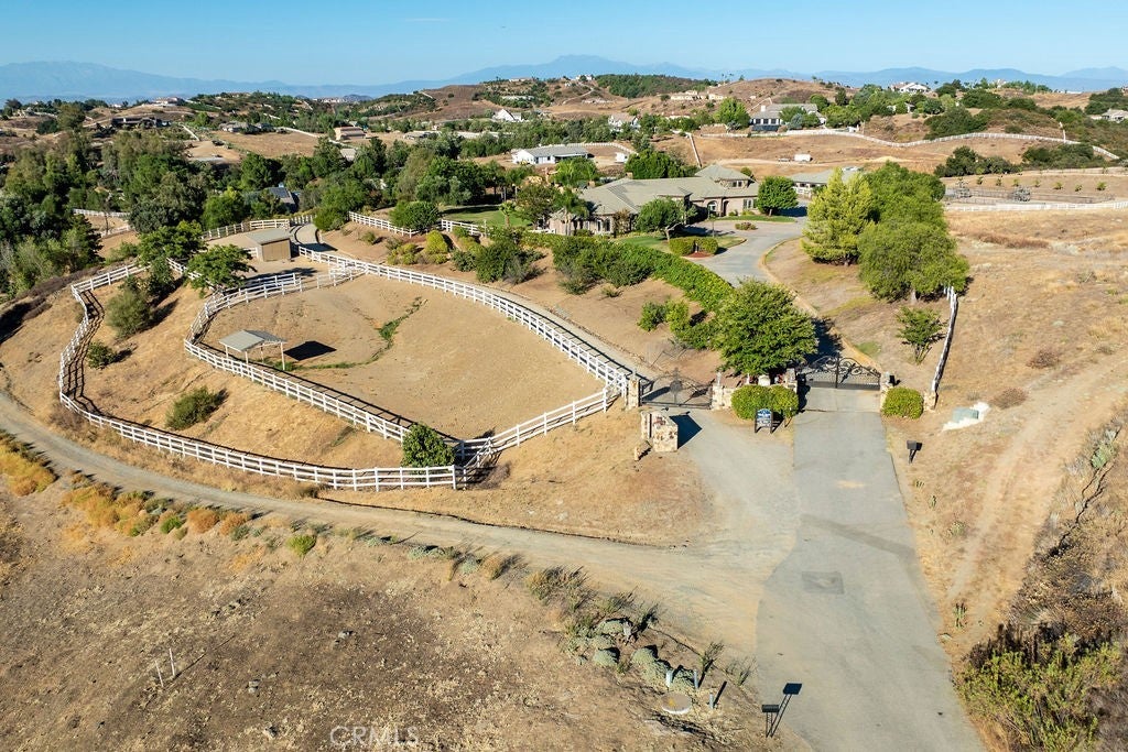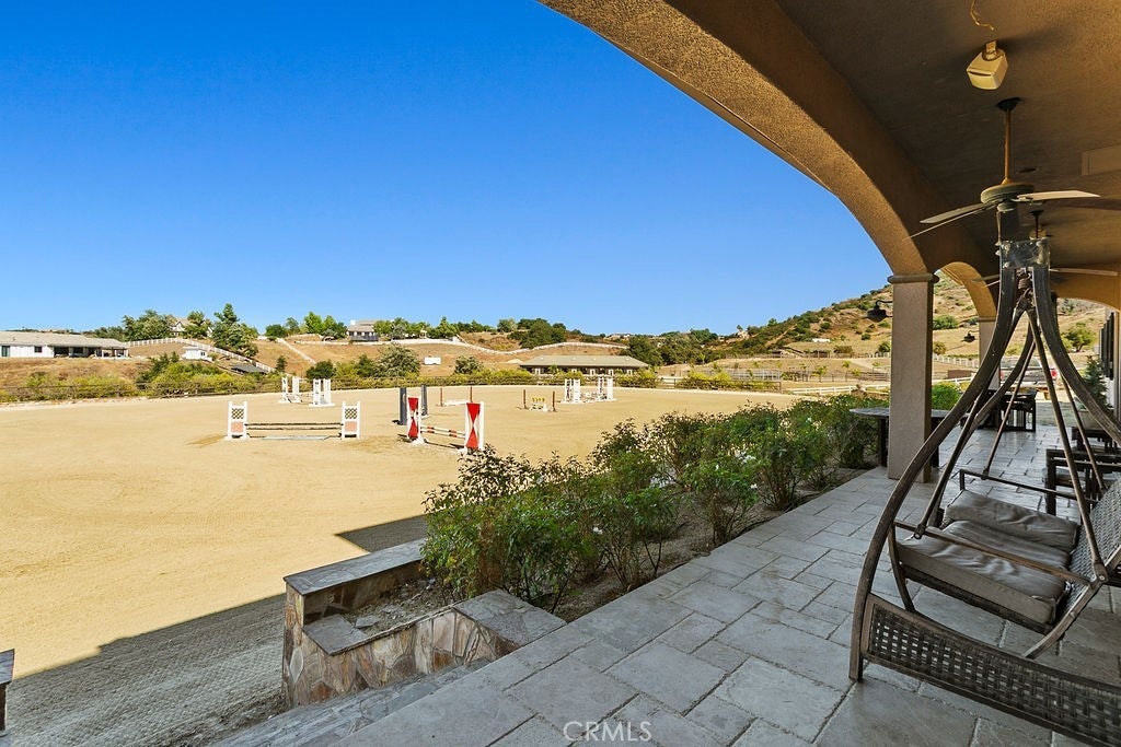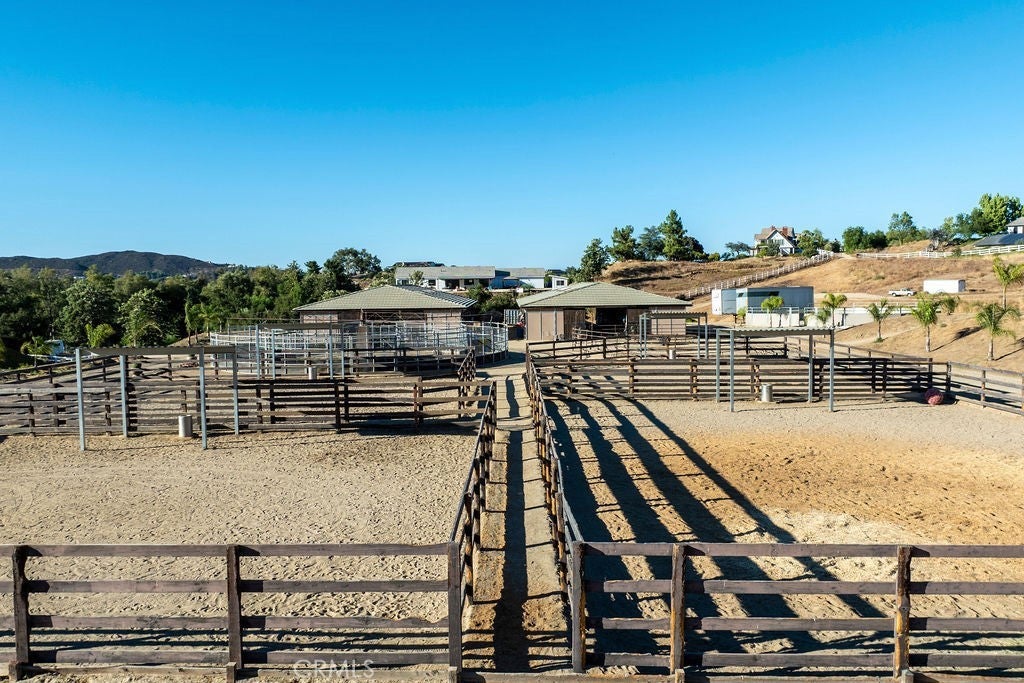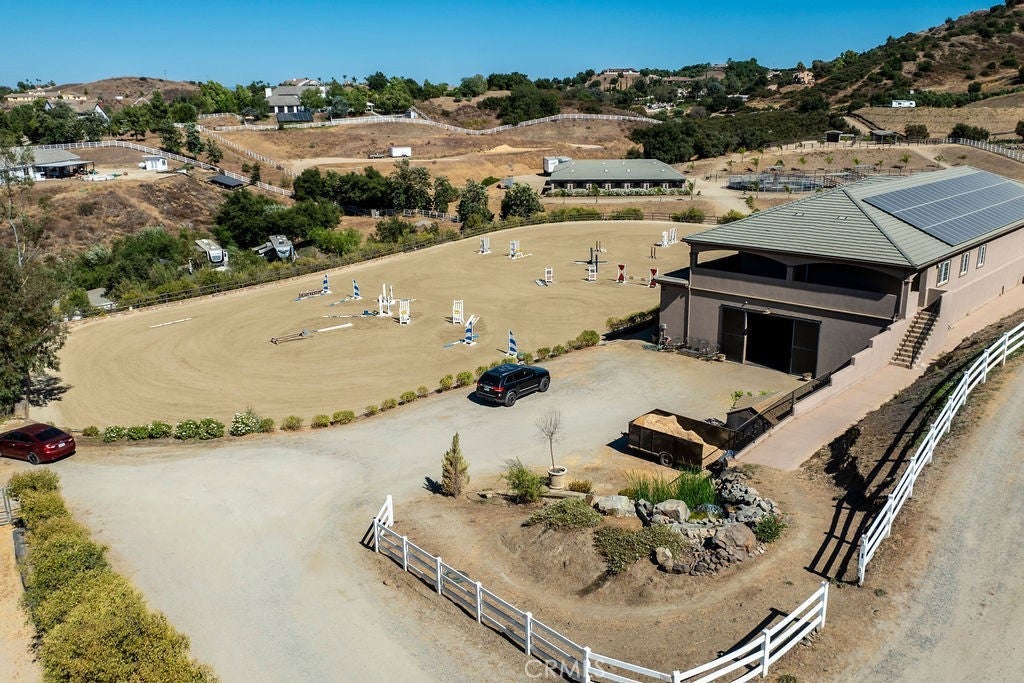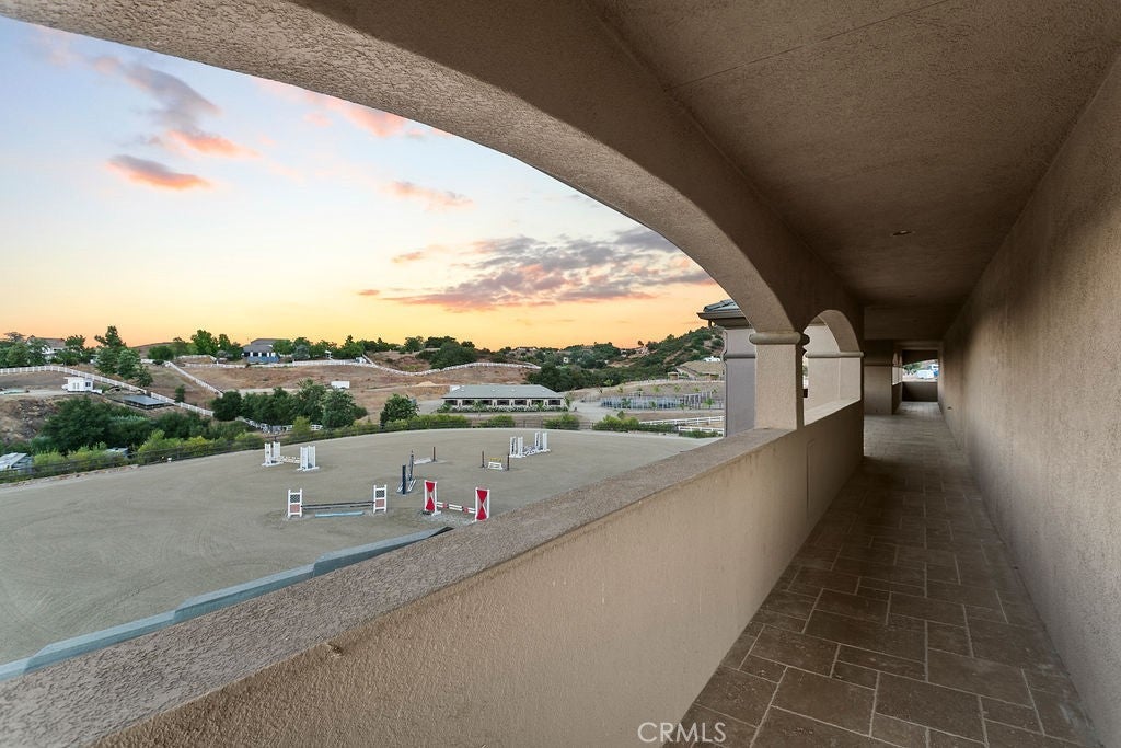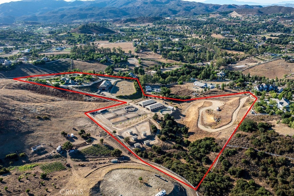 Welcome to “Miracle Ranch” a world-renowned equestrian training facility and luxury estate. Amazing opportunity to own one of the most prestigious panoramic view ranches in sought after La Cresta, high above Murrieta/Temecula, easy access to equestrian shows and events. This Equestrian Dream facility offers even the most discerning buyer an opportunity to have their own personal training center or run a business boarding for trainers and clients. Two separate lots total approx.14.9 acres. One lot can be used for an additional home, indoor arena, further pasture areas or sold off down the road. Enter this completely fenced estate through impressive double entry gates and driveway to a circular courtyard with sprawling single story home on expansive lot. Views from every window, endless lawns, elaborate amusement park type double pool with waterfalls, slides, cave, bridge “Tarzan” swing rope and more. Outdoor kitchen, huge patios and entertaining areas. Enter residence through double beveled glass doors to soaring entryway, beautiful formal living room with cozy custom fireplace and French doors to exterior. Large open floor plan, formal dining room for family parties, and spacious library/office area. Stroll along to massive family room with cozy custom fireplace, built-ins, bay window eating nook and chefs delight kitchen with top of line appliances (Wolf/Sub Zero), central island, breakfast bar and walk in pantry. Three secondary bedrooms and a 5th bedroom upstairs, presently used as apartment with bathroom, kitchen, balcony and more. The lavish primary suite sits in own private wing, offering large sitting area, private deck, double closets, soaking tub, and shower. 4/5 car garage completes the residence. The equestrian facilities are unsurpassed. Main mahogany-built barn with European fronts, 8 stalls: 5 stalls 16x20 and 3 stalls 16x16, double doors each end, top of the line finishes, fire sprinkler system, Nelson Auto waterers, speaker system, chandeliers, grooming stalls, utility area. All stalls have mattress flooring, offer exterior open windows with shutters, fans, barn aisle with rubber flooring, fly system, tack room, alarm, cameras office/feed room, lounge, bar, powder bath and viewing deck overlooking stunning 100’ x 350’ arena, Ebb & Flow under footing watering system, GGT footing. Two additional center aisle barns offer 14 stalls each with similar amenities. Total of “36” stalls. See amenities list for additional information.