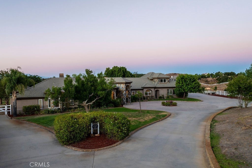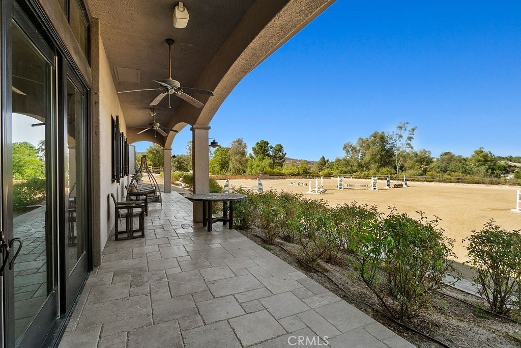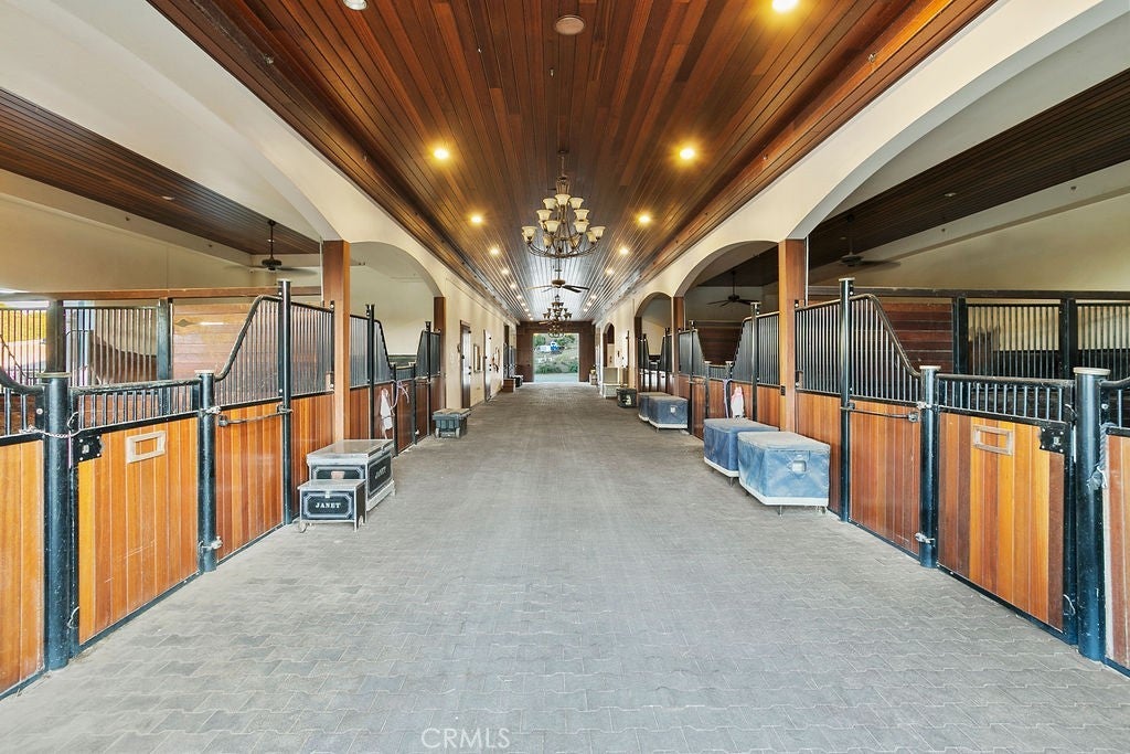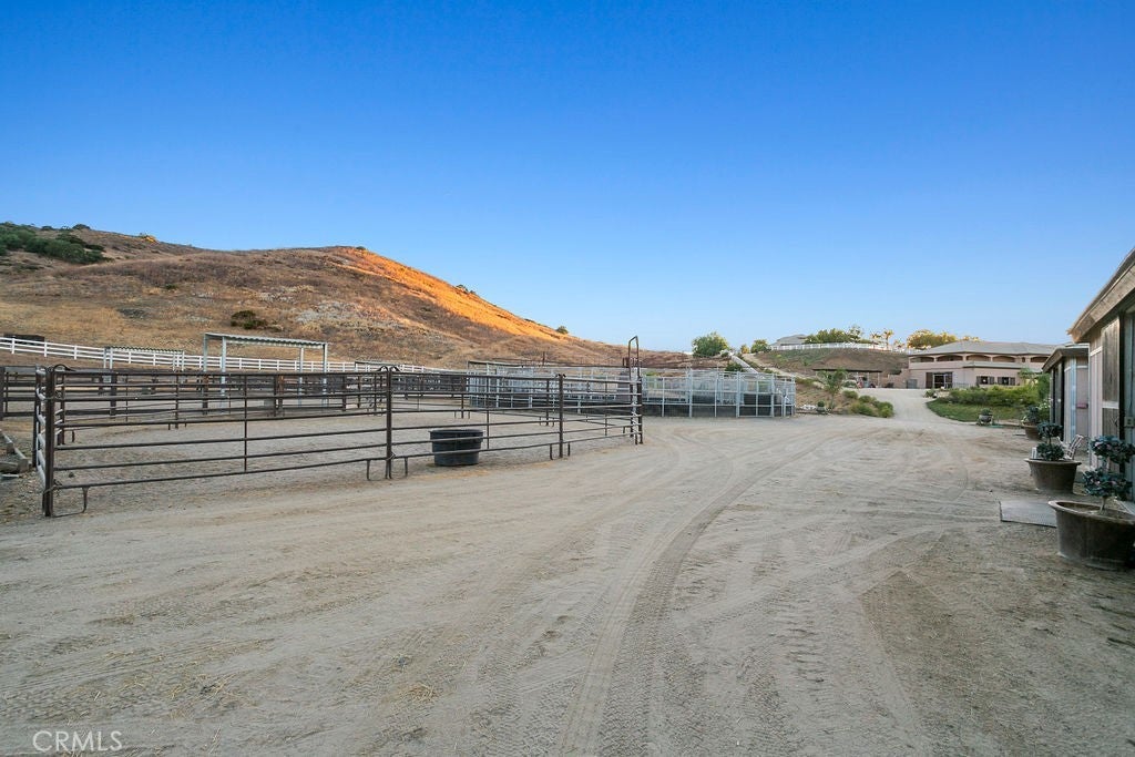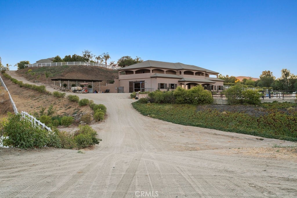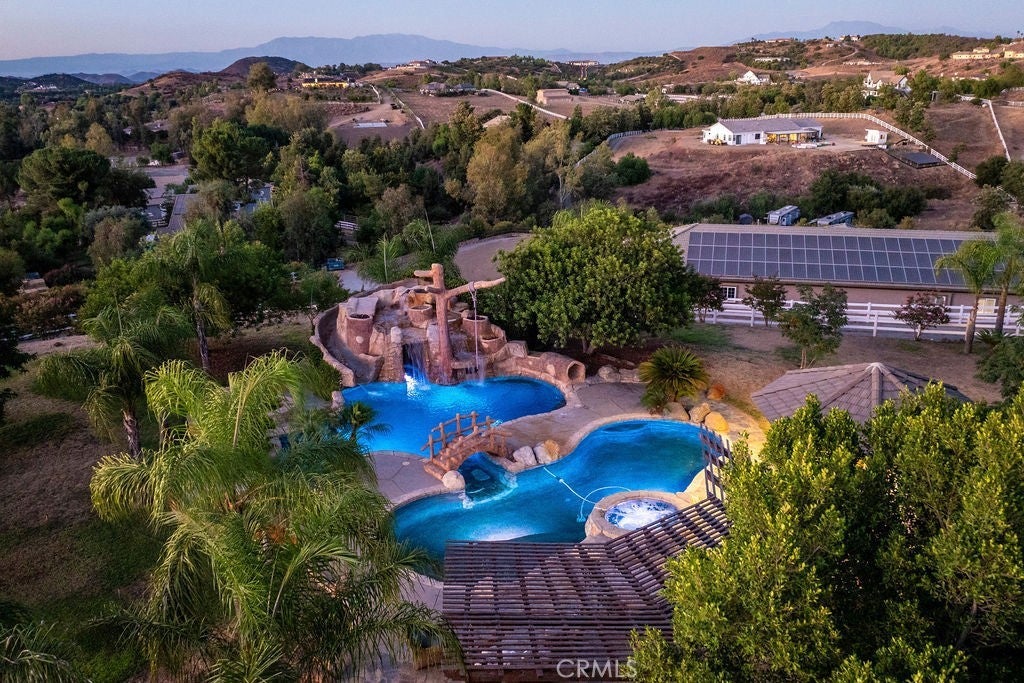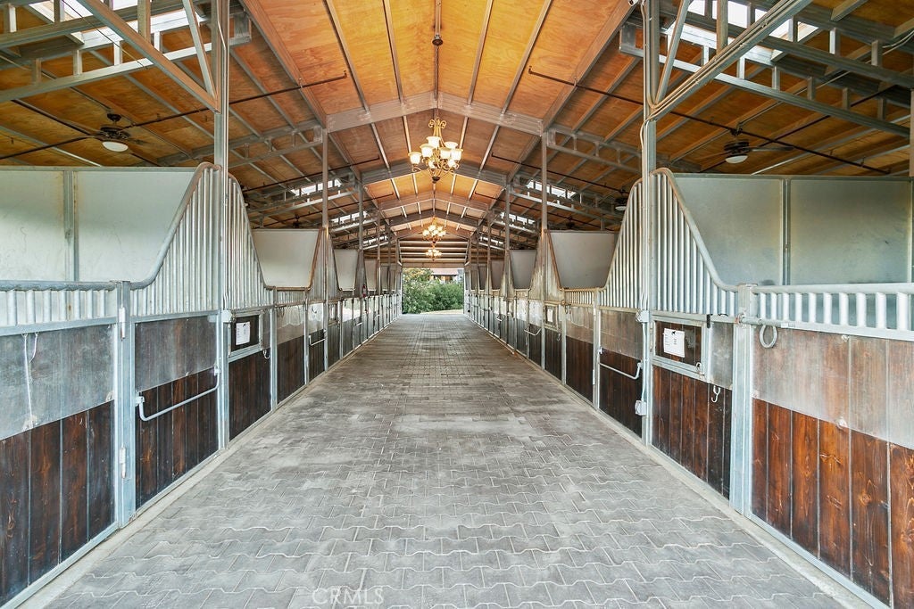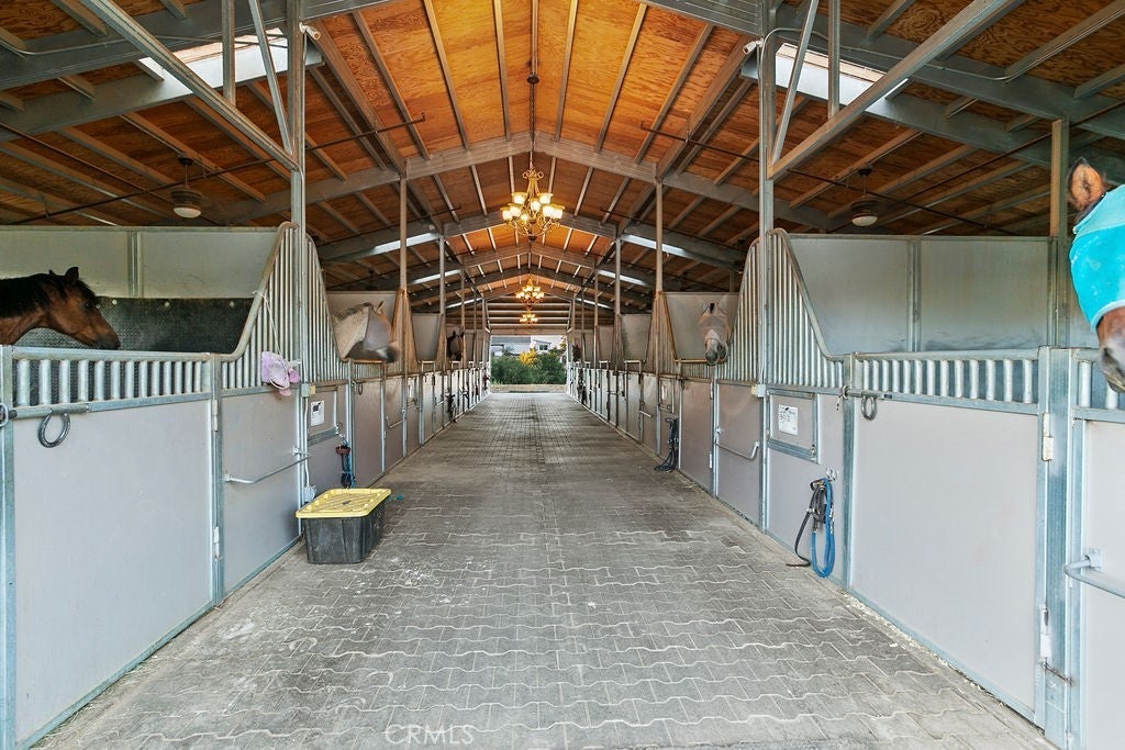 Welcome to “Miracle Ranch” a world-renowned equestrian training facility and luxury estate. Amazing opportunity to own one of the most prestigious panoramic view ranches in sought after La Cresta, high above Murrieta/Temecula, easy access to equestrian shows and events. This Equestrian Dream facility offers even the most discerning buyer an opportunity to have their own personal training center or run a business boarding for trainers and clients. Two separate lots total approx.14.9 acres. One lot can be used for an additional home, indoor arena, further pasture areas or sold off down the road. Enter this completely fenced estate through impressive double entry gates and driveway to a circular courtyard with sprawling single story home on expansive lot. Views from every window, endless lawns, elaborate amusement park type double pool with waterfalls, slides, cave, bridge “Tarzan” swing rope and more. Outdoor kitchen, huge patios and entertaining areas. Enter residence through double beveled glass doors to soaring entryway, beautiful formal living room with cozy custom fireplace and French doors to exterior. Large open floor plan, formal dining room for family parties, and spacious library/office area. Stroll along to massive family room with cozy custom fireplace, built-ins, bay window eating nook and chefs delight kitchen with top of line appliances (Wolf/Sub Zero), central island, breakfast bar and walk in pantry. Three secondary bedrooms and a 5th bedroom upstairs, presently used as apartment with bathroom, kitchen, balcony and more. The lavish primary suite sits in own private wing, offering large sitting area, private deck, double closets, soaking tub, and shower. 4/5 car garage completes the residence. The equestrian facilities are unsurpassed. Main mahogany-built barn with European fronts, 8 stalls: 5 stalls 16x20 and 3 stalls 16x16, double doors each end, top of the line finishes, fire sprinkler system, Nelson Auto waterers, speaker system, chandeliers, grooming stalls, utility area. All stalls have mattress flooring, offer exterior open windows with shutters, fans, barn aisle with rubber flooring, fly system, tack room, alarm, cameras office/feed room, lounge, bar, powder bath and viewing deck overlooking stunning 100’ x 350’ arena, Ebb & Flow under footing watering system, GGT footing. Two additional center aisle barns offer 14 stalls each with similar amenities. Total of “36” stalls. See amenities list for additional information.