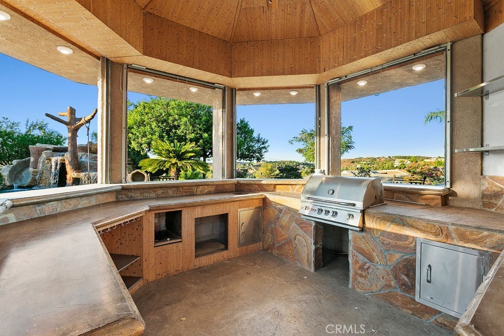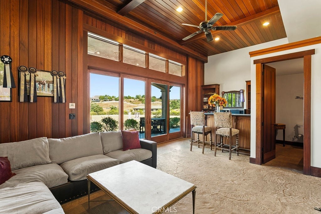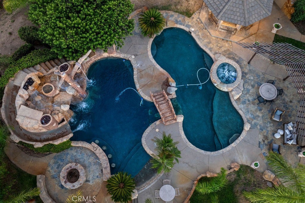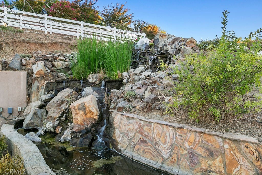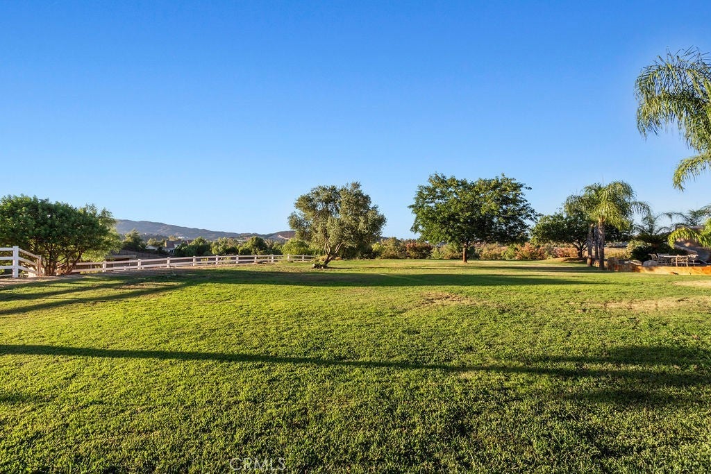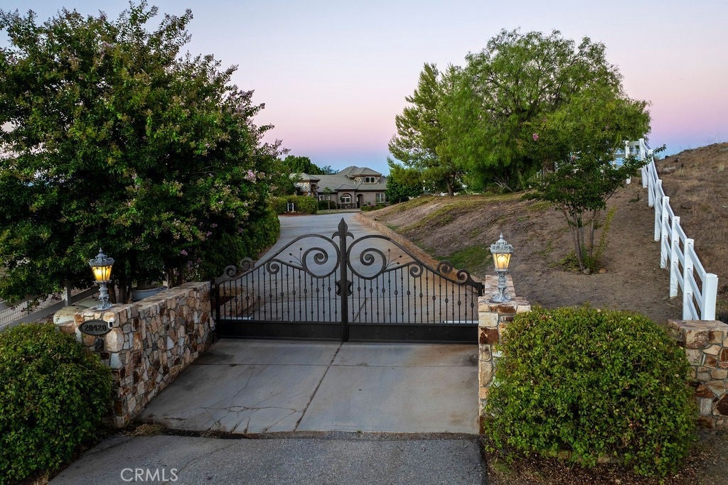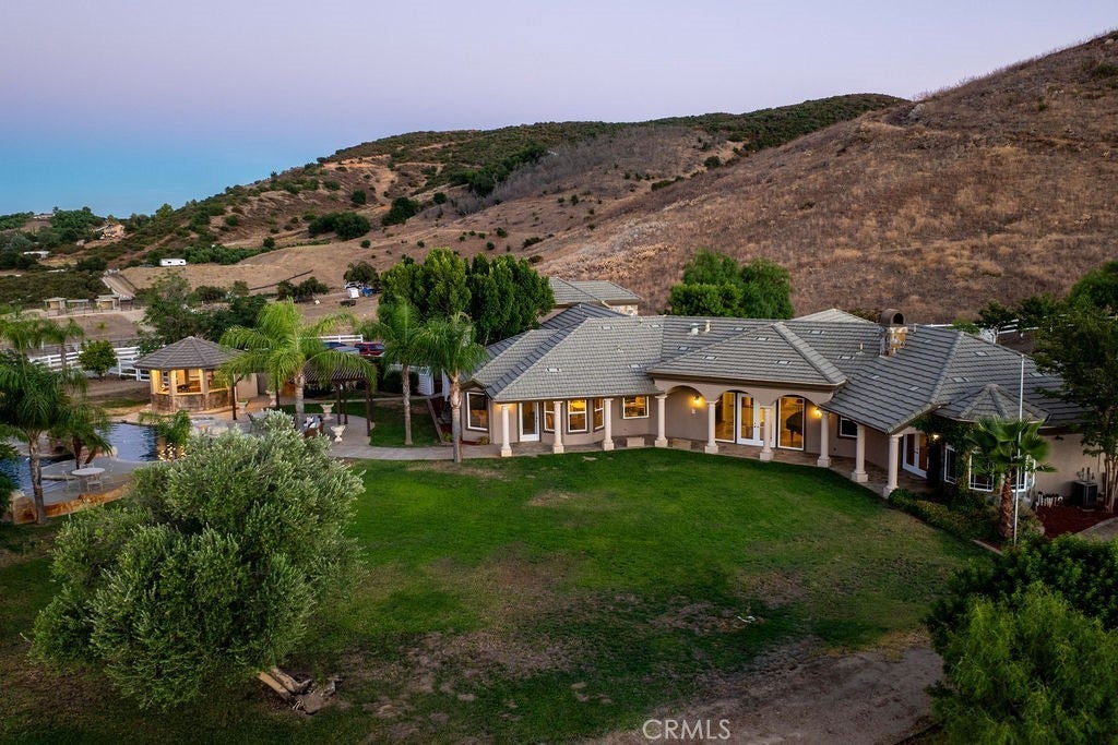 Welcome to “Miracle Ranch” a world-renowned equestrian training facility and luxury estate. Amazing opportunity to own one of the most prestigious panoramic view ranches in sought after La Cresta, high above Murrieta/Temecula, easy access to equestrian shows and events. This Equestrian Dream facility offers even the most discerning buyer an opportunity to have their own personal training center or run a business boarding for trainers and clients. Two separate lots total approx.14.9 acres. One lot can be used for an additional home, indoor arena, further pasture areas or sold off down the road. Enter this completely fenced estate through impressive double entry gates and driveway to a circular courtyard with sprawling single story home on expansive lot. Views from every window, endless lawns, elaborate amusement park type double pool with waterfalls, slides, cave, bridge “Tarzan” swing rope and more. Outdoor kitchen, huge patios and entertaining areas. Enter residence through double beveled glass doors to soaring entryway, beautiful formal living room with cozy custom fireplace and French doors to exterior. Large open floor plan, formal dining room for family parties, and spacious library/office area. Stroll along to massive family room with cozy custom fireplace, built-ins, bay window eating nook and chefs delight kitchen with top of line appliances (Wolf/Sub Zero), central island, breakfast bar and walk in pantry. Three secondary bedrooms and a 5th bedroom upstairs, presently used as apartment with bathroom, kitchen, balcony and more. The lavish primary suite sits in own private wing, offering large sitting area, private deck, double closets, soaking tub, and shower. 4/5 car garage completes the residence. The equestrian facilities are unsurpassed. Main mahogany-built barn with European fronts, 8 stalls: 5 stalls 16x20 and 3 stalls 16x16, double doors each end, top of the line finishes, fire sprinkler system, Nelson Auto waterers, speaker system, chandeliers, grooming stalls, utility area. All stalls have mattress flooring, offer exterior open windows with shutters, fans, barn aisle with rubber flooring, fly system, tack room, alarm, cameras office/feed room, lounge, bar, powder bath and viewing deck overlooking stunning 100’ x 350’ arena, Ebb & Flow under footing watering system, GGT footing. Two additional center aisle barns offer 14 stalls each with similar amenities. Total of “36” stalls. See amenities list for additional information.