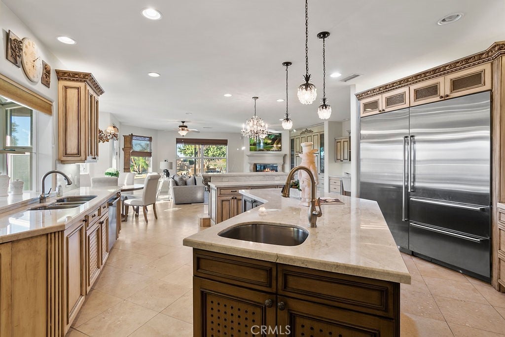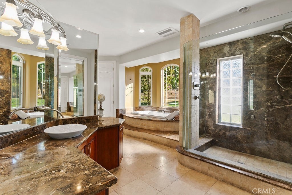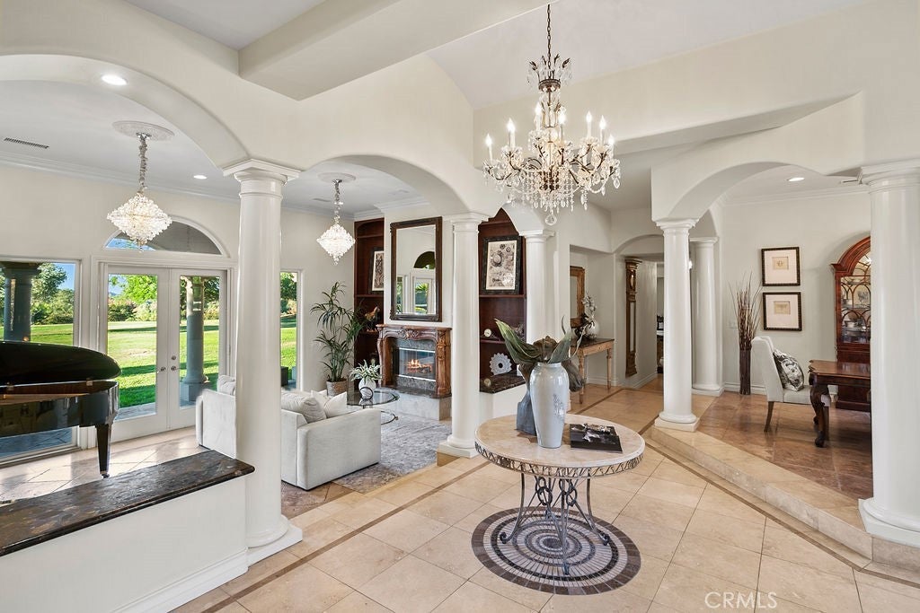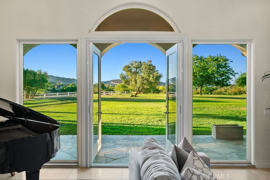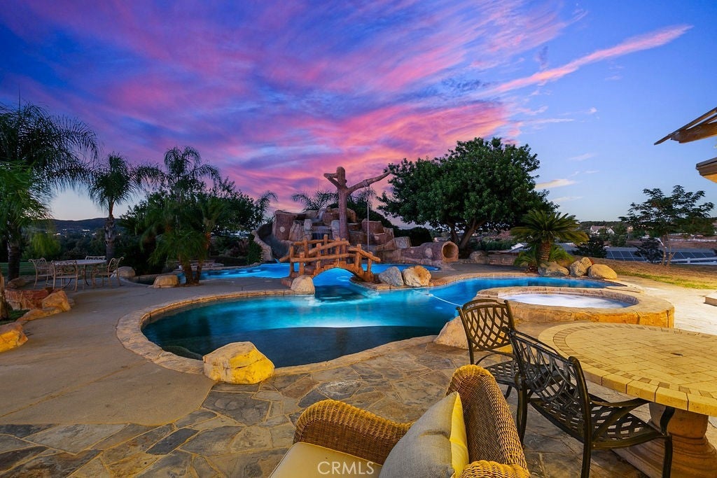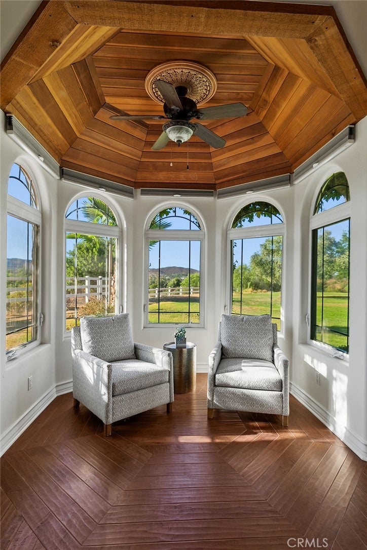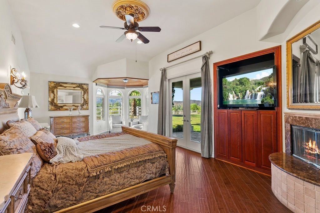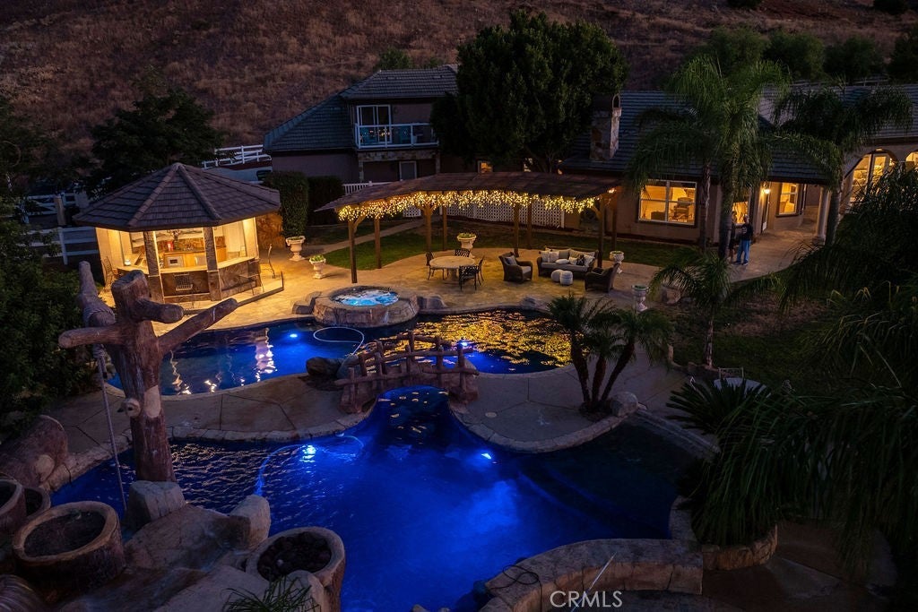 Welcome to “Miracle Ranch” a world-renowned equestrian training facility and luxury estate. Amazing opportunity to own one of the most prestigious panoramic view ranches in sought after La Cresta, high above Murrieta/Temecula, easy access to equestrian shows and events. This Equestrian Dream facility offers even the most discerning buyer an opportunity to have their own personal training center or run a business boarding for trainers and clients. Two separate lots total approx.14.9 acres. One lot can be used for an additional home, indoor arena, further pasture areas or sold off down the road. Enter this completely fenced estate through impressive double entry gates and driveway to a circular courtyard with sprawling single story home on expansive lot. Views from every window, endless lawns, elaborate amusement park type double pool with waterfalls, slides, cave, bridge “Tarzan” swing rope and more. Outdoor kitchen, huge patios and entertaining areas. Enter residence through double beveled glass doors to soaring entryway, beautiful formal living room with cozy custom fireplace and French doors to exterior. Large open floor plan, formal dining room for family parties, and spacious library/office area. Stroll along to massive family room with cozy custom fireplace, built-ins, bay window eating nook and chefs delight kitchen with top of line appliances (Wolf/Sub Zero), central island, breakfast bar and walk in pantry. Three secondary bedrooms and a 5th bedroom upstairs, presently used as apartment with bathroom, kitchen, balcony and more. The lavish primary suite sits in own private wing, offering large sitting area, private deck, double closets, soaking tub, and shower. 4/5 car garage completes the residence. The equestrian facilities are unsurpassed. Main mahogany-built barn with European fronts, 8 stalls: 5 stalls 16x20 and 3 stalls 16x16, double doors each end, top of the line finishes, fire sprinkler system, Nelson Auto waterers, speaker system, chandeliers, grooming stalls, utility area. All stalls have mattress flooring, offer exterior open windows with shutters, fans, barn aisle with rubber flooring, fly system, tack room, alarm, cameras office/feed room, lounge, bar, powder bath and viewing deck overlooking stunning 100’ x 350’ arena, Ebb & Flow under footing watering system, GGT footing. Two additional center aisle barns offer 14 stalls each with similar amenities. Total of “36” stalls. See amenities list for additional information.