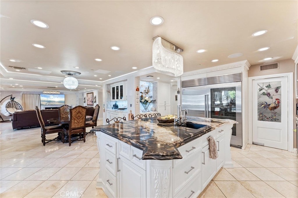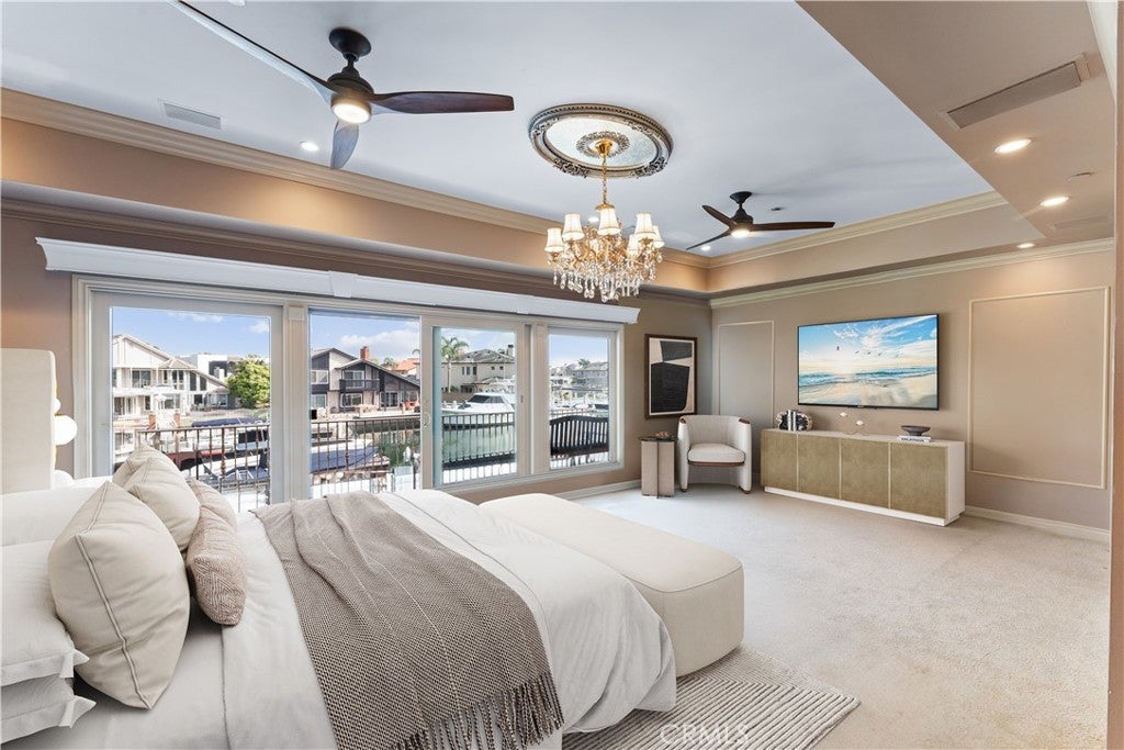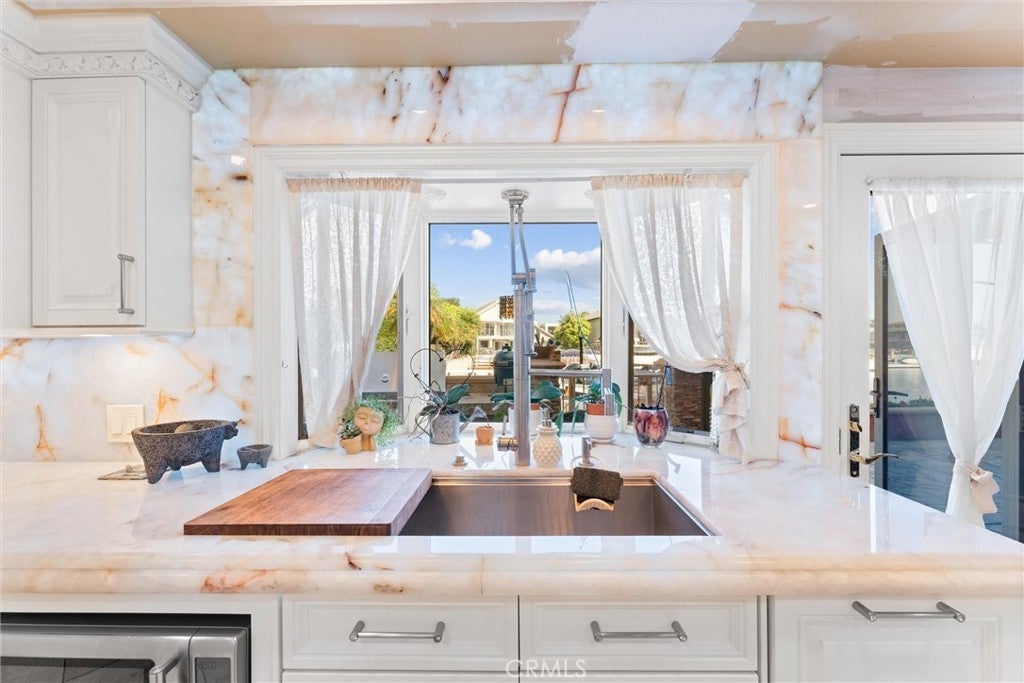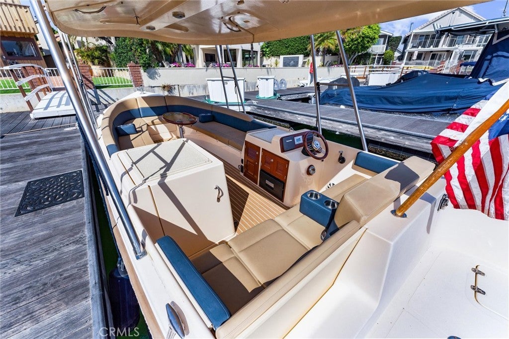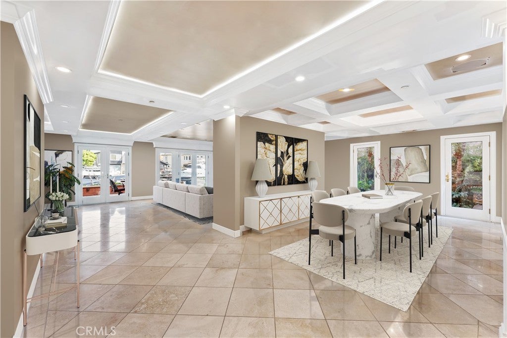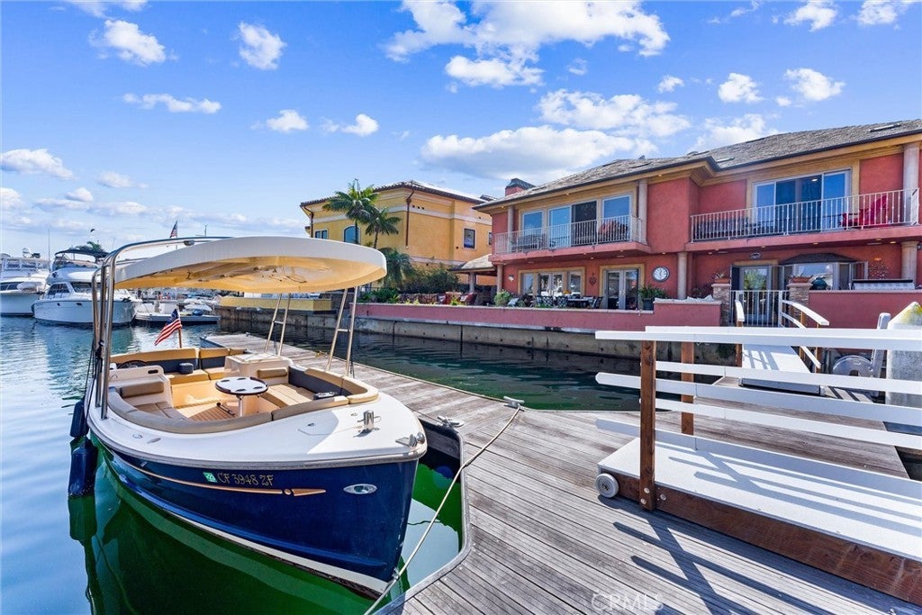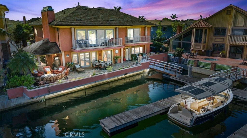 Introducing a stunning waterfront property in the picturesque enclave of Huntington Harbor's desirable Trinidad Island, located on a quiet cul-de-sac. Boasting 4706 square feet of living space, this meticulously designed home offers the perfect blend of modern elegance and classic coastal charm. Upon entering, you'll be greeted by a grand foyer adjacent to the living room featuring a 2-story high ceiling. Architectural style coffered ceiling in the spacious formal dining room delivers character and texture. The open concept design seamlessly connects the family room with fireplace, casual eating area and newer gourmet chef's kitchen, equipped with top-of-the line appliances and fixtures, custom cabinetry, quartzite counters with designer lighting behind backsplash, butler's pantry and a spacious island for culinary enthusiasts. This expansive area has French doors and garden window to enjoy panoramic views of the harbor. Step outside to a spacious patio with stone decking, built in BBQ, fire pit, bar area, perfect for al fresco dining and entertaining, all overlooking the canals and private 40' boat dock. The home features 4 generous bedrooms, 3 en-suite bedrooms upstairs, 1 bedroom downstairs. The primary suite is a true retreat, with a private water viewing balcony, spa like bathroom and huge walk-in closet. Media room w/tiered seating, floor to ceiling screen, gaming area and balcony. Downstairs 4th bedroom. ELEVATOR, 3 car extra deep finished garage with 2 tesla fast charging outlets, brand new 75 Gal water heater with circulating pump, and, of course, an electric doggie door! Upgraded smart home electrical system, filtration water softener system throughout. You'll also enjoy the Christmas boat parade! Dont miss the opportunity to make this extraordinary residence your own.