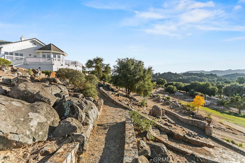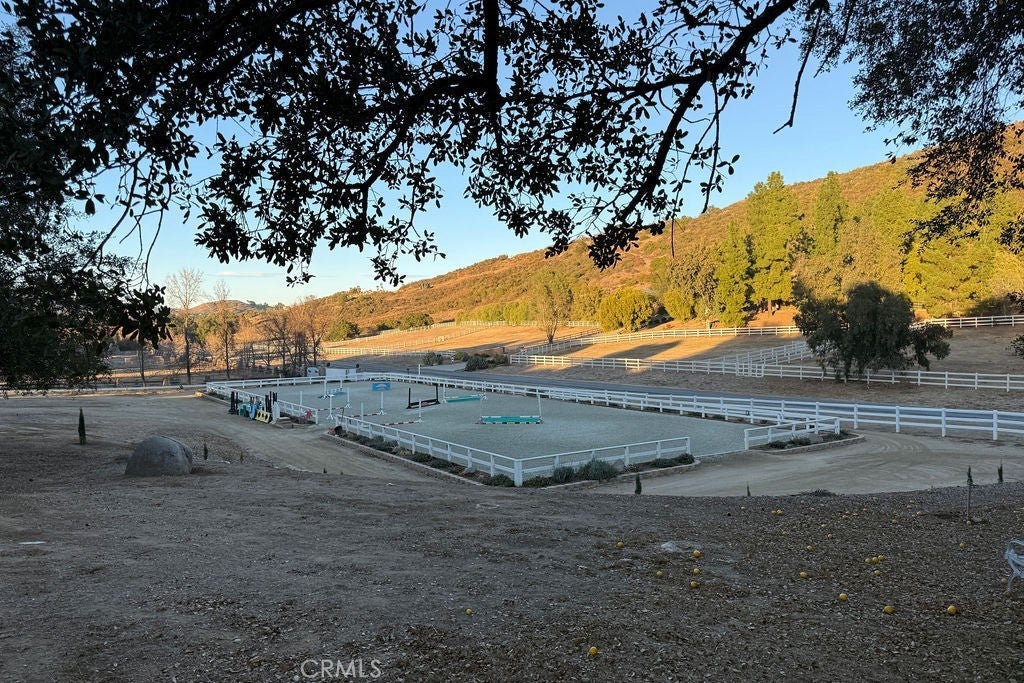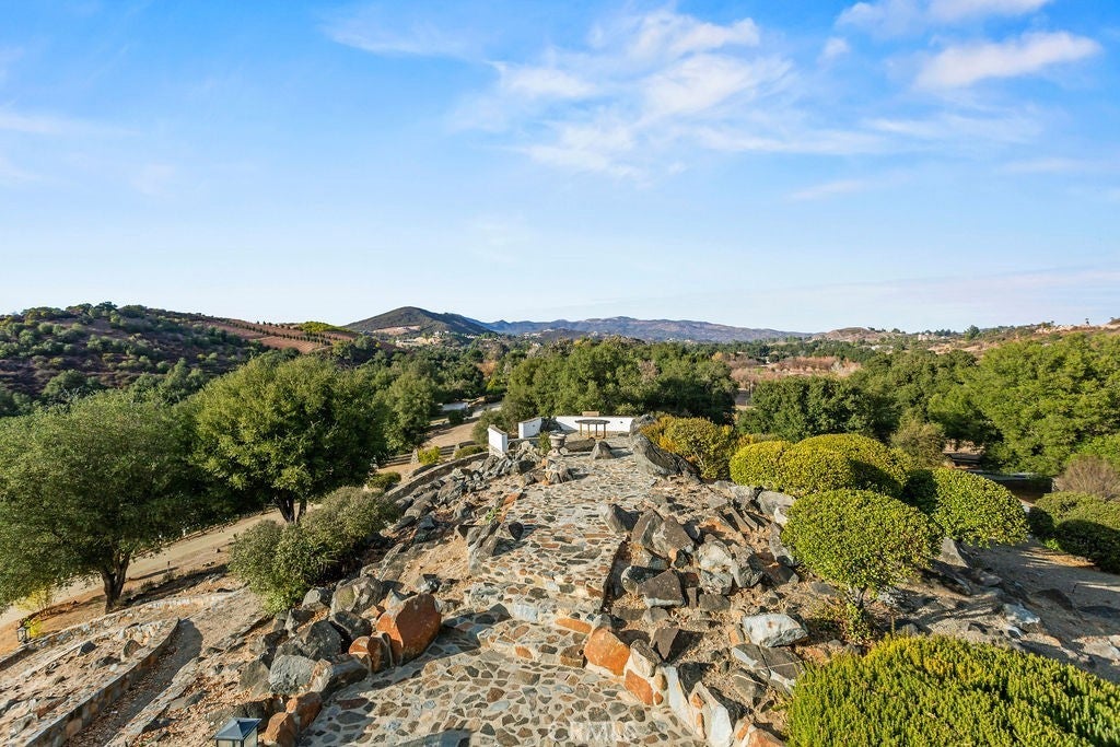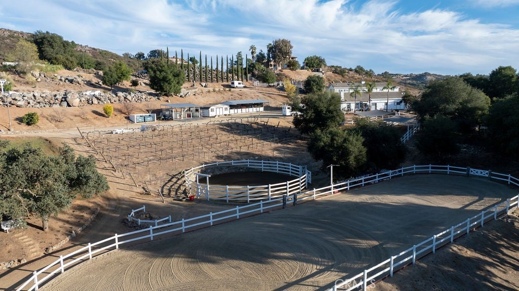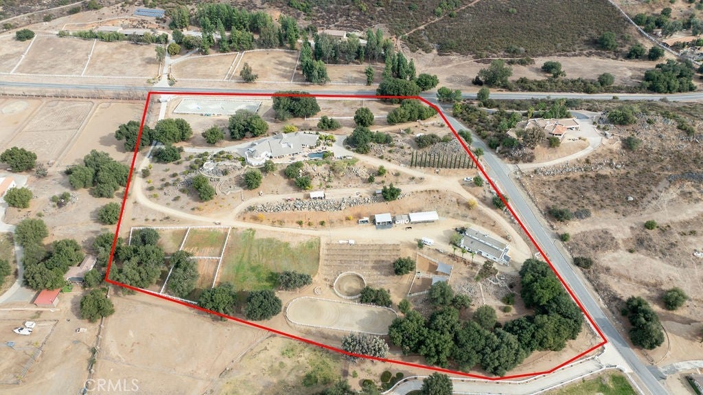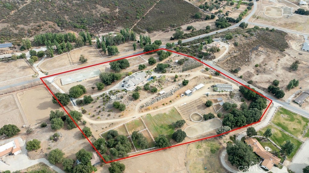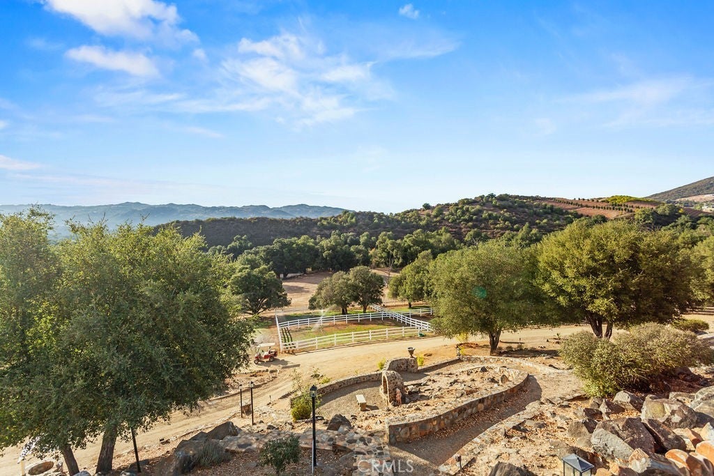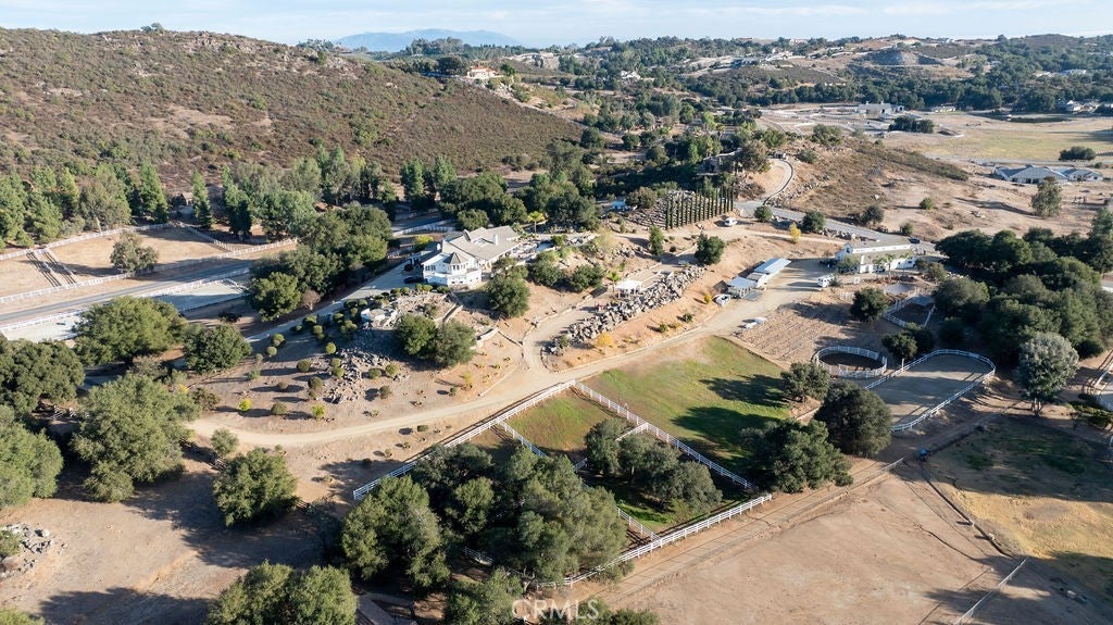 Stunning one of a kind equestrians dream “ view” estate. just over an hour to Orange County and North San Diego. Enter through impressive gated entry up long private driveway. The estate is set up for the professional trainer or personal equine client . Two arenas, one GGT footing, the 2nd arena sand. Round pen, 8 turn outs, 6 with natural oak tree shade, waterers, some grass, white vinyl fencing. Centre Aisle 6 stall barn,auto waterers, fly system, cameras, rubber matting, lookouts, additional 3 stalls, grooming/bathing area. Tack shed and more. The estate has its own shaded riding trail and also access to many miles of riding trails within the area. Small Cabernet Sauvignon vineyard, corn hole and Bocci Ball court ,adjoining gazebo viewing area. Multiple sitting, viewing areas. Expansive Chicken “house”, Italian garden, Zen/prayer area. Many established oaks drape the property with shade and beauty. Three apartment/studios in the barn, parking for multiple vehicles, two automatic security gates.Shade trees, fruit trees and several entryways. Basically Single Story sprawling residence is recently updated with amazing gourmet kitchen with huge center island,2 dishwashers. gas stove, double ovens built in refrigerator and large pantry, opens to grand great room with seoaring ceilings, hand crafted beams, and crackling fireplace, French doors, views from every window. Primary bedroom, 2 walk in closets, fireplace, soaring ceilings and sitting area. Primary bath is stunning , 2 auto toilets, fireplace, romantic tub, grand shower area. Formal dining area has a wall of cabinets and storage with French doors to large patios, formal living area could be a game room or huge office with a wall of bookcases and storage, a bar area and more. Unique Théâtre room has professional seating for 7/8 people. Spacious Secondary bedrooms One with en suite bath and access to the idyllic Koi pond and fountain area. Just one upper viewing room/office/library. Stunning entertainment area with expansive deck, fire pit, fire lights, sparkling spa, infinity pool has waterfall, swim up bar. State of the art outdoor kitchen with t.v. large counters, sit up bars, heater and stainless appliances., BBQ, refrigeration drawers, hot plates/storage area. Outdoor shower, Well ,Koi pond, second fire pit. Spacious three car garage, epoxy,flooring, huge attached storage room, large motor court, drive through road to barn. Several access roads, gates throughout property.