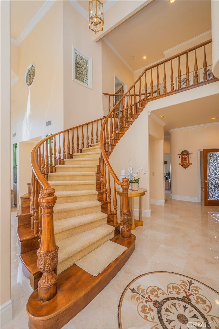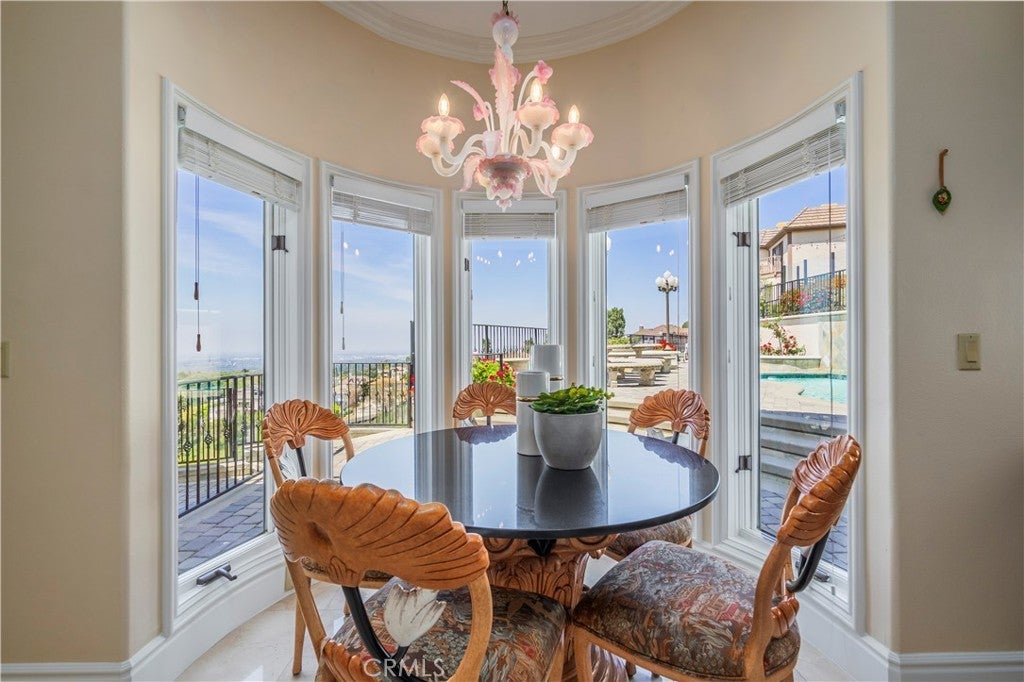 Welcome to 8113 Newcastle Drive, a masterpiece of sophistication and tranquility nestled within the prestigious 24-hour gated enclave of Friendly Hills Estates. This stunning custom-built residence offers breathtaking vistas that stretch from the glittering city lights to the serene beauty of Catalina Island, the majestic Palos Verdes Peninsula, and even the Ocean Rim on a clear day—all from the privacy of your backyard. With 4,730 square feet of living space set on a generous 20,816 square-foot lot, this home is truly a masterpiece. Step into grandeur as you enter a home defined by soaring ceilings and exquisite craftsmanship throughout. The spacious gourmet kitchen is a haven for culinary enthusiasts, featuring high-end built-in appliances, a Sub-Zero refrigerator, water chiller, wine fridge, two pantries, and a center island—all paired with an adjoining eating area that frames mesmerizing views. The formal living room invites you to gather amidst its lofty ceilings, marble flooring, elegant drapery, and granite fireplace, while the family room delivers equal charm with its panoramic city and ocean views, granite fireplace, and access to a balcony leading to the backyard. Downstairs, two guest bedrooms with private bathrooms offer comfort and privacy. Ascend the custom-made curved wood staircase to find an inviting library and luxurious upstairs bedrooms—all complete with private balconies and ensuite bathrooms adorned with marble flooring and granite countertops. The master suite indulges with a lavish bathroom, including a jacuzzi tub, separate shower, double sinks, and walk-in closet. The backyard is a true oasis, boasting unobstructed views, a sparkling pool with a waterfall, built-in fireplace, barbecue, sink, fruit trees, and a dedicated space to plant your own vegetables. A three-car garage offers ample storage. Just minutes away from Friendly Hills Country Club, offering an array of world-class amenities, including a championship golf course, and much more. This extraordinary home embodies elegance, comfort, and luxury in one of the most coveted locations. Don’t miss the chance to experience unparalleled living—welcome to your new sanctuary!