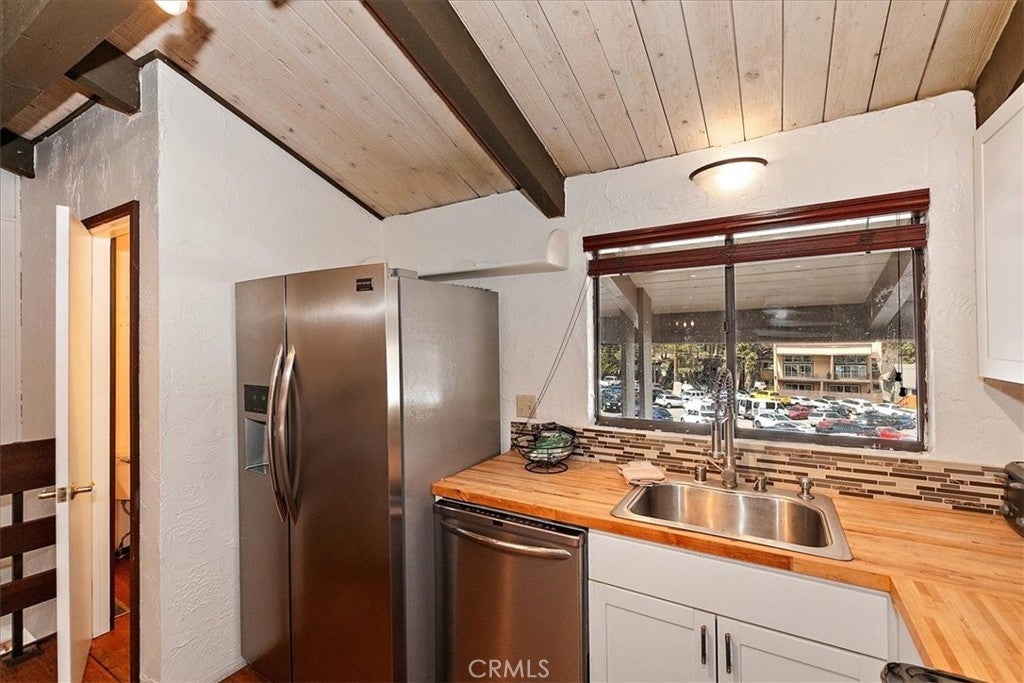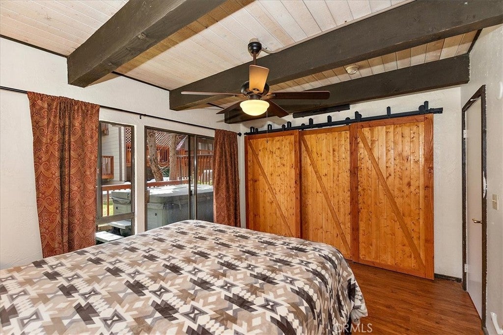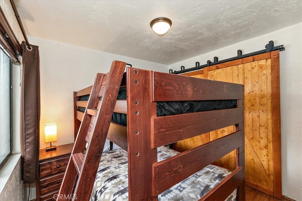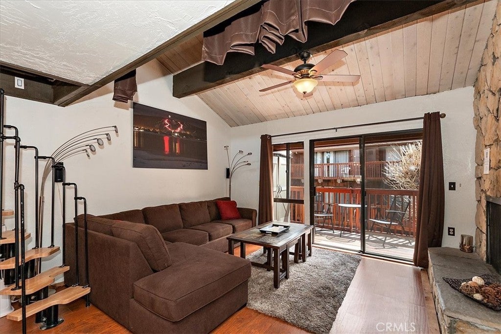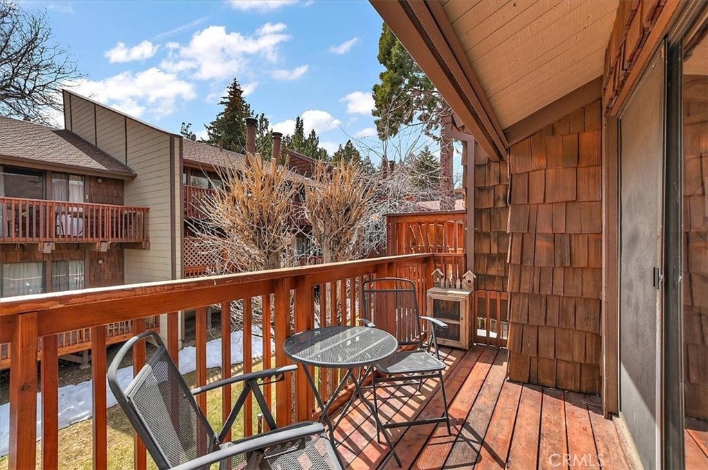 STEPS from the slopes! Prime location at the base of Snow Summit Mountain Resort! Just above Snow Summit parking lot, this complex and end unit offers unbeatable access. The reverse floor plan features a main-level primary bedroom suite with patio, private hot tub and primary bath, secondary bedroom, 3/4 bathroom, and laundry area. Upstairs, enjoy a bright, open living area with a cozy fireplace, deck, vaulted ceilings, bonus loft, well-equipped updated kitchen, and half bath. Each unit has its own parcel number, and HOA covers water, trash, snow removal, Wi-Fi, and exterior maintenance. Amenities include a summer pool, year-round recreation room with a sauna and game room. A true slopeside gem with excellent rental potential!