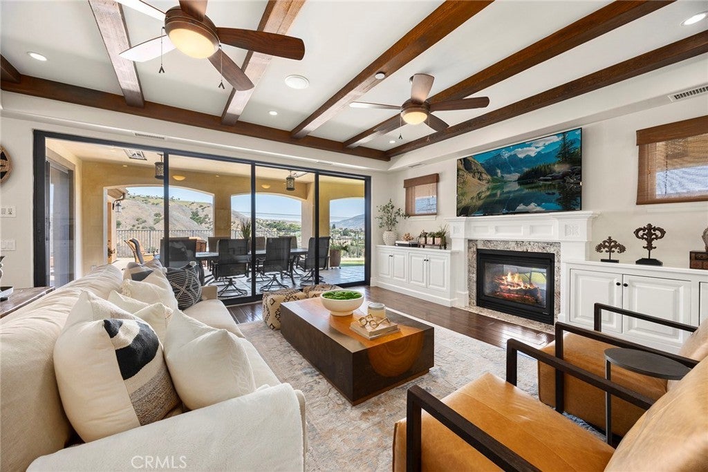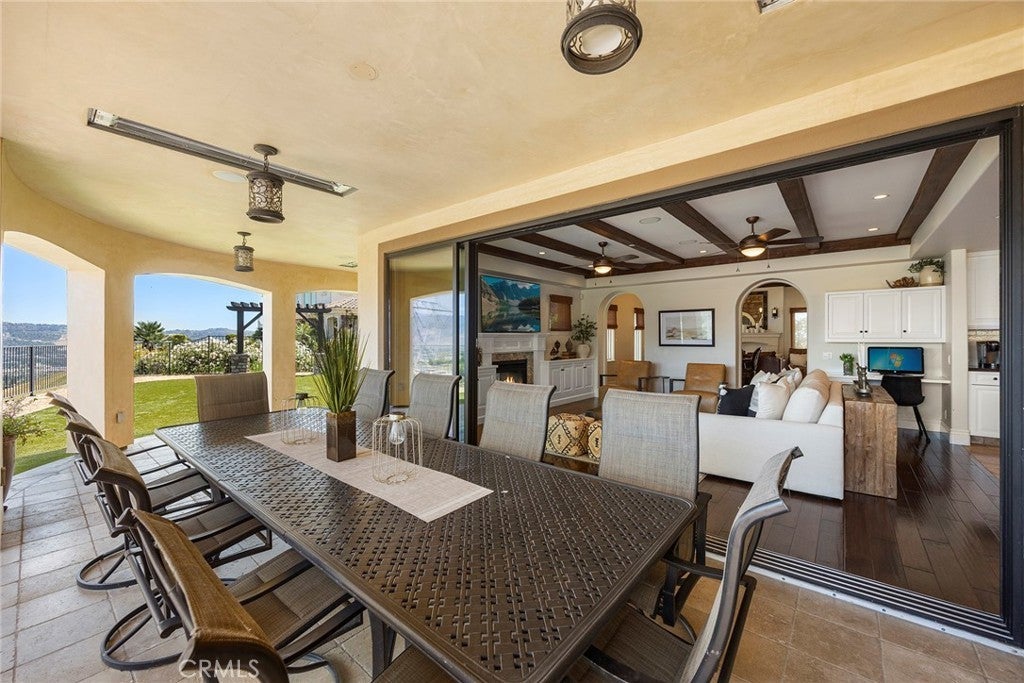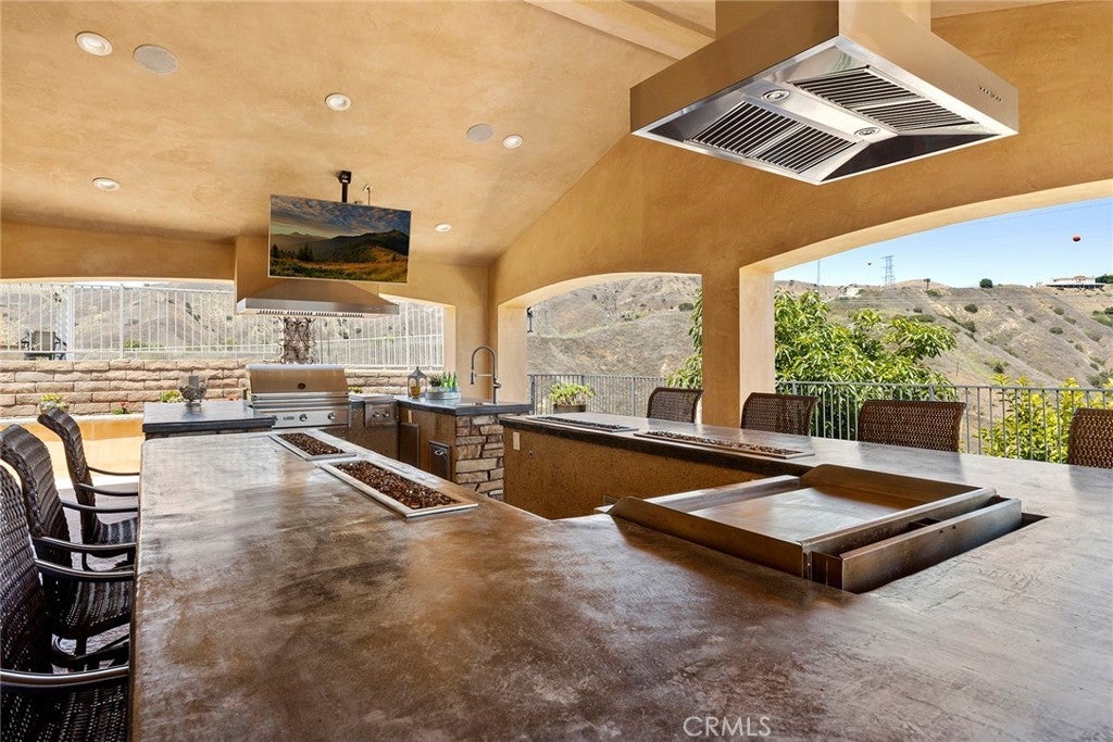 Located up at the top of Stonehaven with a magnificent view, this estate home is ready to enjoy. The amenities draw you to stopping by and admiring what this home has to offer. Just parking out front you see the front fountains and the expanded driveway with gates to the backyard and RV parking. This is a newer build from 2011 with a smooth coat plaster finish. Enter through the glass door into the formal entry. I suggest you turn left and step into the front sitting room with a fireplace and take a seat, immediately you see the wine cabinet with temperature control. Glass doors help to display your collection. With a table to sip with friends or enjoy an intimate meal, this is a special room. Continue the tour into the family room, open to the fantastic kitchen, another fireplace that is see through to the outside and beautiful wood flooring and travertine stone, it is an elegant room. California style doors open to the outside with a scenic view. Now the kitchen area is a chef’s delight with a 6-burner Monogram cooktop, high end Monogram double ovens, microwave, a Kitchen Aid dishwasher and a built-in Monogram refrigerator. A big walk-in pantry and a large island countertop is what you want for your this fine home. Completing the downstairs is a bedroom with a bath, beautifully done and available for guests or family. A laundry room that is the pride of any home with counter space, a sink and storage. Now, upstairs will capture your attention and desires. First, a marvelous primary suite, with fireplace, balcony, high ceilings, two large walk-in closets and a fantastic primary bath. All premium materials with a double sink, separate jetted tub, walk-in shower and a privacy toilet room. This comes with views to take in. Then, the theater room with an attached bath with shower, sink and toilet allowing the theater to be a bedroom. It is a true theater room with video projector, surround sound and an acoustically transparent screen with speakers behind the screen. Two more bedrooms with a loft added (219 sf not permitted) as a fun area and a J&J bathroom. Let’s finish in the backyard that includes an outside kitchen with a BBQ grill AND a Teppanyaki grill, a refrigerator and counter space all around enjoying the view and covered so weather is no issue. Also, a firepit for evening relaxing. A large table accommodates a group for outside dinner. The grassy area can be the space for a pool. So many good reasons to make this your next house. Come and see.