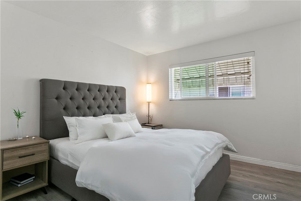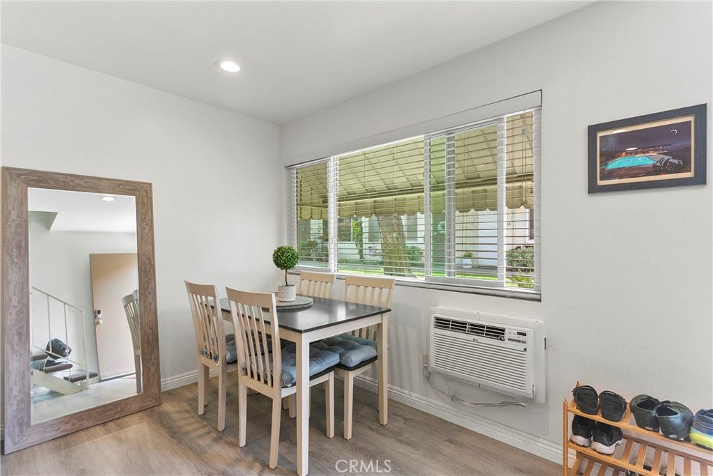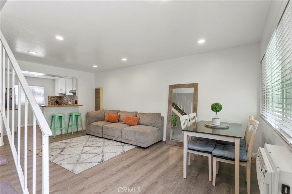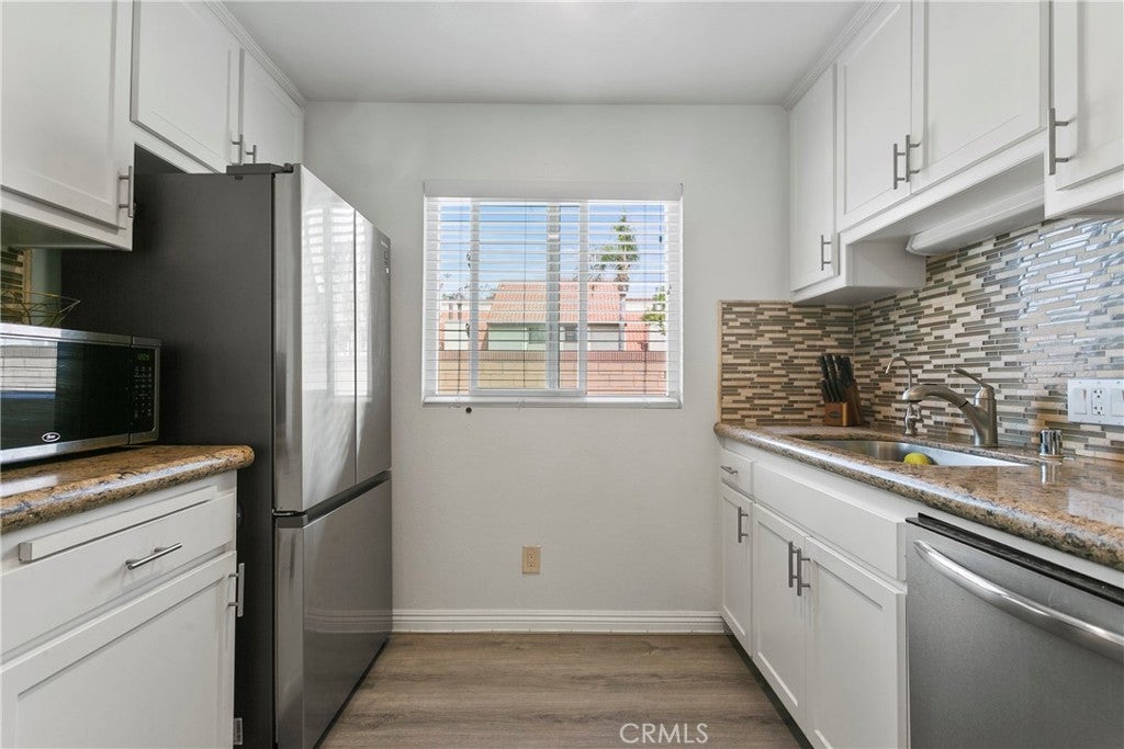Walk into this open floorplan updated condo, complete with newer laminate flooring, newer bathrooms, dual pane windows, blinds, Wall unite A/C and upgraded nice sized kitchen. Open floorplan downstairs boasts a breakfast bar, abundant storage, and recessed lighting. Beautiful kitchen has granite countertops, stone marble backsplash, wood cabinets and Frigidaire Gallery dishwasher and stove. Spacious bedrooms boast roomy closets, with primary bedroom containing additional walk-in closet. Located on the East side of the complex, this unit is tucked in the back of the complex. So private and cozy and is well-positioned for sunlight and shade, with one covered assigned parking space and storage. Unit is near pool and community laundry room. Close to freeways, parks, Whittier Greenway trail and shopping. This part of Pioneer Blvd is more residential and not as busy! HOA covers trash and water. Come see it for yourself!
