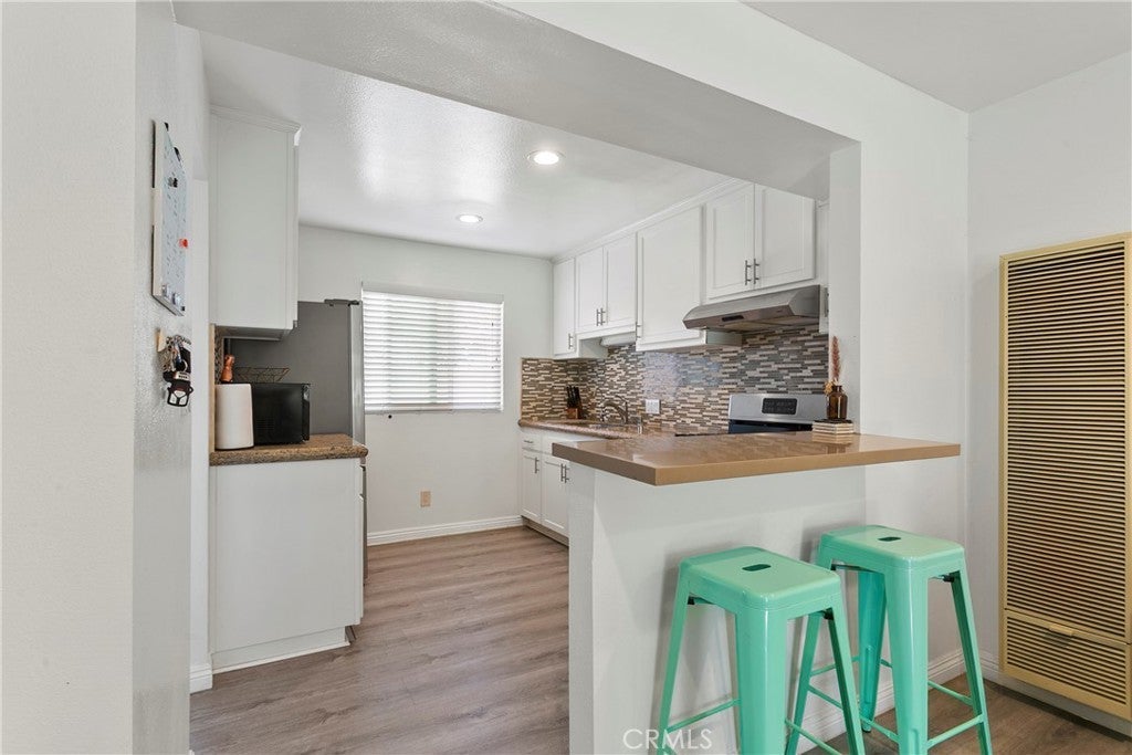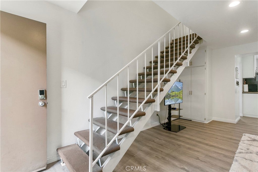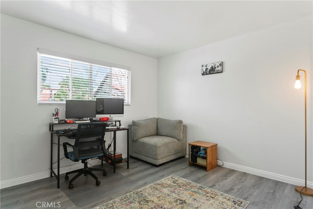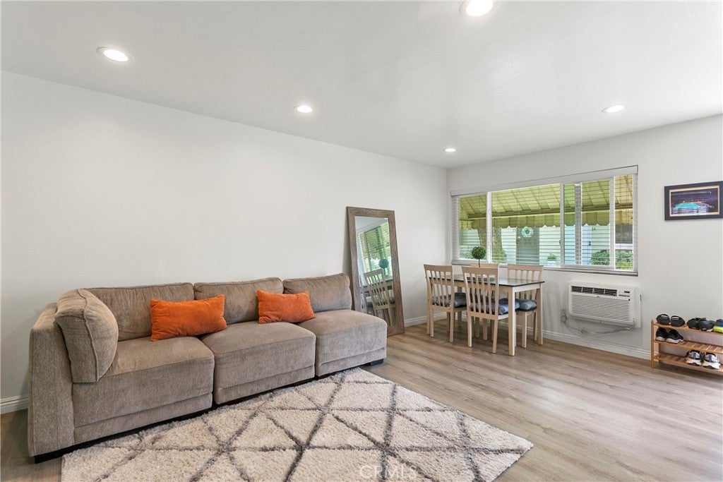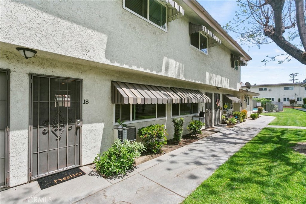 Walk into this open floorplan updated condo, complete with newer laminate flooring, newer bathrooms, dual pane windows, blinds, Wall unite A/C and upgraded nice sized kitchen. Open floorplan downstairs boasts a breakfast bar, abundant storage, and recessed lighting. Beautiful kitchen has granite countertops, stone marble backsplash, wood cabinets and Frigidaire Gallery dishwasher and stove. Spacious bedrooms boast roomy closets, with primary bedroom containing additional walk-in closet. Located on the East side of the complex, this unit is tucked in the back of the complex. So private and cozy and is well-positioned for sunlight and shade, with one covered assigned parking space and storage. Unit is near pool and community laundry room. Close to freeways, parks, Whittier Greenway trail and shopping. This part of Pioneer Blvd is more residential and not as busy! HOA covers trash and water. Come see it for yourself!