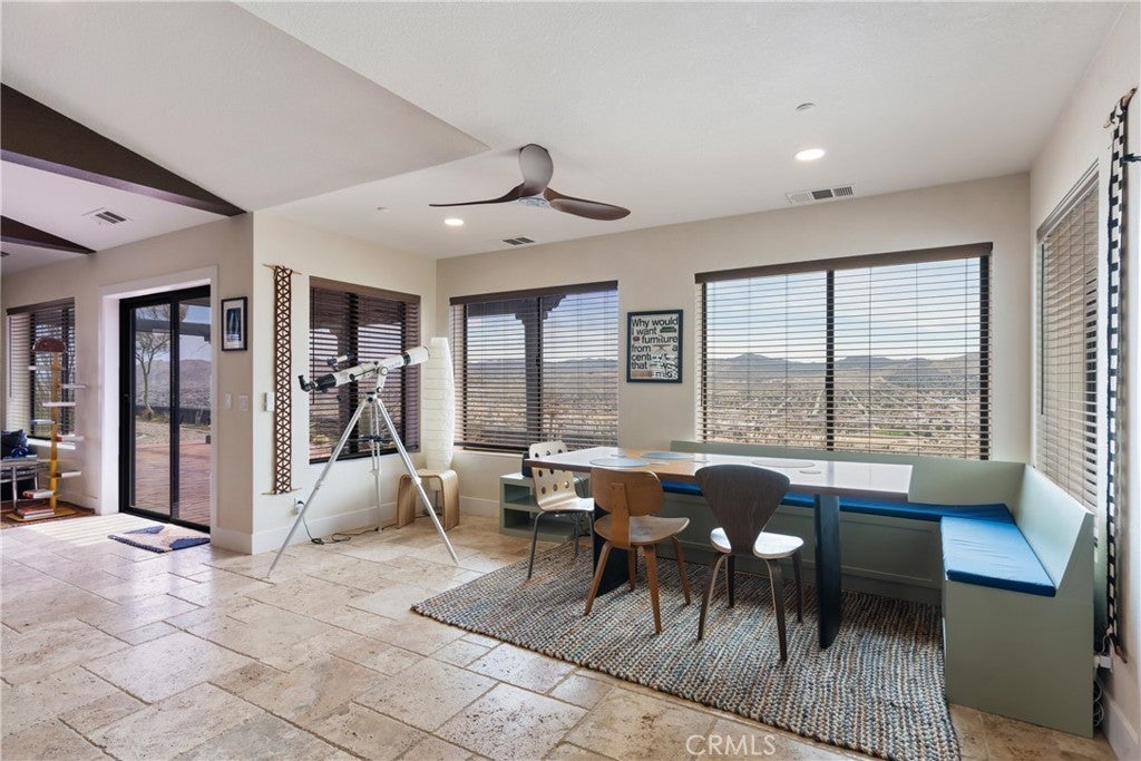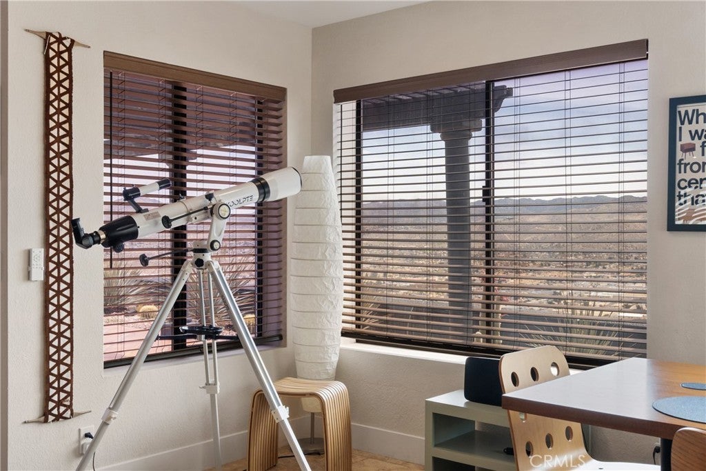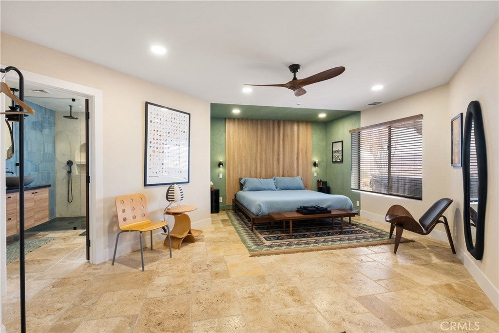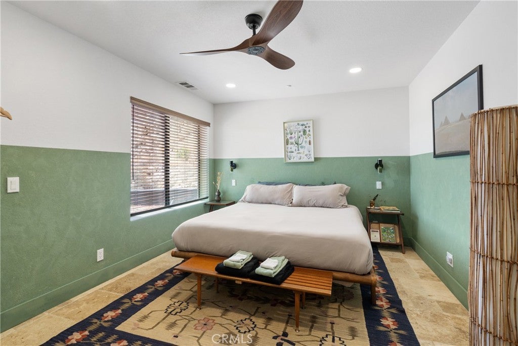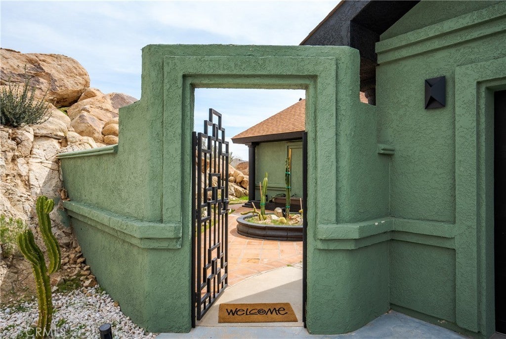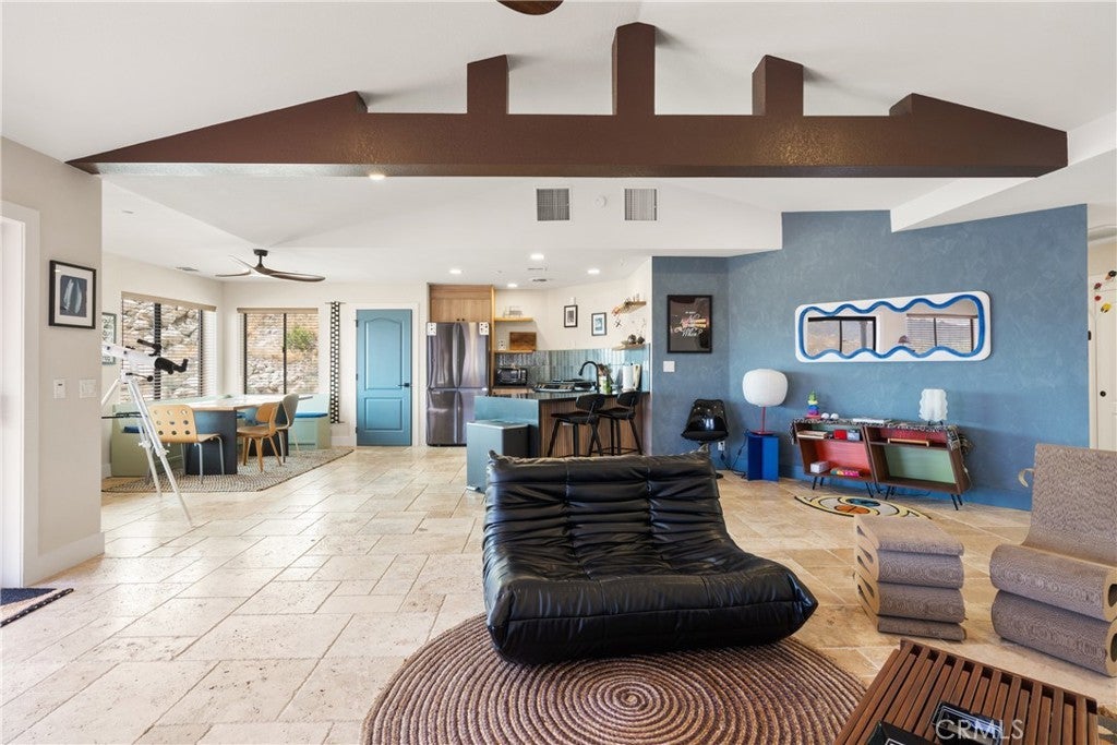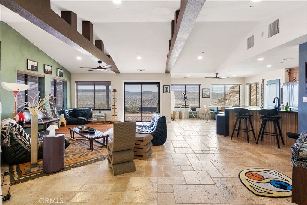 Welcome to this extraordinary creative desert compound in the coveted Western Hills Estates of Yucca Valley—an inspiring, south-facing retreat with unobstructed panoramic views and unmatched privacy. Set on 1.2 acres at the end of a quiet cul-de-sac, this desert gem offers a perfect blend of serenity, space, and soul—just minutes from Joshua Tree National Park. This 3-bedroom, 2-bath home is ideal for artists, remote workers, and desert dreamers alike. The open-concept interior features travertine flooring throughout, with spacious living and dining areas that flow seamlessly into the remodeled kitchen with countertop seating—perfect for entertaining or winding down after a day of exploration. The home has been thoughtfully upgraded, including modernized bathrooms and a beautifully updated kitchen, offering both comfort and style with a contemporary desert flair. Step outside and immerse yourself in natural beauty—native Joshua Trees, boulder formations, cactus gardens, and a serene sitting area perfect for morning coffee or evening reflection. Ample parking includes an extended driveway, street parking, and a two-car garage. With no HOA and full land ownership, this versatile property offers incredible potential as a primary residence, vacation escape, or continued short-term rental investment. A rare opportunity to own a soulful and income-generating desert retreat—come experience the magic of Yucca Valley living.