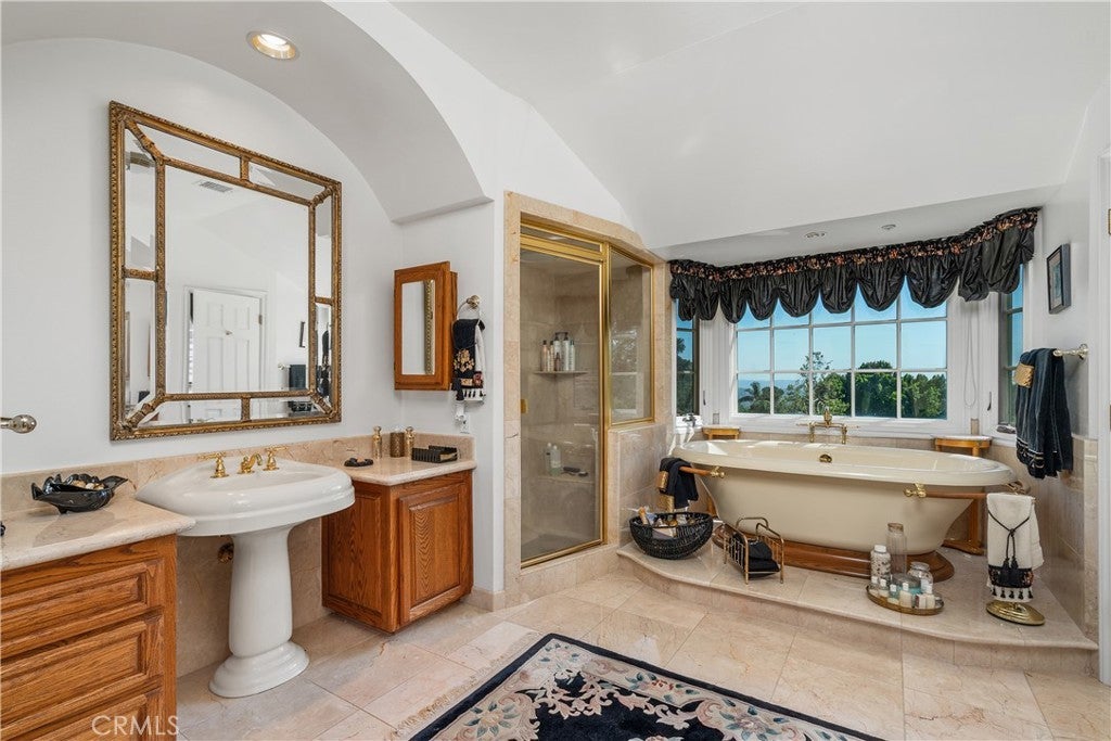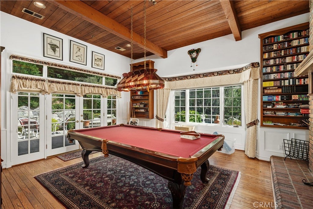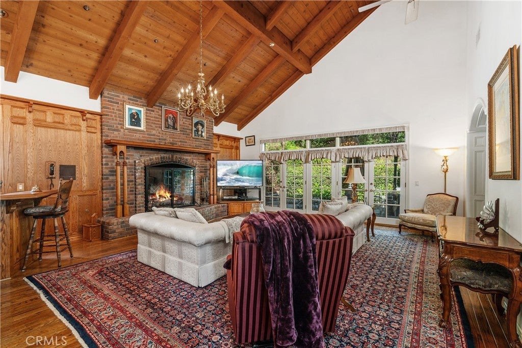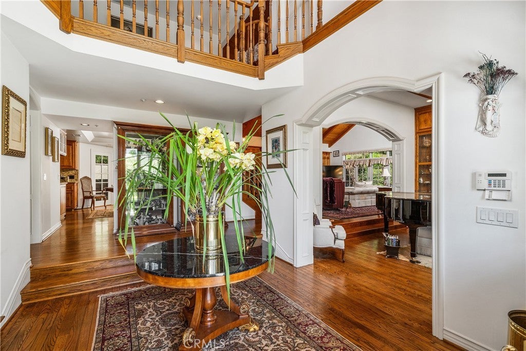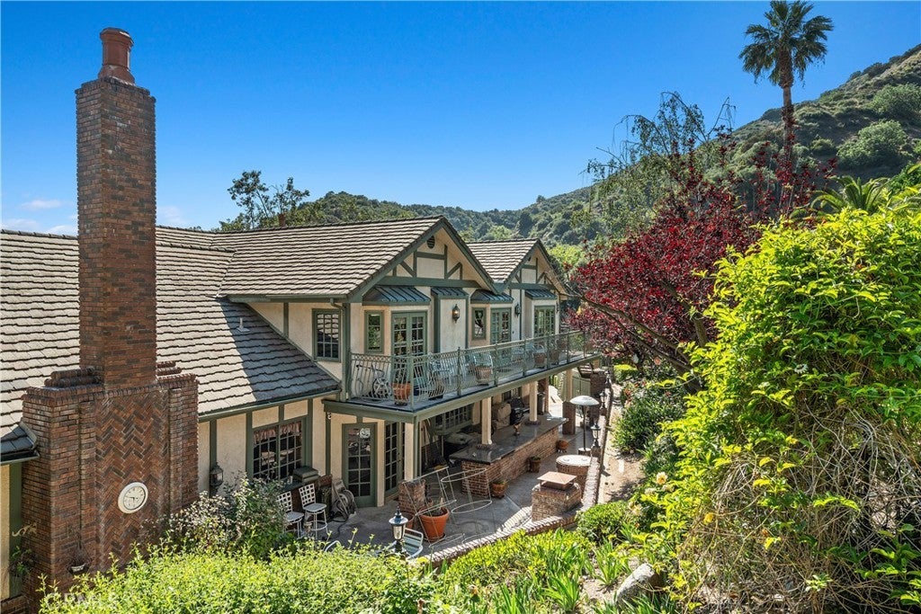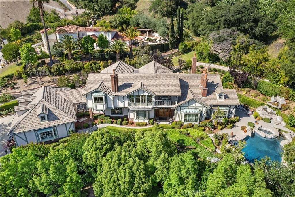 Perched above the Glendora foothills on nearly 4 secluded acres, this exceptional Tudor Revivalist offers architectural distinction, rare acreage, and versatile multigenerational or hospitality use. Be welcomed as you arrive by manicured garden paths and a grand arched entry, and in awe of the craftsmanship and enduring quality. Inside, traditional detailing—including wainscoting, paneled moulding, and beamed ceilings—meets the modern across a series of formal and informal spaces: parlor, dining room, conservatory, and a billiards lounge. The 30-foot vaulted great hall anchors the architectural heart of the home, complete with an immense fireplace and a wet bar adjacent to the chef’s kitchen. Outfitted with double ovens, a Sub-Zero cabinet-front refrigerator, and granite countertops, the kitchen is well-equipped for private living or catered events. French doors connect indoor living to a fully hardscaped outdoor entertaining venue, featuring an extended granite bar, fireplace, and three built-in barbecues. A flowing fountain under a stone bridge leads to a pool and adjacent pool building, complete with its own bathroom and enclosed patio. The estate’s layout supports privacy and optional dual living arrangements. A downstairs guest suite allows for multigenerational accommodations, while the upstairs primary suite features its own fireplace, enclosed balcony, walk-in closet, soaking tub with views, and a Hollywood bathroom. Three additional upstairs bedrooms are connected via a walk-out balcony overlooking the grounds. Additional highlights include a four-car garage with a semi-finished loft overhead, a novel, extended closet-corridor along the roofline, and utility spaces designed for scale. The grounds include two private trails—one leading to a terraced amphitheater, the other to a quiet garden retreat—offering potential for private events. A rose garden and orchid greenhouse create space for horticultural enthusiasts. With its acreage, adaptable layout, and resort-style amenities, this estate presents a rare opportunity for luxury investors—whether seeking a flagship family compound, private retreat, or high value asset in the San Gabriel Valley.