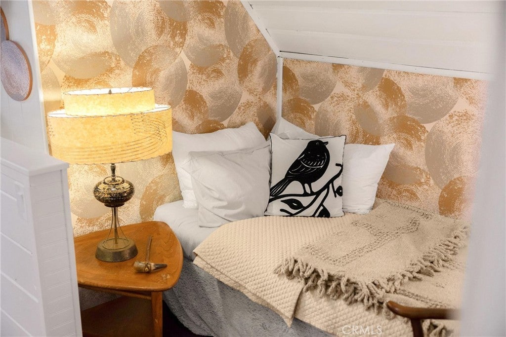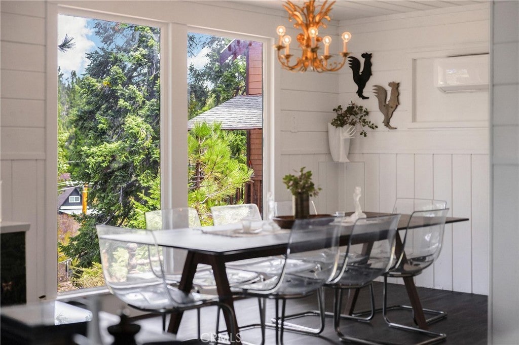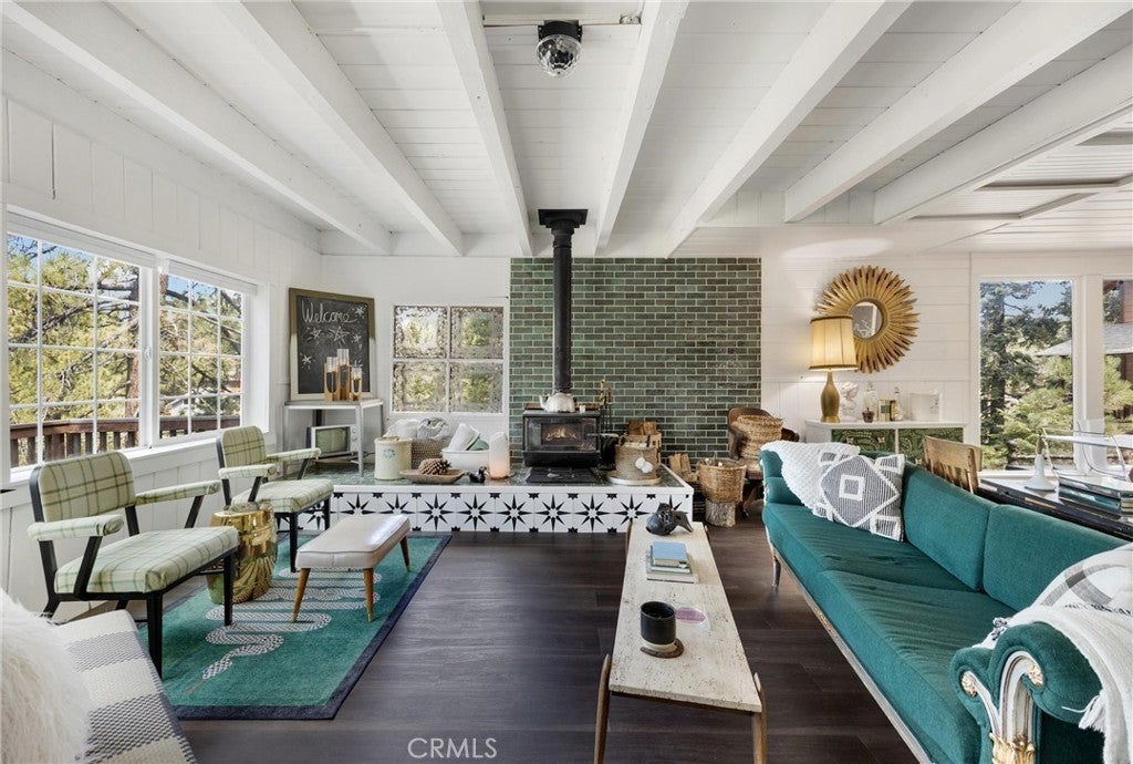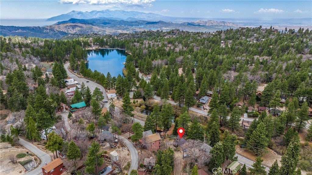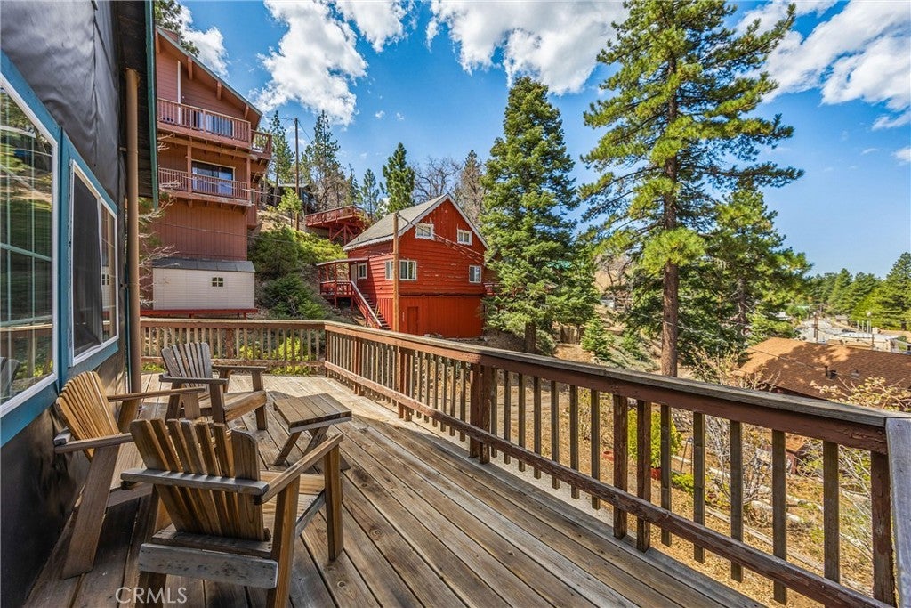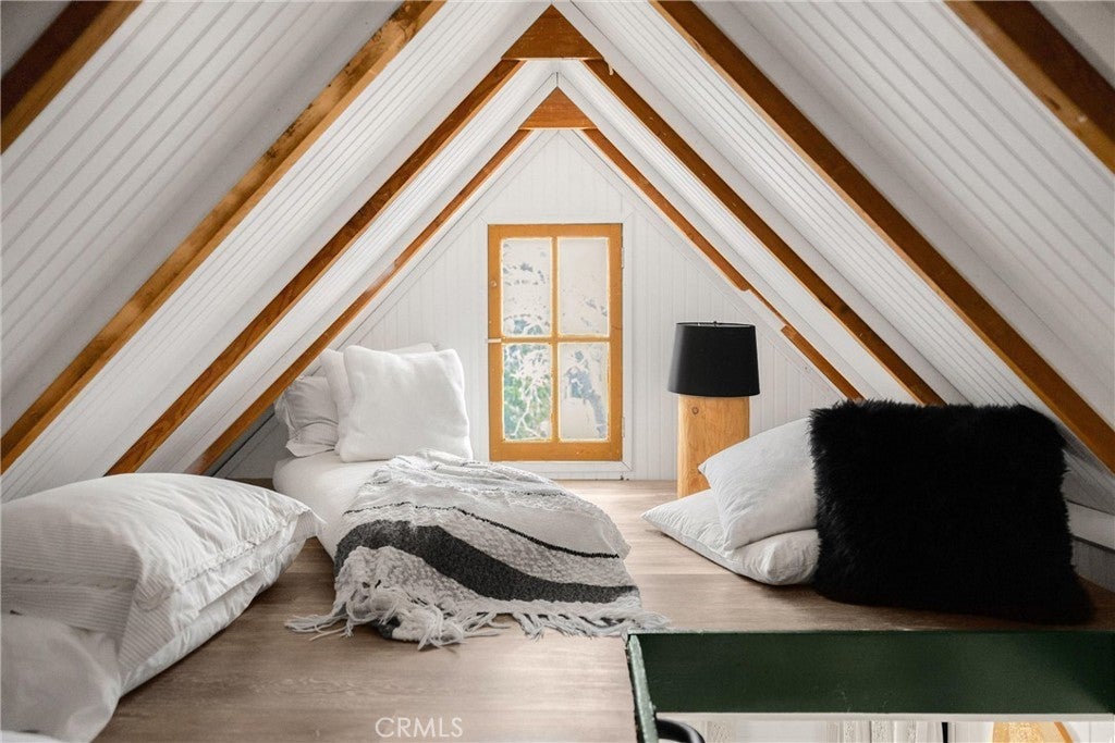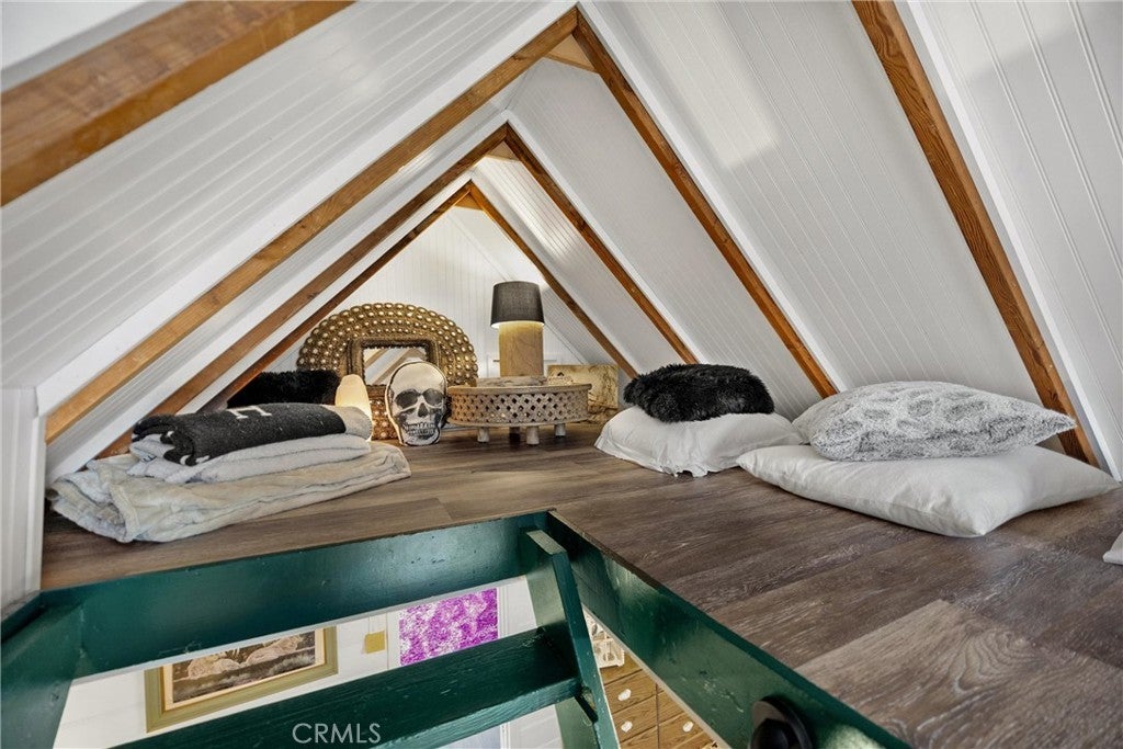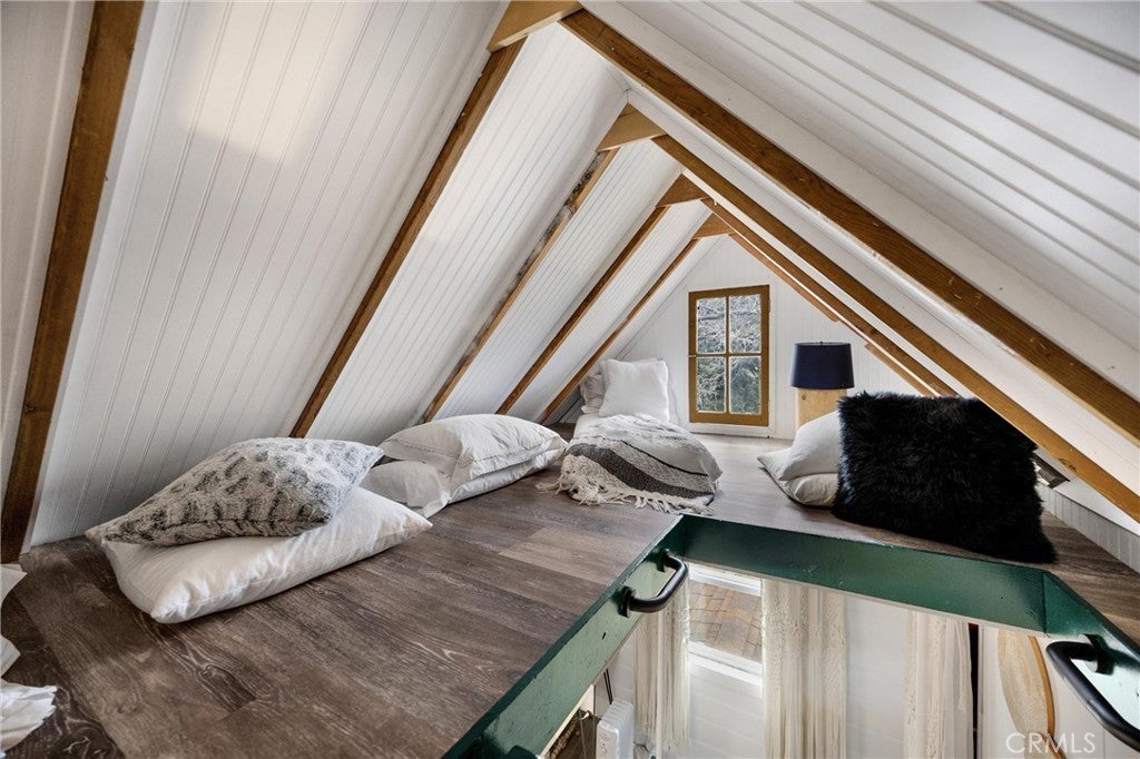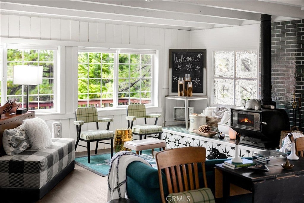 Charming, Mid-Century gem in the heart of Green Valley Lake only a few minutes walk down to the lakefront. Meticulously designed and curated as a magical escepe with friends and loved ones. Entering the front door, a bright living room greets you with a warming wood stove fireplace and dramatic emerald tile wall to frame it. Dark umber LIFEPROOF vinyl flooring throughout is easy to maintain yet keep it visually rustic. To the right of the entry, the vintage cabinets have been painted hunter green to bring in the colors of the woods and are stylishly elevated by a low-maintenance marble print laminate countertop. Gather around a table in the dining area with windows overlooking the tranquil Green Valley Lake mountainside. Towards the back, a laundry room and storage hideaway. The bathroom has been recently updated with classic touches and black finish fixtures. The steps leading to the upper levels is cleverly illuminated with a fuchsia neon sign that is simply "divine." Two bedroom areas are on the second level with battered walls painted white to brighten the space with a clean aesthetic and provide the perfect backdrop for cozy lounging or restful nights. The attic has been transformed into a peaceful retreat ideal for napping on a winter day or reading a good book in warmer weather. The attic window overlooks the spacious deck below providing an ideal outdoor space for sunsets and summer barbeques. Call this enchanting cabin your new home or keep it as a delightful income property. All furnishings and decor can be made available for those interested.