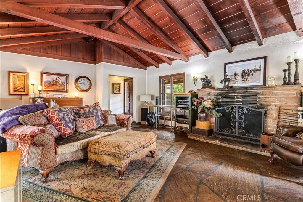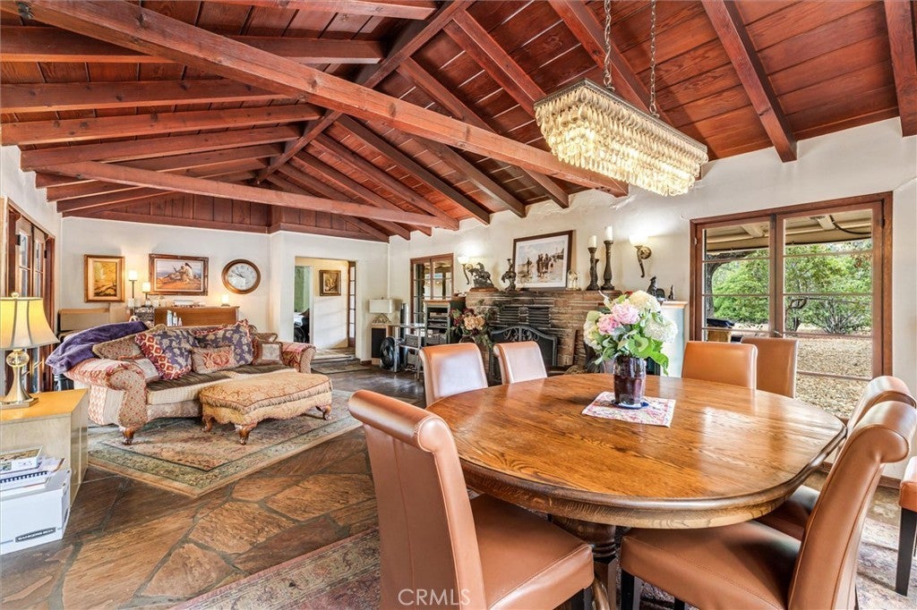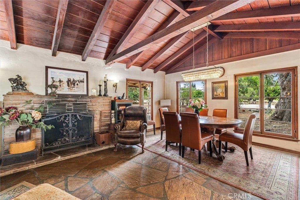 Magnificent One-of-a-kind property in the heart of Yorba Linda ~ First time on the market in over 50 years ~ Charming 5 bedroom adobe pool home situated on 3.7 acres (approx.) of citrus trees and secluded grounds ~ Superb craftsmanship in this home featuring stone floors, wood beamed ceilings, wood framed French doors and windows and vintage stone fireplace ~ The original home was built in 1946 (per title) and has been remodeled and additional living space was added in 2001 (approx). Remodeled kitchen features a spacious island, greenhouse window, apron sink, 5 burner gas stove with range hood, self-closing custom cabinetry, granite and quartz counters and a wine frig. ~ Distinctive living room and dining room with unique architecture and views of the surrounding land ~ Primary bedroom with stone fireplace, beamed ceilings, wood flooring and casual seating area ~ Spacious remodeled primary bathroom with an oversized shower and huge walk in closet ~ Additional 2 bedrooms are ample in size and share a hall bathroom ~ Upstairs features a bonus room, 2 additional bedrooms and a bathroom ~ Tranquil pool and spa surrounded by the majestic surrounding grounds ~ 2 car detached garage with ½ bath ~ Covered front and rear patios to relax and enjoy the tranquility and serenity of the vast wide open spaces and stately trees that brings country living to you ! This is a spectacular property and there is nothing else like it in Yorba Linda.