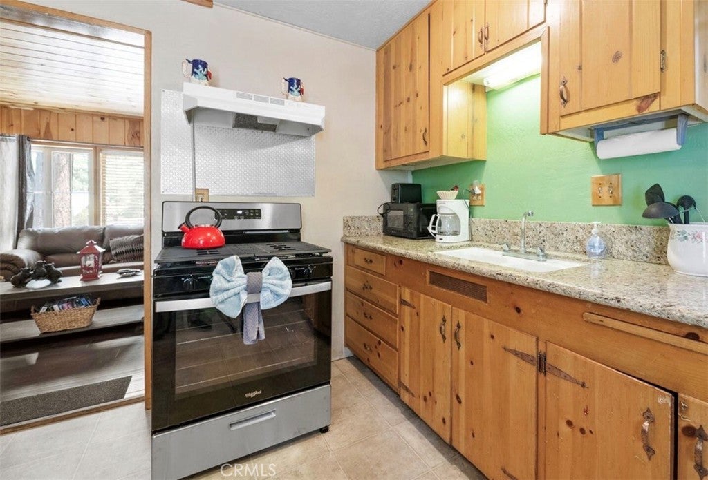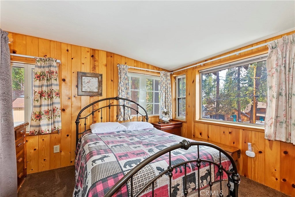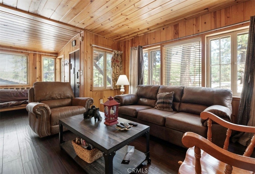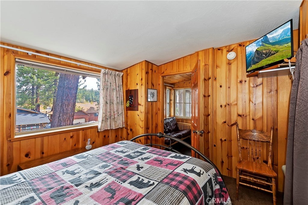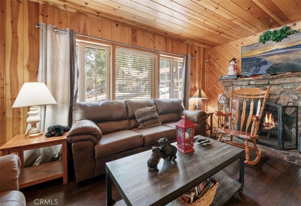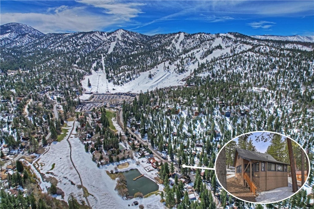 Ideally situated within walking distance to Bear Mountain Ski Resort, the golf course, Moonridge Zoo, and numerous trail systems, this updated vintage cabin offers comfort, charm, and investment opportunity. The interior features classic knotty pine tongue-and-groove walls and ceilings, a striking native stone wood-burning fireplace, and granite kitchen countertops with a cozy dining nook. The one-bedroom layout includes a full bathroom with an antique clawfoot tub and separate shower. Well-maintained and thoughtfully upgraded, the home includes a newer roof (2017), storm windows, and an extended driveway with RV parking. The detached one-car garage may qualify for a junior ADU or studio conversion (buyer to verify), and the oversized yard presents further expansion or ADU potential. Sold fully furnished, this cabin has a proven track record as a seasonal short-term rental and is ready for immediate use or income generation. Don't miss this unique opportunity to own in the highly desirable Moonridge neighborhood.