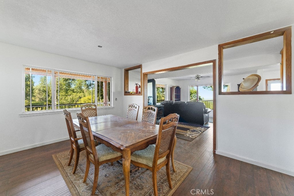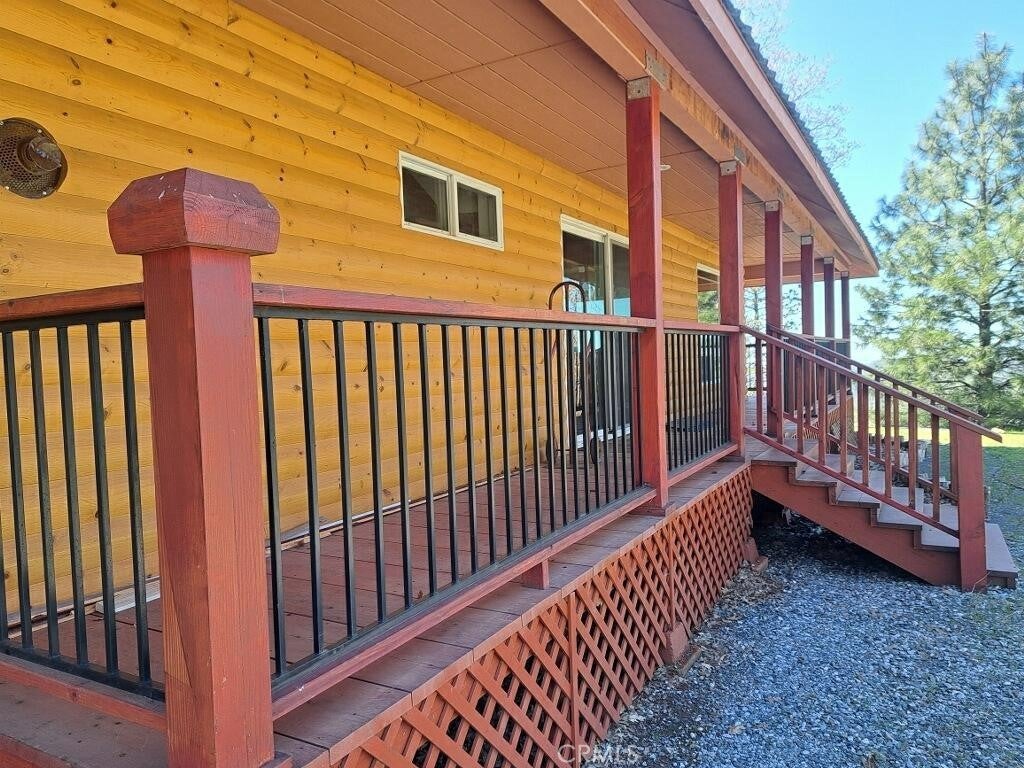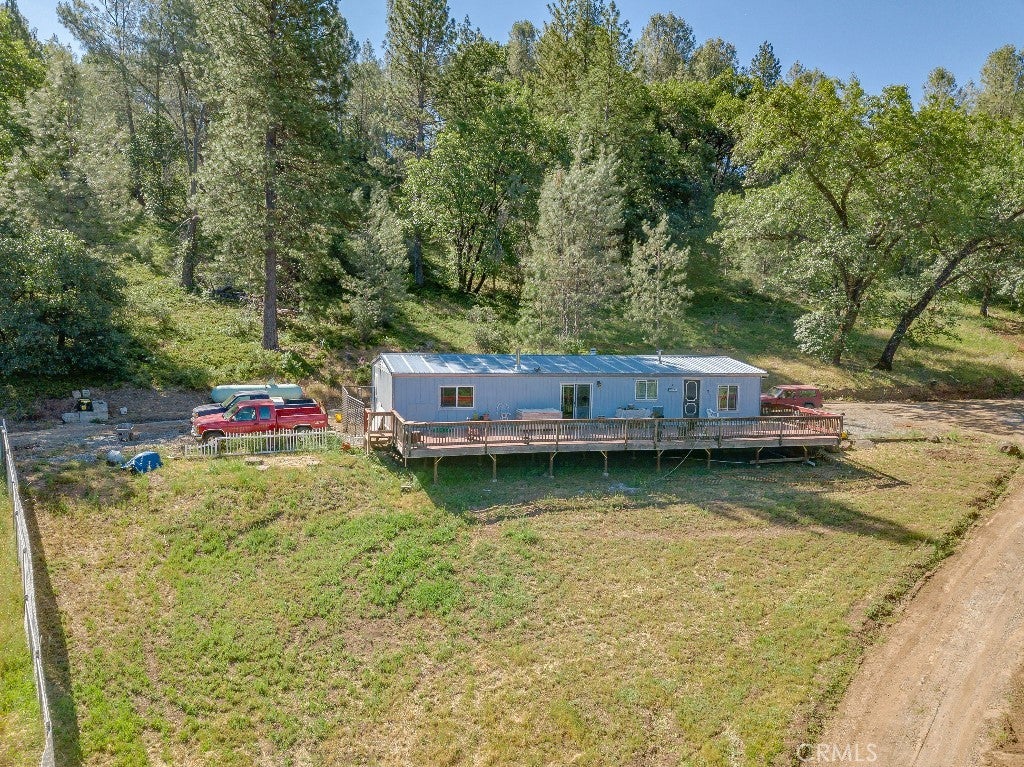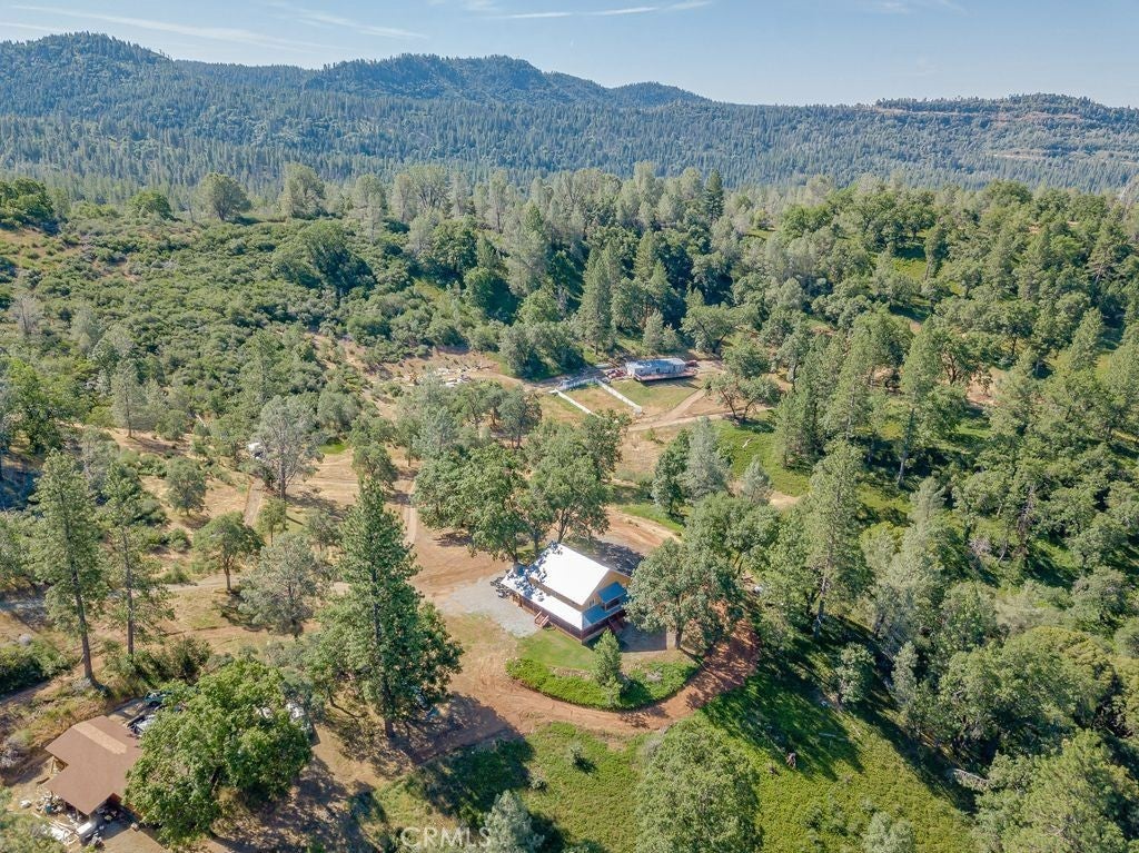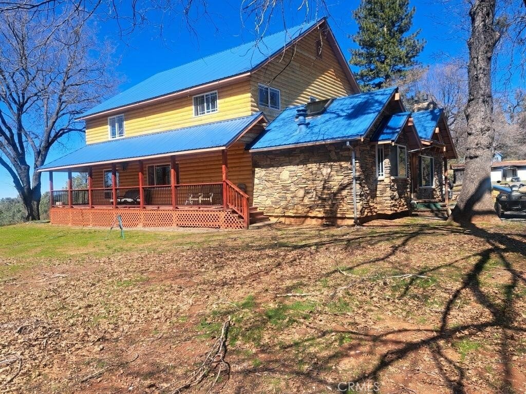 This lovely property has 60 acres on two parcels. The structures include: Main house, Double-Wide Coach, 4 car Garage, fenced Garden, and Sheds. The two story main house has three bedrooms and three bathrooms. The new kitchen and parlor addition contains: Bertch cherry cabinets, six-burner Viking propane stove, dishwasher, an 11x4 island with granite counter and operable skylight above, and two sinks. There are two propane fireplaces: one in the new parlor and one in the living room. Master bedroom has two closets and a new covered deck. Master bathroom has a double vanity from Bertch and a shower. The sinks and toilet are in cobalt blue. The other two bedrooms share a Jack/Jill bathroom with a tub/shower combo. The third bathroom is downstairs and contains a shower. All new: redwood decks on three sides of the first floor, blue metal roof, D-log siding, 20 windows, 4 exterior doors, wood flooring on both levels. The 60 ft. x 20 ft. four car garage has a gravel floor, and both front and rear man doors. A two- sided D-log shelter neatly hides the 1,000 gallon propane tank for the Main house. A small chicken coop is behind the garage. There is a 60 ft. x 24 ft. coach which has two bedrooms and two bathrooms. The coach has a new blue, metal roof, all new windows, and about half if it received new siding. All new wood flooring except for the tile in the two bathrooms and utility room. The wood burning stove pretty much heats the whole “house”, but there is a 500-gallon propane tank for the new hot water heater, the kitchen stove, the propane refrigerator and for a space heater as well. On one side there was added a 65 ft. x 15 ft. redwood deck and railings. There are two storage sheds located below the main house. The main house and the coach each have a septic tank. The well is near the top of the hill. One of the water tanks is aluminum, obviously the body of a milk truck or water tanker. The other tank is the typical Army green one about 8 feet tall. The well pump was replaced last year along with 400 ft of new hose. The flow is currently at 16 gallons per minute and has never run dry. Both the solar and batteries have been upgraded with a total of twenty new panels from Canada to handle full time occupation. There are generators to act as backups for the solar. The house was built about forty years ago without permits. However, we have the CA Fair Plan.