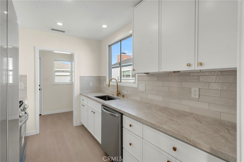 Welcome to 2729 Greentop Street—a stylish, move-in ready 3-bedroom, 1-bath single-story home offering 1,180 sq. ft. of comfortable living on a 5,200 sqft. lot. Inside, you’ll find an open layout filled with natural light and beautiful white-oak–look flooring. The stunning kitchen features quartz countertops, stainless steel appliances, white shaker cabinetry, a subway-tile backsplash, and an attached but separate laundry room. The spa-inspired bathroom includes a tiled shower/tub, a modern vanity, and designer finishes. Enjoy fresh green lawns in both the front and back yards, plus a brand-new paver area in front of the detached garage—perfect for work, play, or hosting your next outdoor gathering. Ideally located near Heartwell Park, LBX, top-rated schools, Lakewood Center, and major freeways. Low-maintenance elegance in the heart of Lakewood Mutual—ready for you to call home!