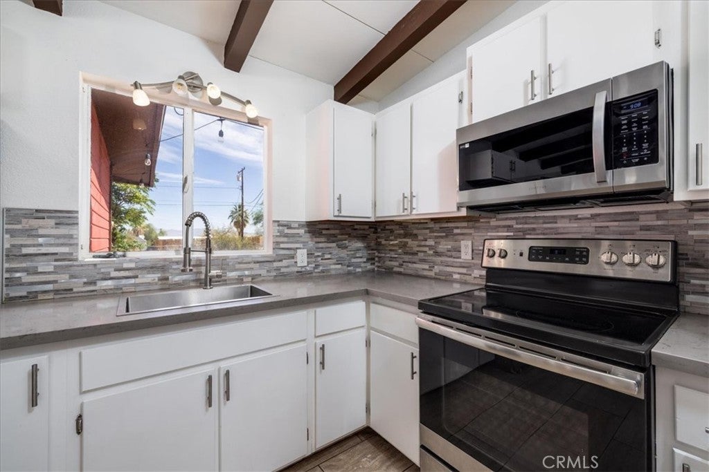 Welcome to Your Desert Escape! This charming 4-bedroom, 1.5-bath home is nestled in the heart of 29 Palms, just minutes from the east entrance of Joshua Tree National Park. Whether you're seeking a full-time residence or the perfect vacation getaway, this home offers comfort, style, and convenience. The kitchen features sleek grey quartz countertops, perfect for both cooking and entertaining. A versatile bonus room adds extra space for an office, game room, or guest area. Enjoy the convenience of indoor laundry, and stay comfortable year-round with zoned mini-split heating and cooling in every room—ensuring optimal climate control and energy efficiency. Don’t miss this opportunity to enjoy the serene desert lifestyle with modern amenities and unbeatable location! Only 1.3 miles from the Tortoise Rock Casino and only 3.3 miles from the East entrance of the Joshua Tree National Park. Close to shopping and many area restaurants.