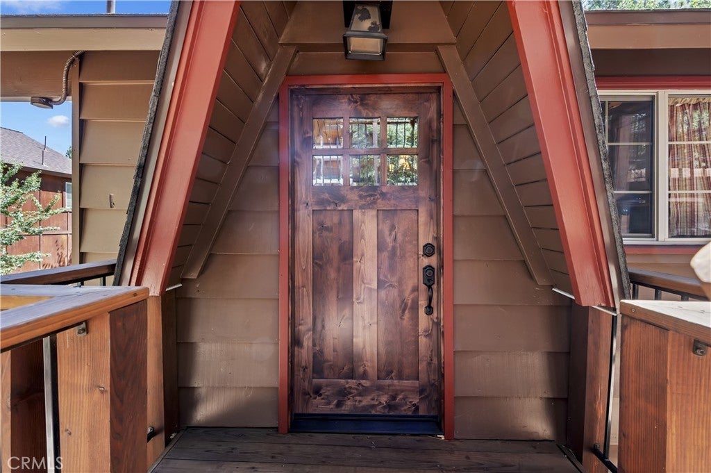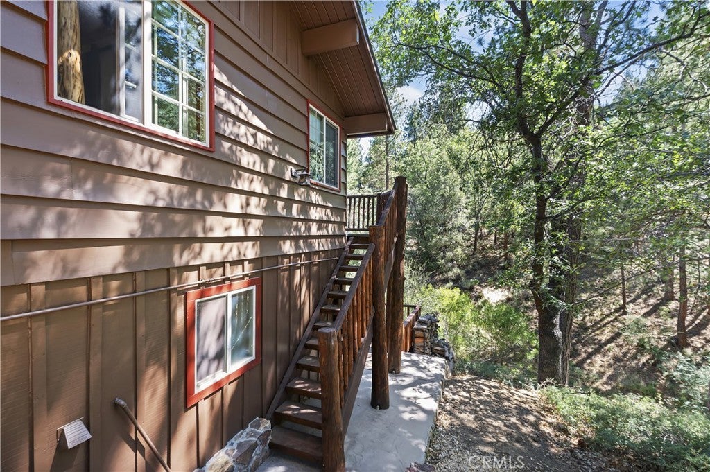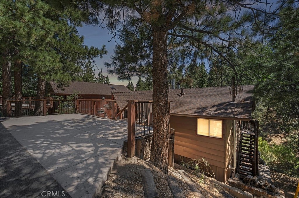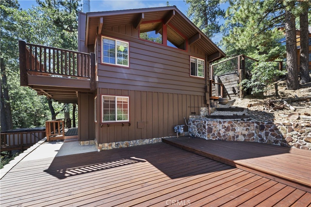 Shows like a brand new home! Master craftsmanship throughout this amazing cabin includes custom kitchen cabinets, custom lighting, custom doors, beautiful highly upgraded bathrooms and kitchen. You will enjoy several decks to marvel at nature and the seasonal creek that runs behind the house! The new side deck is HUGE and ready for you and your guests as well as a spa deck which overlooks the canyon with upper and lower decks for dining or viewing nature!. The home has a new roof, and new electrical throughout as well as luxury vinyl plank flooring, custom roman shades for the windows, a light and bright interior and comes fully furnished! The cement parking pad is so convenient, with just a few steps to the front door. This is the home for the buyer who values quality construction and fine finishes. The floorplan features a greatroom on the main level with 2 bedrooms and luxury bathroom, downstairs is a den/game room and master suite. Beautiful new windows let the sunshine into your fabulous pride of ownership mountain home! Close to Bear Mountain, lake and village of Big Bear Lake.