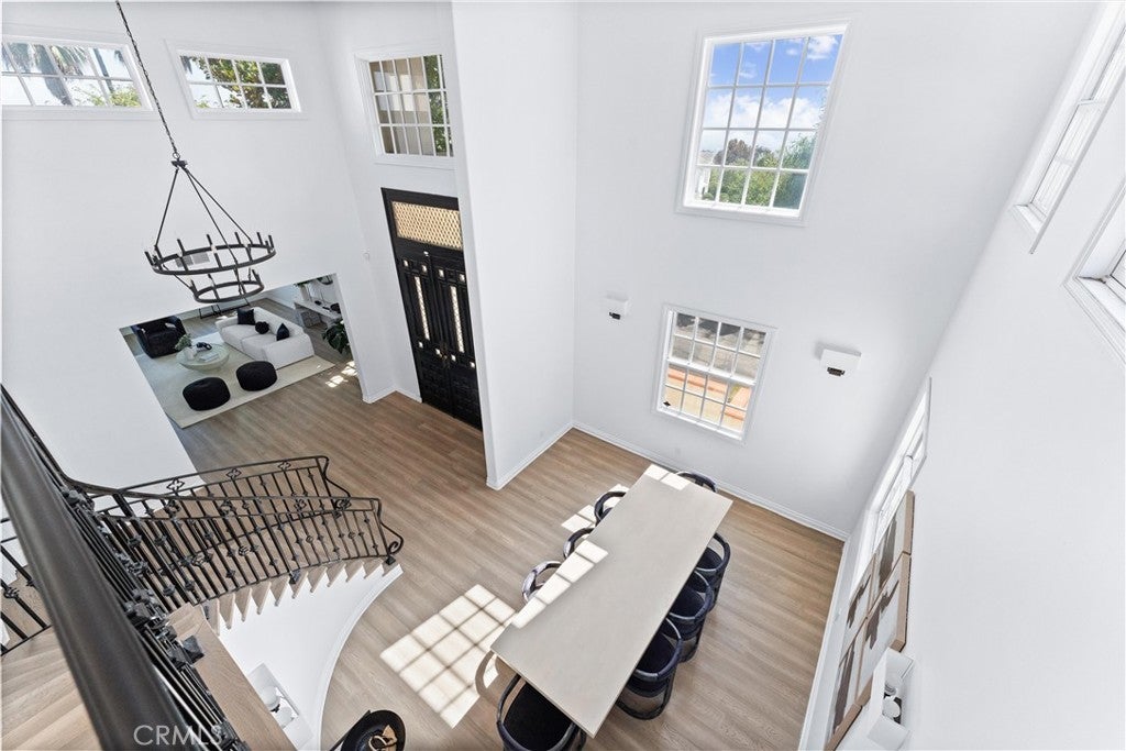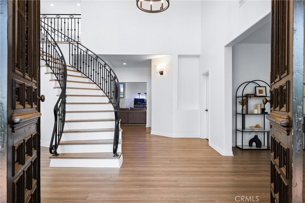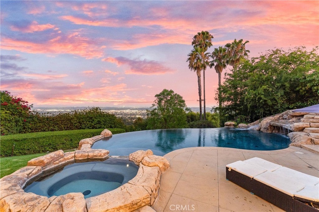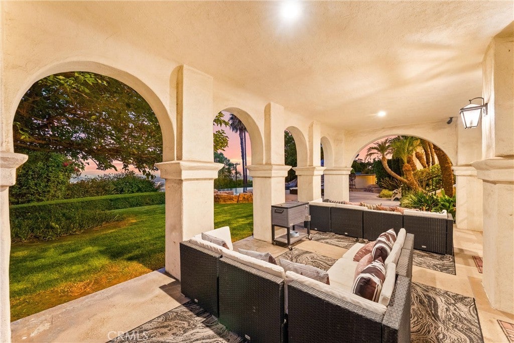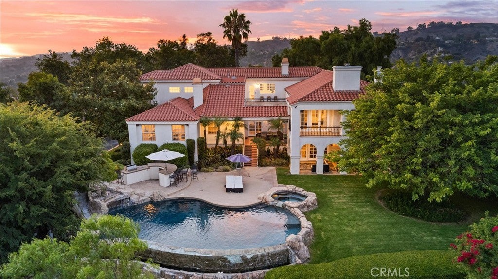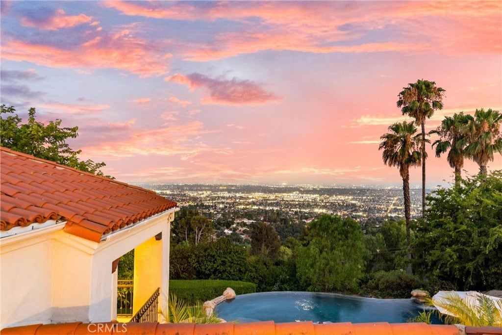 Welcome to 927 E Avocado Crest Rd, a one-of-a-kind Spanish Style Estate. This property boasts stunning panoramic and picturesque views from Orange County to Los Angeles, including Catalina Island, city lights, nightly fireworks all visible from multiple sitting decks and the pool. The north side offers views of the renowned Hacienda Golf Course, a historic La Habra Heights landmark. This freshly upgraded home greets you with a stunning entry that exudes luxury and attention to detail. The primary bedroom offers a private balcony with breathtaking views of the resort-style grounds and city lights, ideal for enjoying amazing sunsets. It includes a spacious sitting room, and the en-suite bathroom features a soaking tub and a true spa sanctuary. The custom-designed shower suite includes a rainfall shower head, multiple shower heads, and soothing body sprayers, and it doubles as a steam room or sauna with a built-in steam generator and aromatherapy compatibility for a relaxing and restorative experience. The kitchen is equipped with marble countertops, top-of-the-line appliances, a butler's pantry with a wine refrigerator, a commercial stove with commercial venting, and wood plank flooring throughout. Each of the five bedrooms has its own en-suite bathroom, a walk-in closet. One bedroom and en-suite bathroom are conveniently located on the main floor for guests or easy access. Additionally, there is a loft with an adjoining deck. There are two staircases: a formal entry with a cascading staircase leading to the upper level, and a back stairway that connects the kitchen to the bedrooms, decks, and loft. The game room is perfectly situated for entertaining and opens to the outdoor patio and pool area, and it includes a bar with seating for a crowd, a wine refrigerator, dishwasher, ample storage, and a half bath. The outdoor amenities include a pool, spa, waterfall, BBQ/bar, and a spacious grassy area with tropical foliage and a variety of fruit trees. Smart home system is wired for high-speed internet to ensure optimal Wi-Fi performance in every room, and centralized control from your smartphone over the air conditioning, pool, automatic gate, security system, and built-in sound system. The direct access garage consists of two 2-car garages, and additional parking providing enough room to park an RV or around 20 cars. Whether you're entertaining guests or enjoying a quiet night in, this home delivers convenience, comfort, and control with cutting-edge ease.