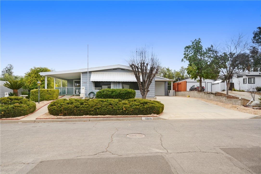 A Great turnkey Manufactured home in The Farm Community located off Bundy Canyon Road with easy access to 15 and 215 highways, This home has 3 bedrooms, 2 baths, Family Room with large bar, Office area, Living room. Great RV garage with FULL RV hookups, plus 2 car tandem or one car with workshop area 2 floor area and storage for most anything like toys or place to run your business from with long driveway and a car port. Remodeled Kitchen has xtra large pantry, cabinets with built in lazy susan. Large covered patio on the front of the home. An oversized central air conditioning and a swamp cooler. Outside, you will enjoy a nice covered front porch, plus a driveway side entrance through the indoor laundry room with sink. The yard is fully landscaped front and back and has sprinklers and drip system. The Backyard has a covered patio and is fenced with gate access to the front yard, side yard, and open land behind the property (no neighbor directly behind you). Major earthquake bracing with marriage bars, laminate flooring, waste disposal, whole house surge protector. The community has multiple pools, spa, community fruit trees, hiking trails, baseball field, tennis court and picnic area with playground and a pond for fishing or just enjoying while sitting on the benches watching the ducks. This is a must see! Low maintinance yards. Turnkey for modern living with an open concept.