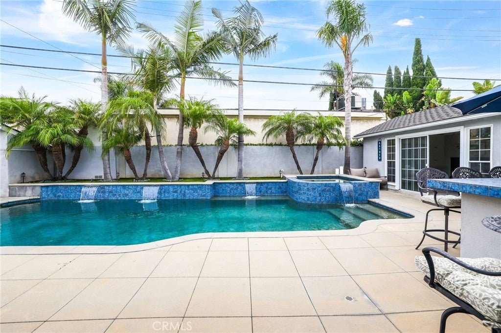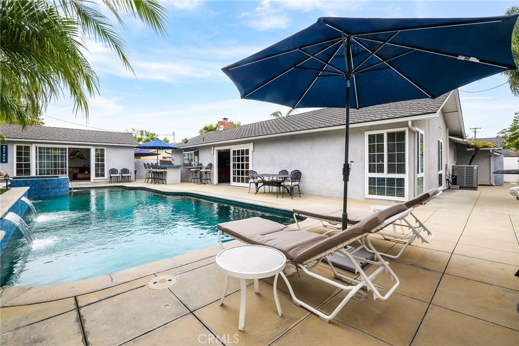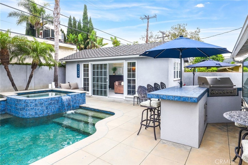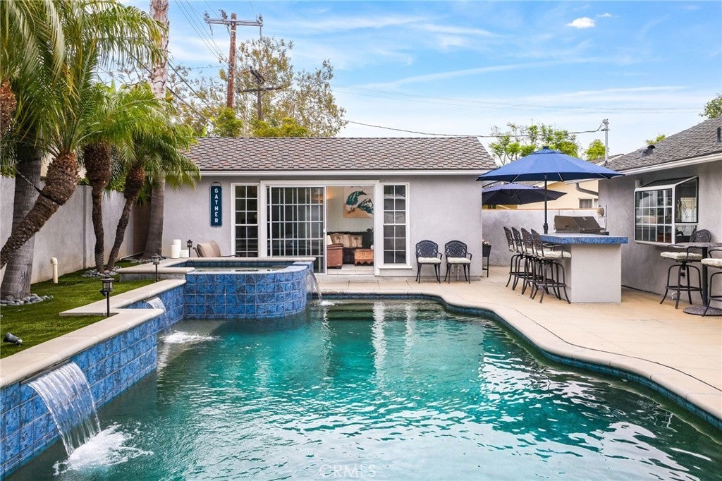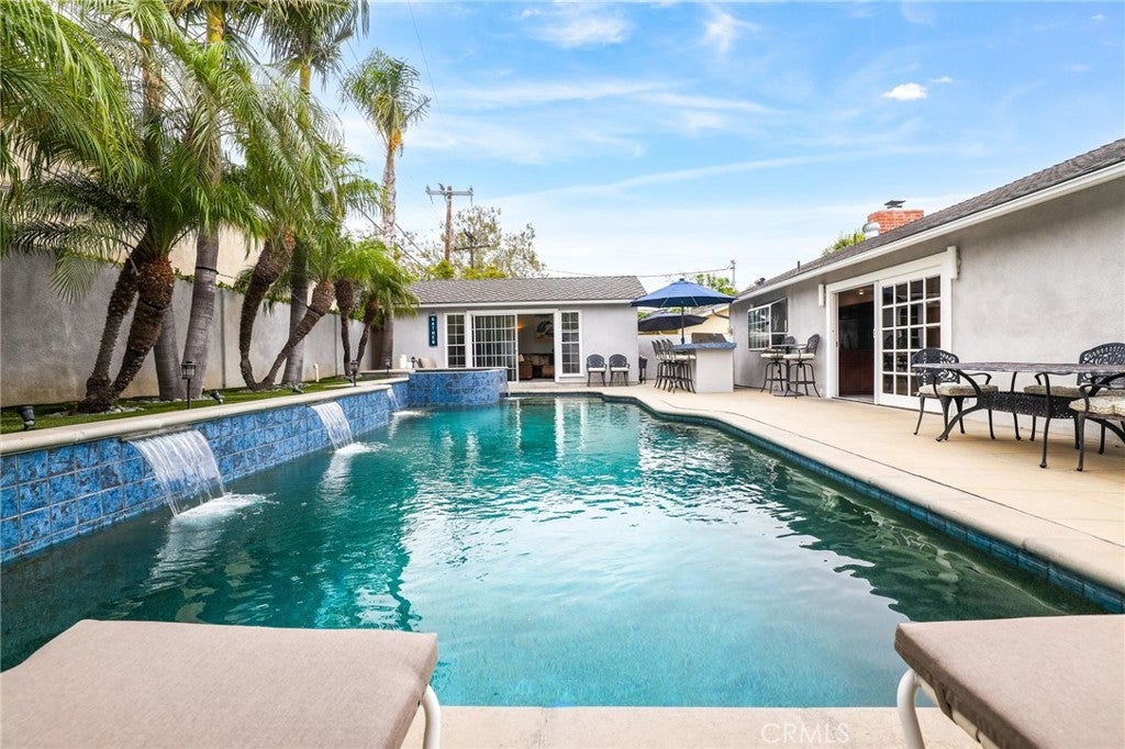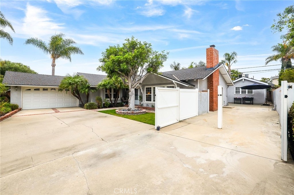 Welcome to 12852 Foster Road, nestled in the highly sought-after community of Rossmoor, Orange County—where pride of ownership meets exceptional comfort and design. This beautifully upgraded single-story home offers approximately 2,000 square feet of total living space, including a 1,645 sqft main home and a 355 sqft detached pool casita. Situated on an 8,064 sqft lot, it features full RV hookups, a 45-foot gated RV parking space, and a sweeping driveway leading to a finished two-car garage with direct access—altogether a rare find in Rossmoor. Inside, high vaulted ceilings, recessed lighting, and designer tile flooring flow seamlessly throughout. The living room centers around a granite gas-and-wood-burning fireplace with mantle, surround sound, and dual-pane windows, creating a warm and inviting gathering space. The chef’s kitchen has been completely remodeled with solid wood cabinetry (with custom pullouts), granite countertops, stainless steel KitchenAid appliances, and a sunlit garden window. The adjacent formal dining area opens through a custom beveled-glass sliding door to the private backyard oasis. The primary suite offers a walk-in closet and a luxurious en-suite bath featuring granite counters, a marble shower, and elegant designer finishes. Secondary bedrooms include mirrored closets and ceiling fans. The detached casita provides flexibility as a home office, guest suite, or fourth bedroom, complete with built-in cabinetry and a view of the resort-style backyard. Step outside to enjoy your own private retreat, showcasing a Pebble-Tec pool and spa, built-in BBQ with seating area, outdoor bathroom, mature palms, custom lighting, and abundant storage. Additional upgrades include a newer roof, tankless water heater, re-lined sewer line, and updated HVAC for year-round comfort for both main house and annex. The finished two-car garage offers extensive cabinetry, a stainless utility sink, and washer/dryer hookups. Ideally located near award-winning Los Alamitos schools, beautiful parks, and convenient shopping, this home perfectly blends functionality, sophistication, and the best of Southern California indoor-outdoor living.
