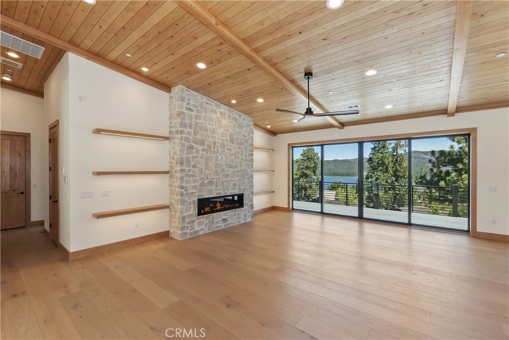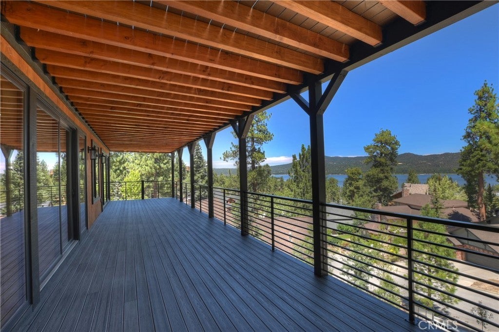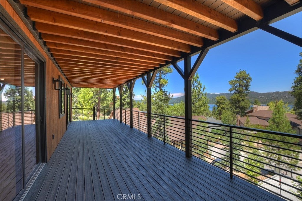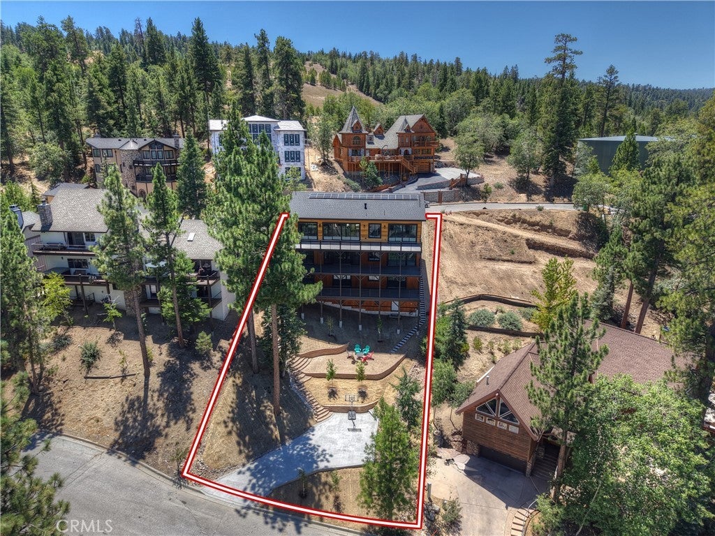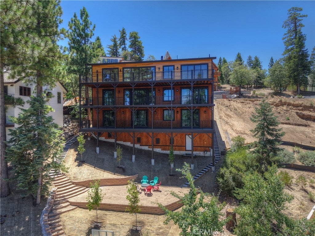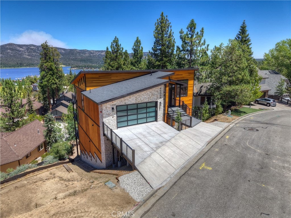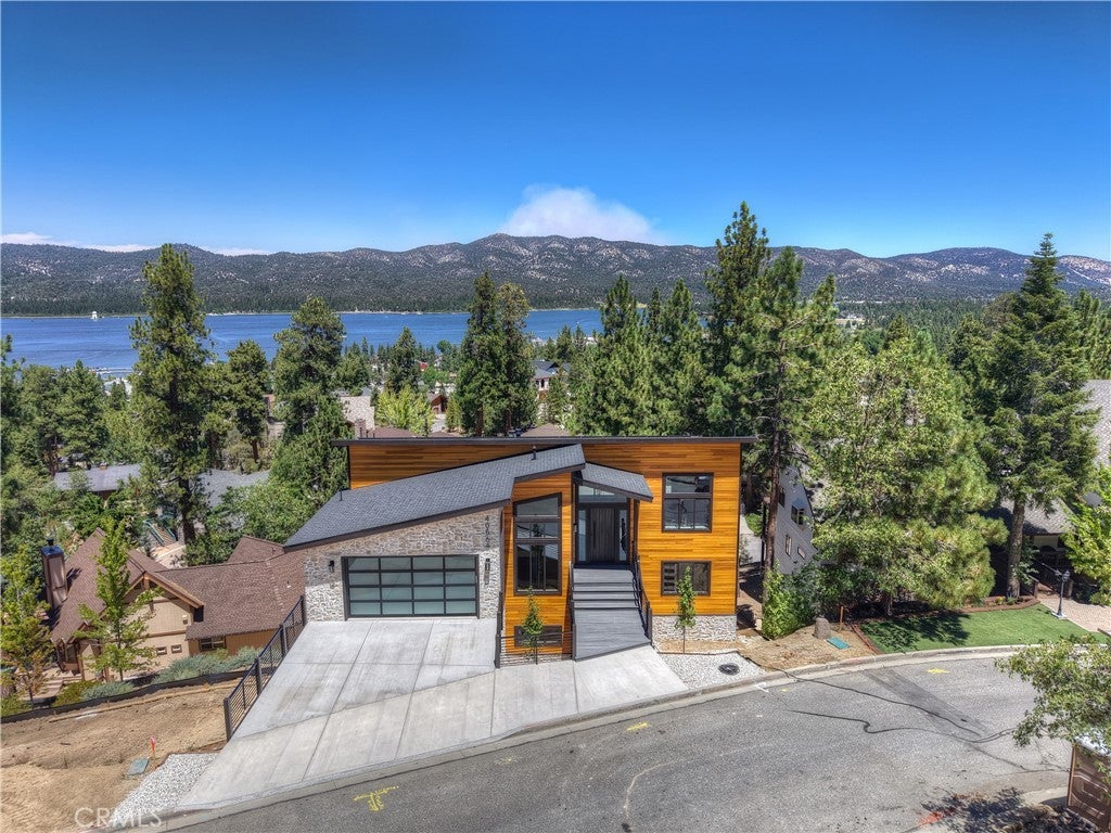 Located in sought-after Ironwood Estates, this magnificent BRAND NEW CONSTRUCTION is strategically positioned just behind the Village on a STREET-TO-STREET lot and boasts BREATHTAKING VIEWS of BIG BEAR LAKE! Prime location with just a short drive to the Village, restaurants, lake and ski resorts, this rustic contemporary home is truly stunning ~ As you enter the open living room, you'll be immediately drawn to the panoramic lake views ~ Large open living room and kitchen with big Anderson picture windows ~ Knotty alder tongue and groove ceilings, walls and doors, lots of cabinetry with a center island, stainless steel appliances (Decor fridge, range, microwave, & dishwasher) and granite slab counters ~ Primary suite on main floor with the fireplace and ensuite bathroom with barn door ~ Huge family room downstairs perfect for entertaining large groups with potential for a movie theater (prewired) plus another 3 bedrooms, and a gathering area and bedroom on the bottom floor (a total of 3 suites - 1 on each floor) ~ Separate laundry room ~ Wine cellar ~ Convenient level entry to an oversized 2 car attached garage ~ Other modern amenities include a tankless water heater, fire sprinklers, electrical wiring in the garage for EV charging, and solar panels (owned, not leased) ~ Expansive decking with views of the lake, mountains and valley ~ Additional off-street parking on back side of the property with a newly terraced yard ~ Home was just recently completed ~ Come experience everything this extraordinary brand new home has to offer!