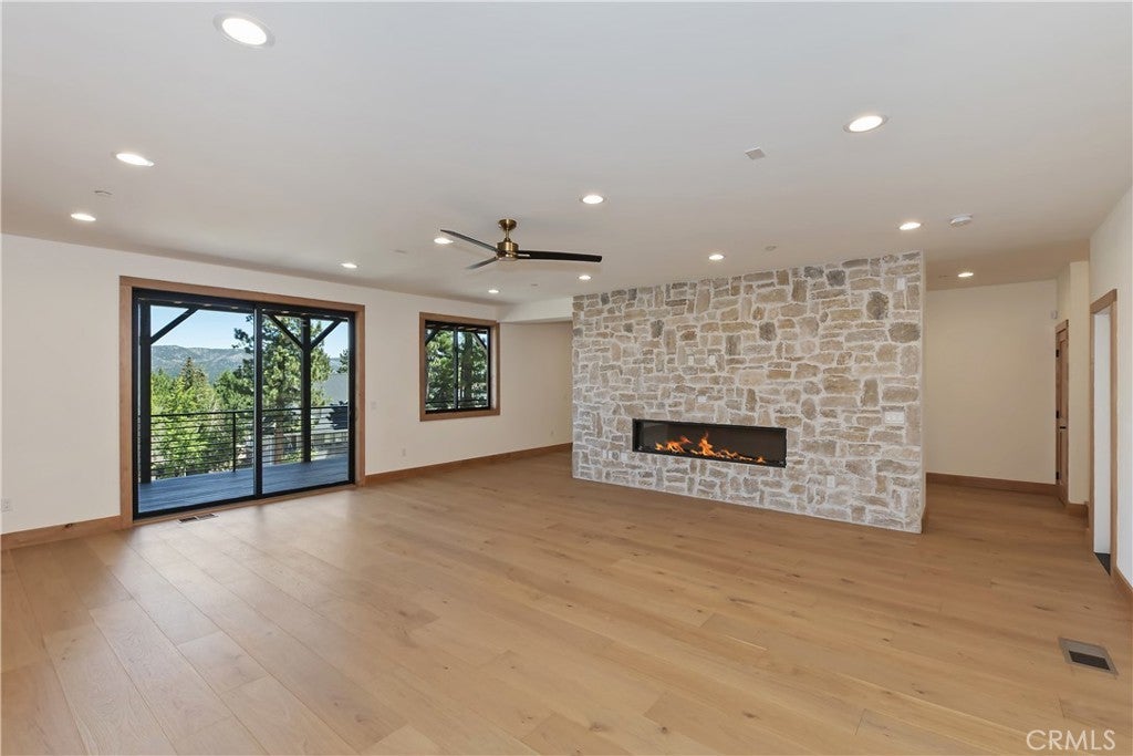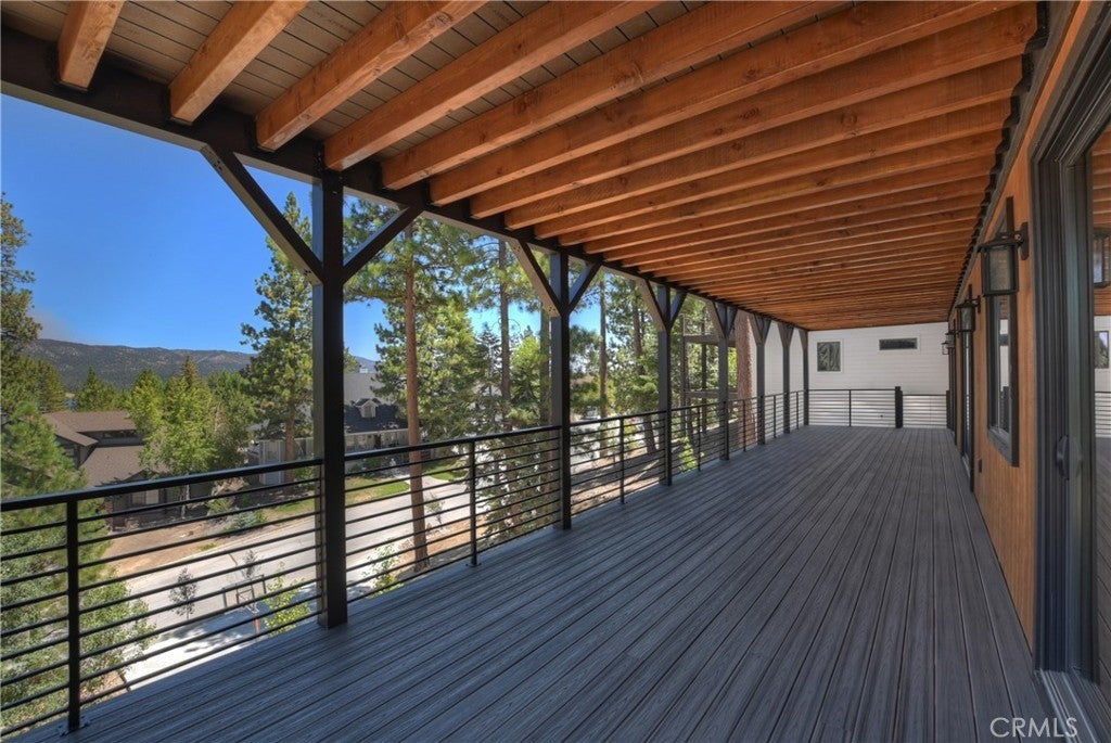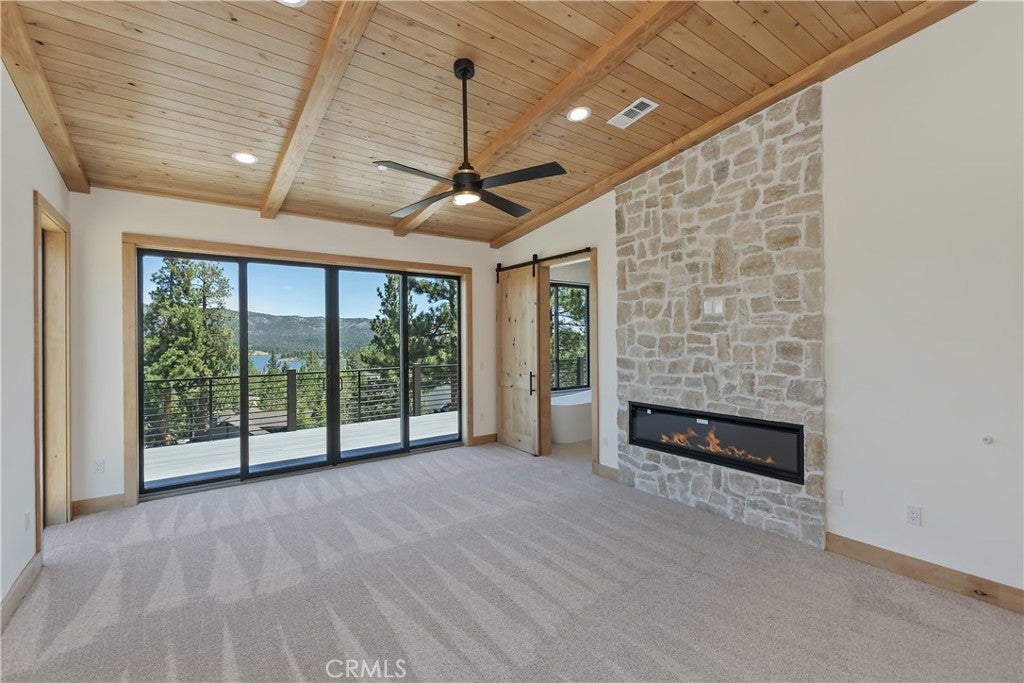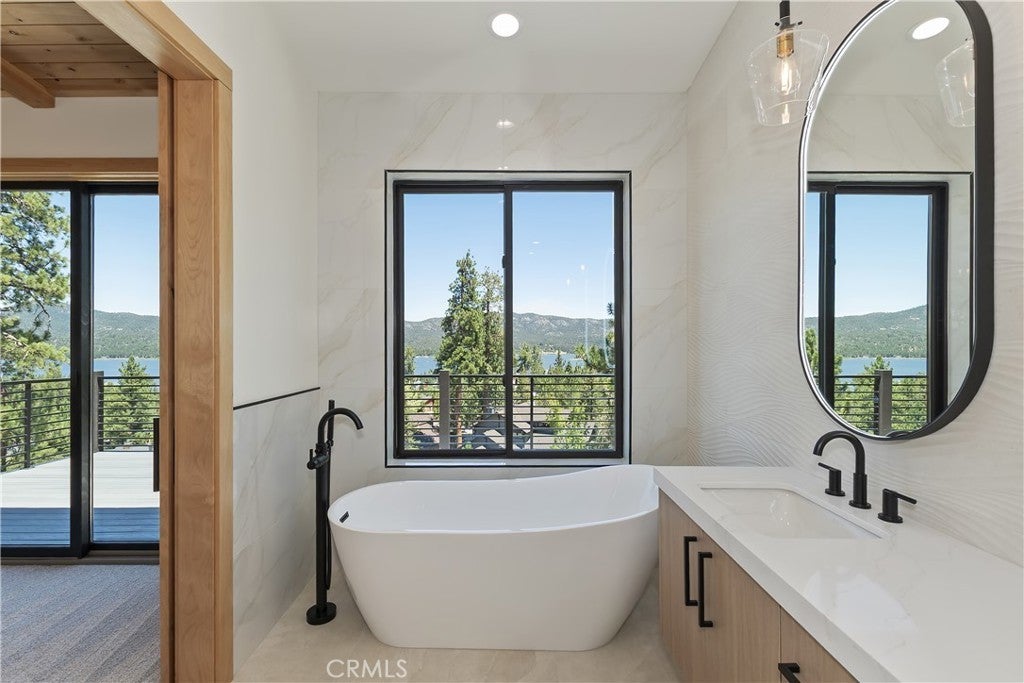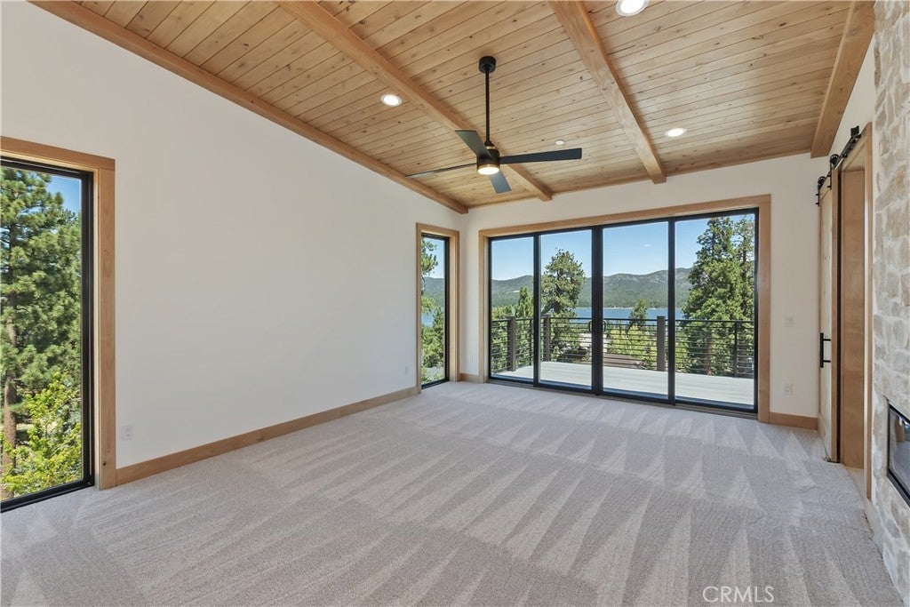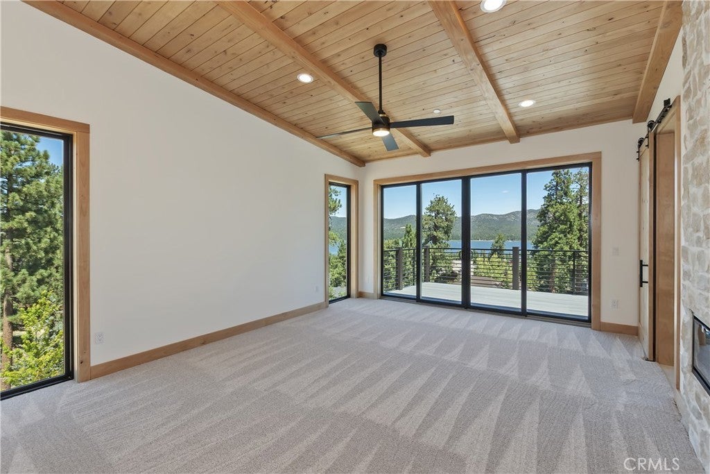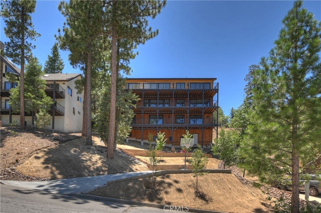 Located in sought-after Ironwood Estates, this magnificent BRAND NEW CONSTRUCTION is strategically positioned just behind the Village on a STREET-TO-STREET lot and boasts BREATHTAKING VIEWS of BIG BEAR LAKE! Prime location with just a short drive to the Village, restaurants, lake and ski resorts, this rustic contemporary home is truly stunning ~ As you enter the open living room, you'll be immediately drawn to the panoramic lake views ~ Large open living room and kitchen with big Anderson picture windows ~ Knotty alder tongue and groove ceilings, walls and doors, lots of cabinetry with a center island, stainless steel appliances (Decor fridge, range, microwave, & dishwasher) and granite slab counters ~ Primary suite on main floor with the fireplace and ensuite bathroom with barn door ~ Huge family room downstairs perfect for entertaining large groups with potential for a movie theater (prewired) plus another 3 bedrooms, and a gathering area and bedroom on the bottom floor (a total of 3 suites - 1 on each floor) ~ Separate laundry room ~ Wine cellar ~ Convenient level entry to an oversized 2 car attached garage ~ Other modern amenities include a tankless water heater, fire sprinklers, electrical wiring in the garage for EV charging, and solar panels (owned, not leased) ~ Expansive decking with views of the lake, mountains and valley ~ Additional off-street parking on back side of the property with a newly terraced yard ~ Home was just recently completed ~ Come experience everything this extraordinary brand new home has to offer!