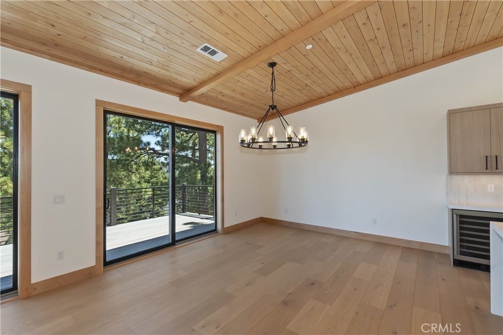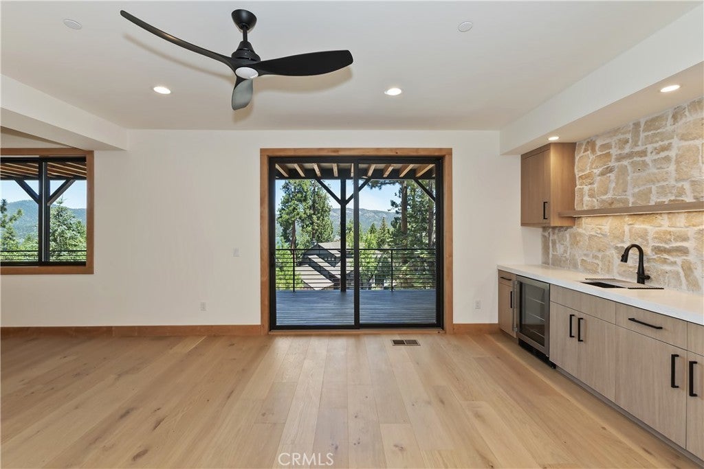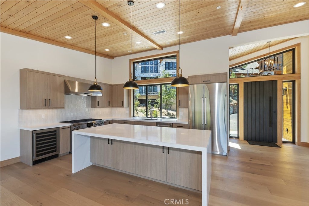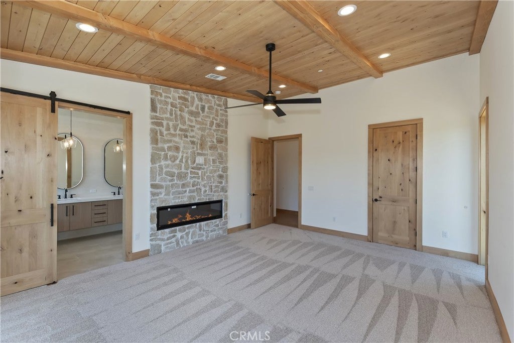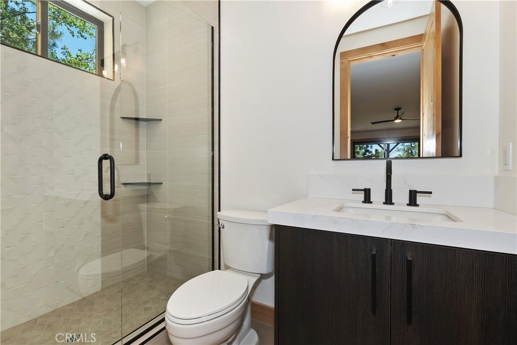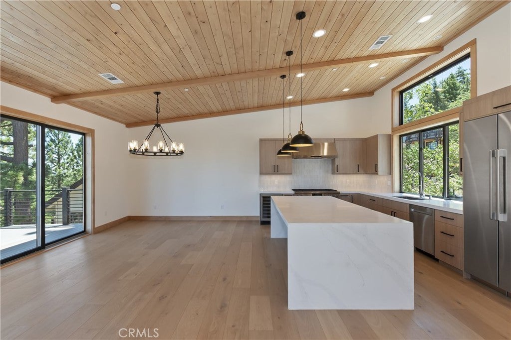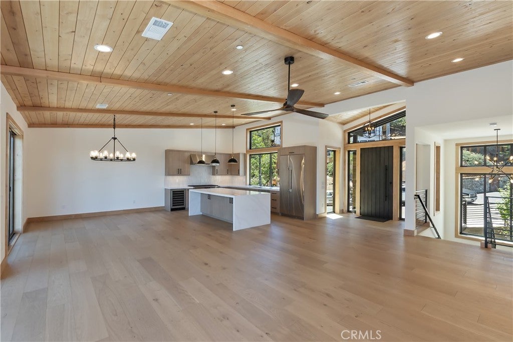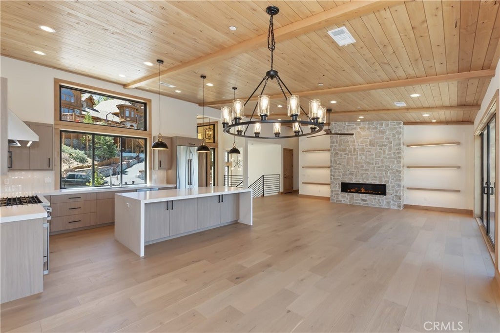 Located in sought-after Ironwood Estates, this magnificent BRAND NEW CONSTRUCTION is strategically positioned just behind the Village on a STREET-TO-STREET lot and boasts BREATHTAKING VIEWS of BIG BEAR LAKE! Prime location with just a short drive to the Village, restaurants, lake and ski resorts, this rustic contemporary home is truly stunning ~ As you enter the open living room, you'll be immediately drawn to the panoramic lake views ~ Large open living room and kitchen with big Anderson picture windows ~ Knotty alder tongue and groove ceilings, walls and doors, lots of cabinetry with a center island, stainless steel appliances (Decor fridge, range, microwave, & dishwasher) and granite slab counters ~ Primary suite on main floor with the fireplace and ensuite bathroom with barn door ~ Huge family room downstairs perfect for entertaining large groups with potential for a movie theater (prewired) plus another 3 bedrooms, and a gathering area and bedroom on the bottom floor (a total of 3 suites - 1 on each floor) ~ Separate laundry room ~ Wine cellar ~ Convenient level entry to an oversized 2 car attached garage ~ Other modern amenities include a tankless water heater, fire sprinklers, electrical wiring in the garage for EV charging, and solar panels (owned, not leased) ~ Expansive decking with views of the lake, mountains and valley ~ Additional off-street parking on back side of the property with a newly terraced yard ~ Home was just recently completed ~ Come experience everything this extraordinary brand new home has to offer!