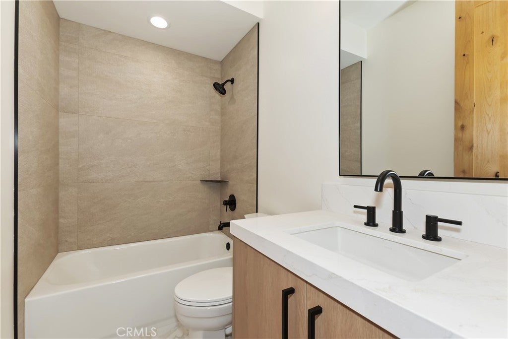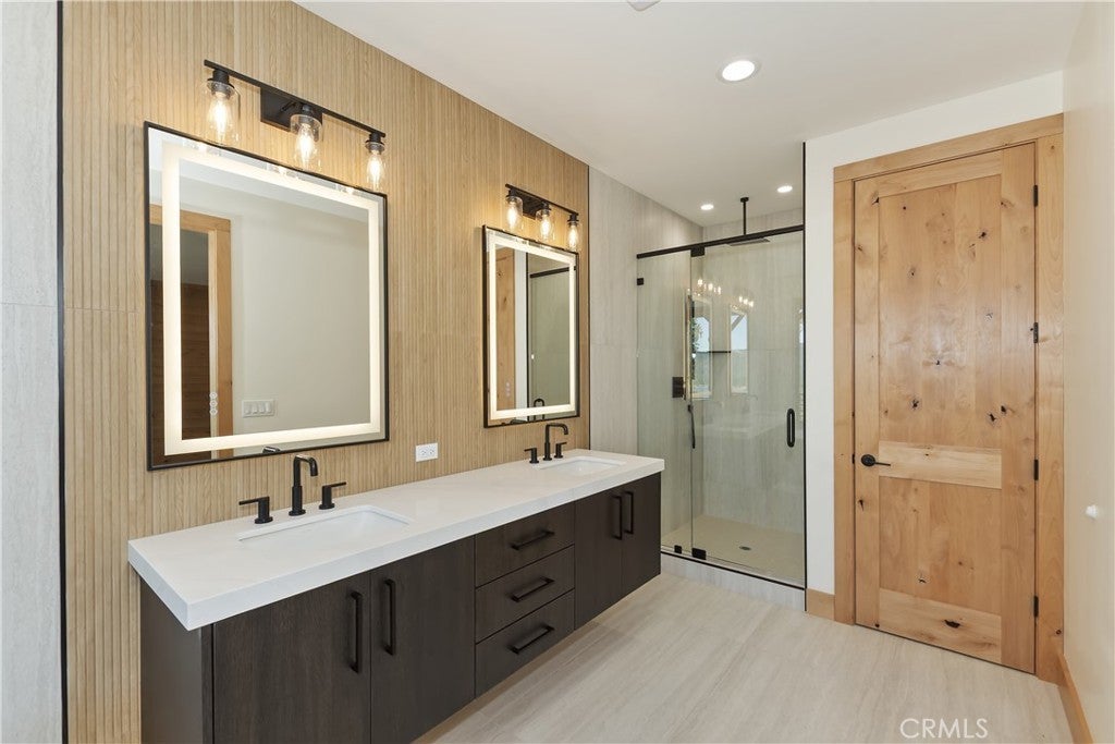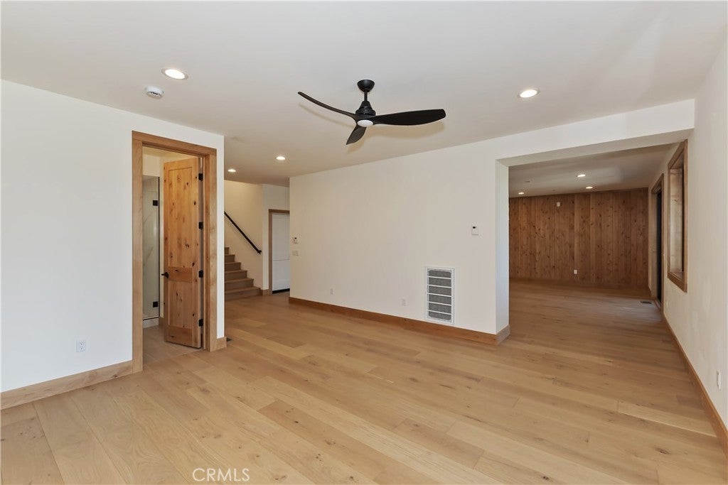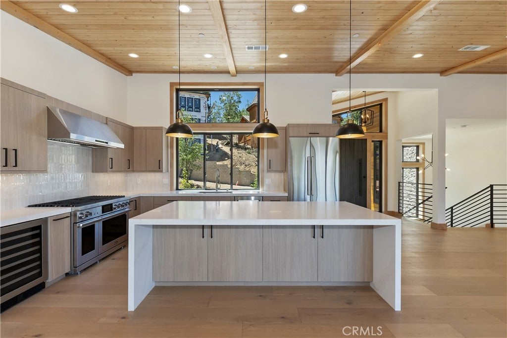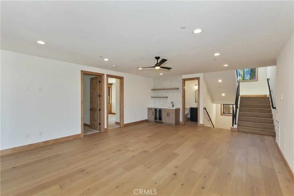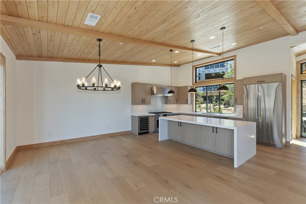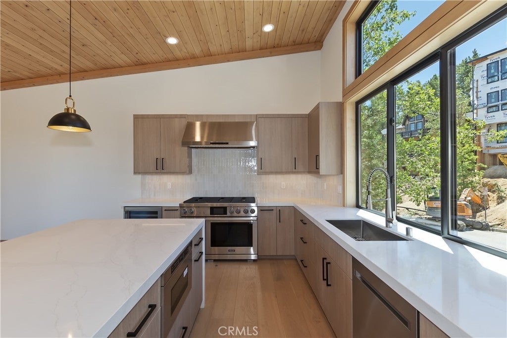 Located in sought-after Ironwood Estates, this magnificent BRAND NEW CONSTRUCTION is strategically positioned just behind the Village on a STREET-TO-STREET lot and boasts BREATHTAKING VIEWS of BIG BEAR LAKE! Prime location with just a short drive to the Village, restaurants, lake and ski resorts, this rustic contemporary home is truly stunning ~ As you enter the open living room, you'll be immediately drawn to the panoramic lake views ~ Large open living room and kitchen with big Anderson picture windows ~ Knotty alder tongue and groove ceilings, walls and doors, lots of cabinetry with a center island, stainless steel appliances (Decor fridge, range, microwave, & dishwasher) and granite slab counters ~ Primary suite on main floor with the fireplace and ensuite bathroom with barn door ~ Huge family room downstairs perfect for entertaining large groups with potential for a movie theater (prewired) plus another 3 bedrooms, and a gathering area and bedroom on the bottom floor (a total of 3 suites - 1 on each floor) ~ Separate laundry room ~ Wine cellar ~ Convenient level entry to an oversized 2 car attached garage ~ Other modern amenities include a tankless water heater, fire sprinklers, electrical wiring in the garage for EV charging, and solar panels (owned, not leased) ~ Expansive decking with views of the lake, mountains and valley ~ Additional off-street parking on back side of the property with a newly terraced yard ~ Home was just recently completed ~ Come experience everything this extraordinary brand new home has to offer!