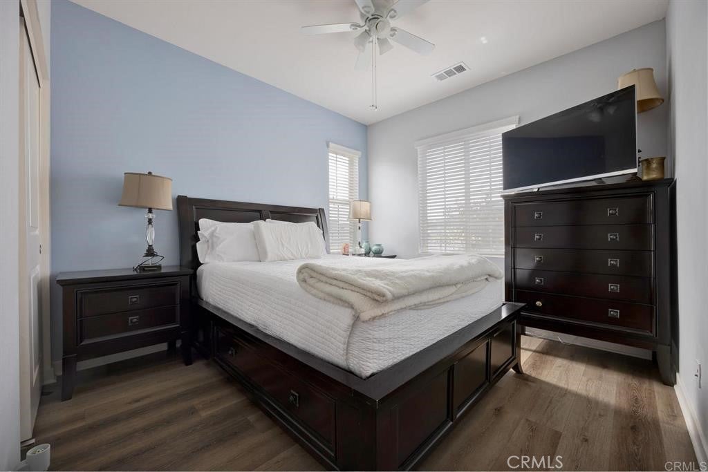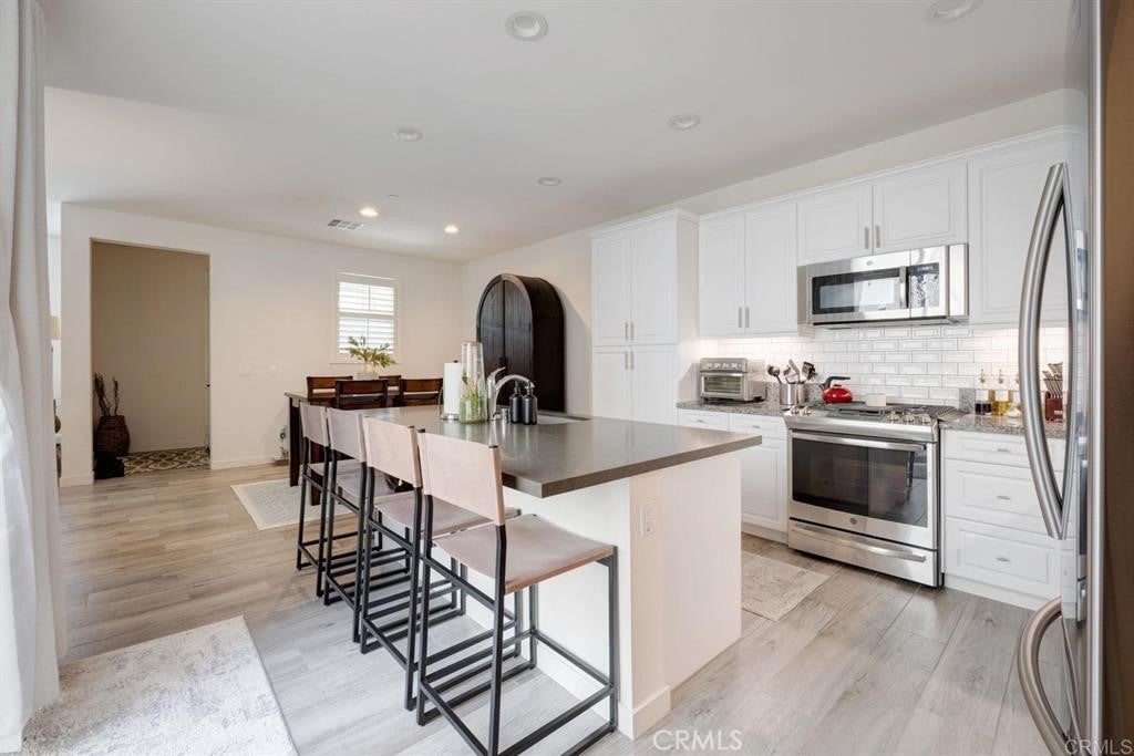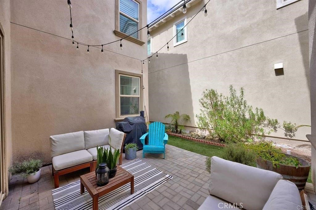 This bright and airy two-story home, built in 2018, blends contemporary design with everyday convenience. The main level offers a seamless flow between the living room, dining area, and chef-inspired kitchen, creating a warm and welcoming space. In the kitchen, you’ll find quartz countertops, sleek cabinetry, stainless steel appliances, and a large island perfect for meals and gatherings. Step right outside to a private courtyard finished with turf and stone pavers—an easy spot to enjoy morning coffee or evening downtime. Downstairs also includes a full bedroom and bathroom, ideal for guests or multi-generational living. Upstairs, the open loft adds extra flexibility for a home office, playroom, or media lounge. The primary suite feels like a retreat, complete with a private balcony, walk-in closet, dual shower heads, and a double-sink vanity. A second side yard expands your outdoor options, whether for gardening, pets, or simply creating your own green escape. Storage and practicality shine in the oversized 2.5-car garage, which includes built-in cabinets and overhead storage to keep everything organized. Residents here enjoy more than just a home—they enjoy a lifestyle. The community offers resort-style perks, including a heated pool with lap lanes, a clubhouse, fitness center with classes, and a 7-acre park with playgrounds. Scenic walking paths along the canyon make it easy to stay active while soaking in the views.