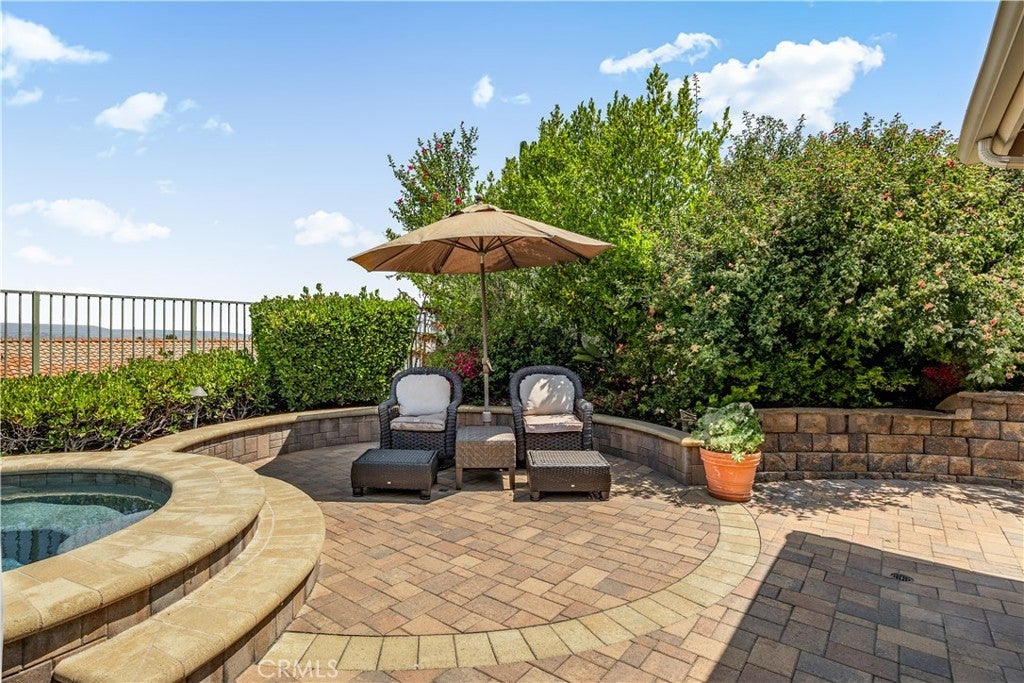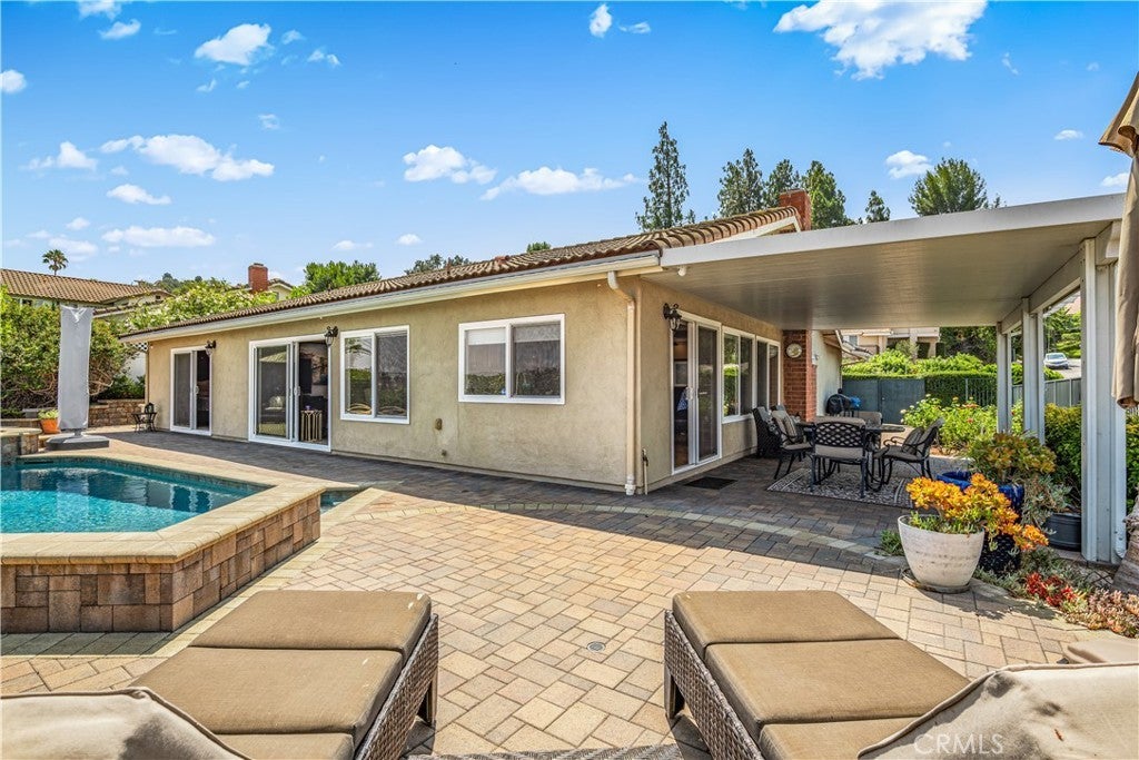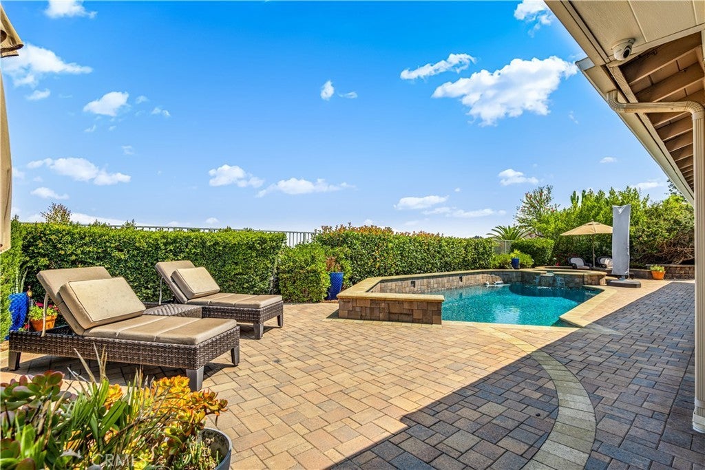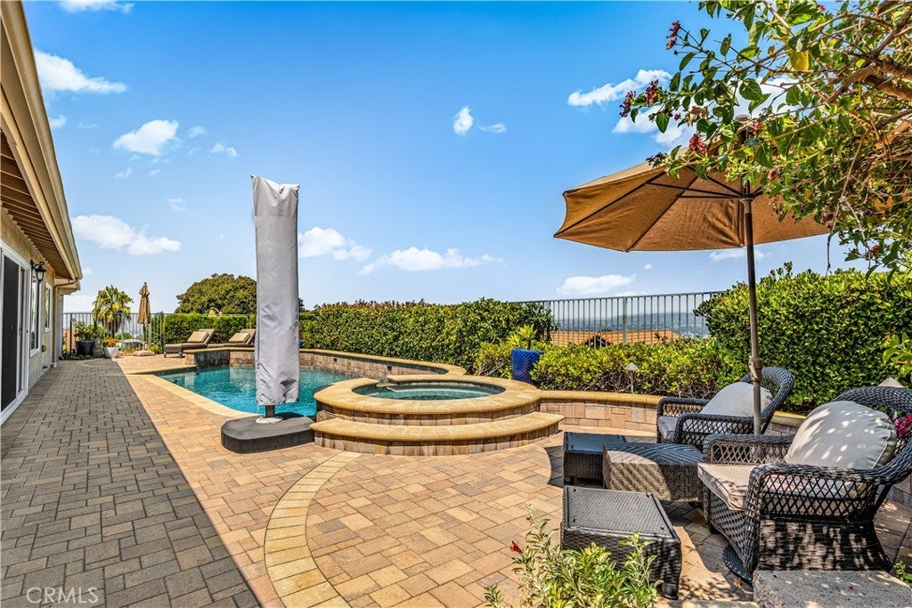 Highly upgraded single level home on quiet cull de sac with beautiful mountain & city lights views from rear yard with fountain, pool & spa. This private residence has no neighbor on one side as you're greeted with custom landscape, sego palms, rose bushes and brick pavers approaching decorative side & rear yard with patio overhang. After entering through custom front door you'll notice upgraded tile flooring throughout entertainment areas, fireplace in family room, cathedral ceiling in living room, upgraded dual pane windows. Gourmet kitchen boasts coffered ceiling, granite countertops, 4 burner GE Profile stovetop, roll down blinds in kitchen & family room. Primary suite & bathroom features double marble pullman sinks, built in storage. Added highlights include mirrored closet in 2nd bedroom, 3rd bedroom with new closet poles, decorator granite counter in guest bathroom, canned lighting throughout, extra attic storage with light, stairs & fan, tankless hot water heater, Life Source water system, built in rainbird & security system. Must See to appreciate!!
